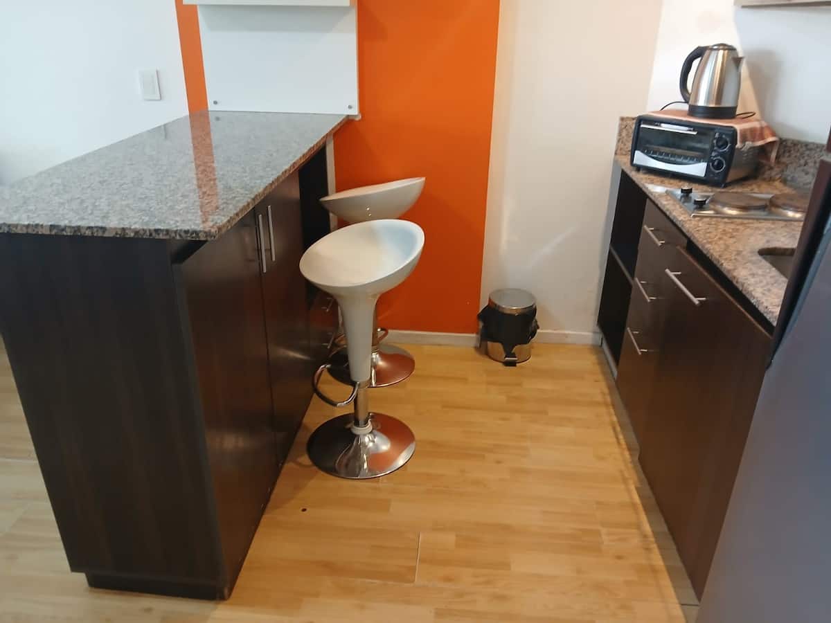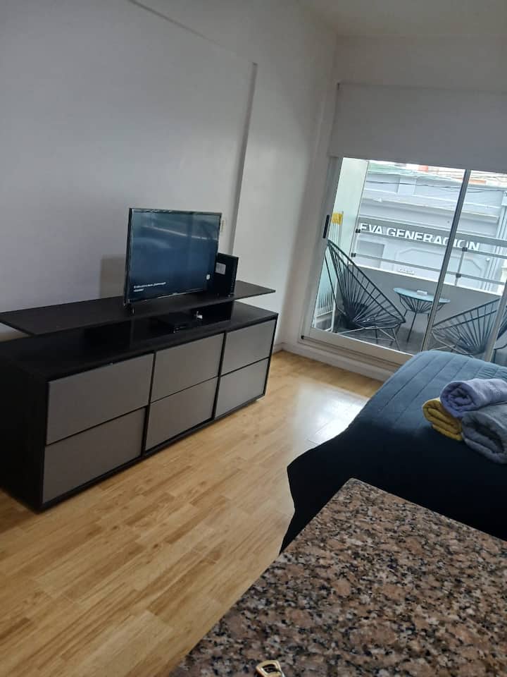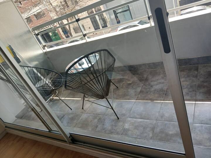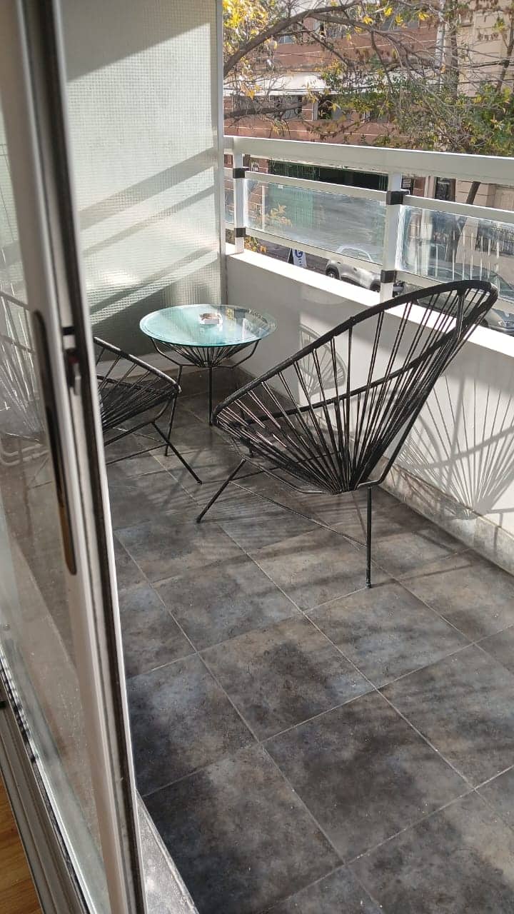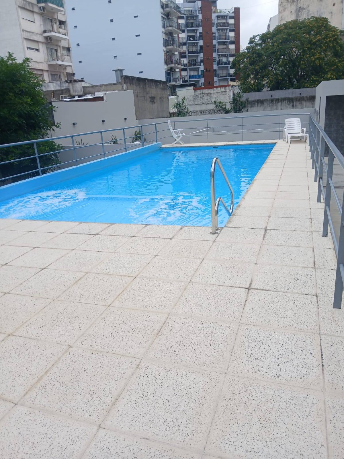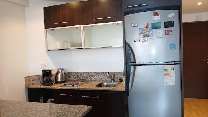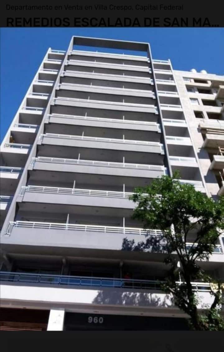 Studio apartment in Villa Crespo. Pool, gym and laundry are available by prior reservation through an online page. Laundry tokens are purchased at a nearby store, and paid parking is available in front of the Garage Caballito building.