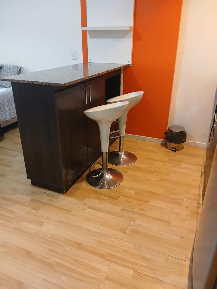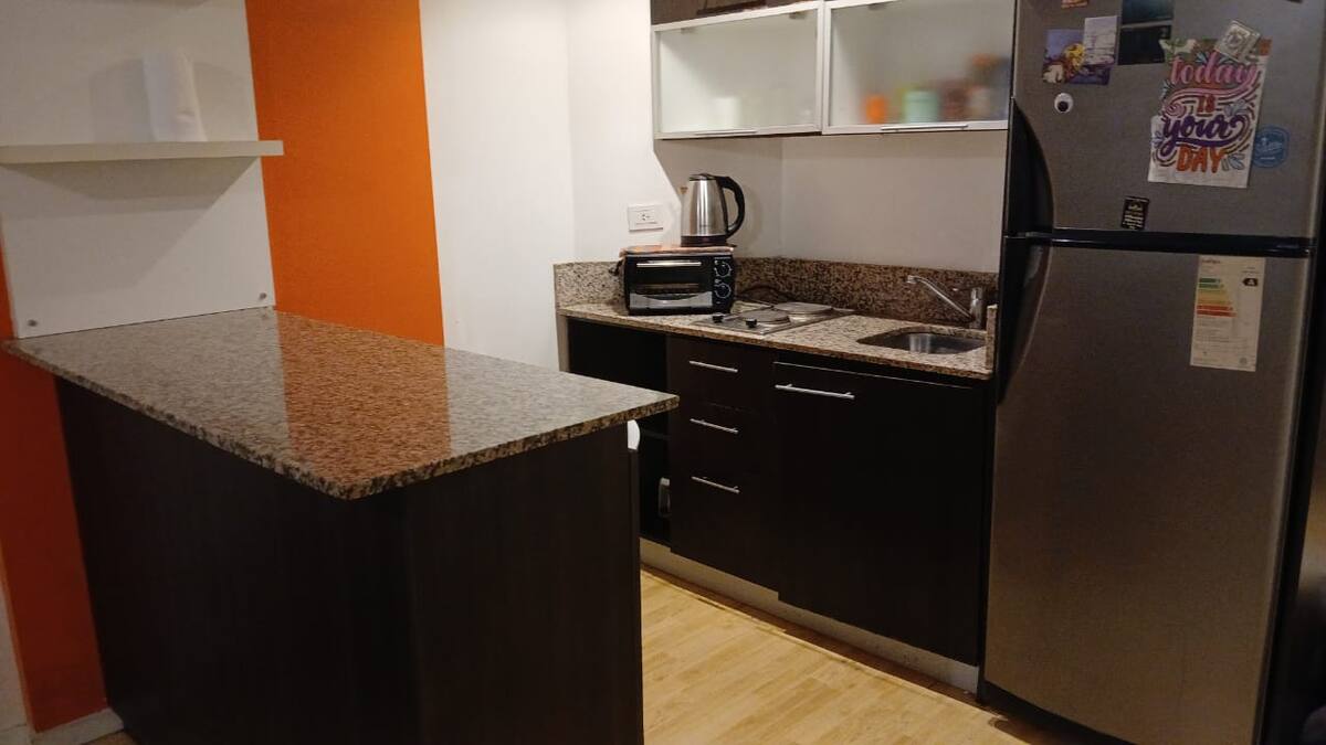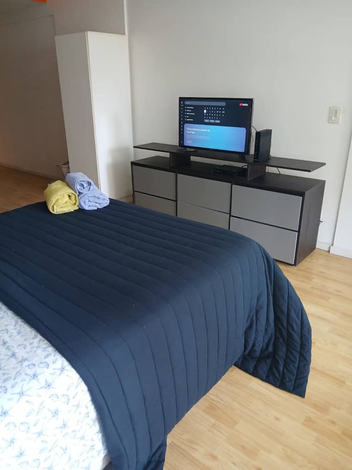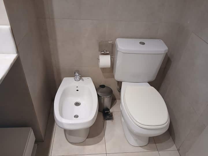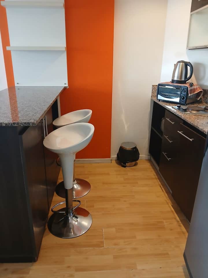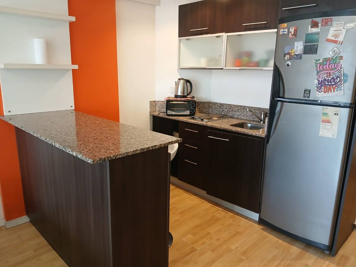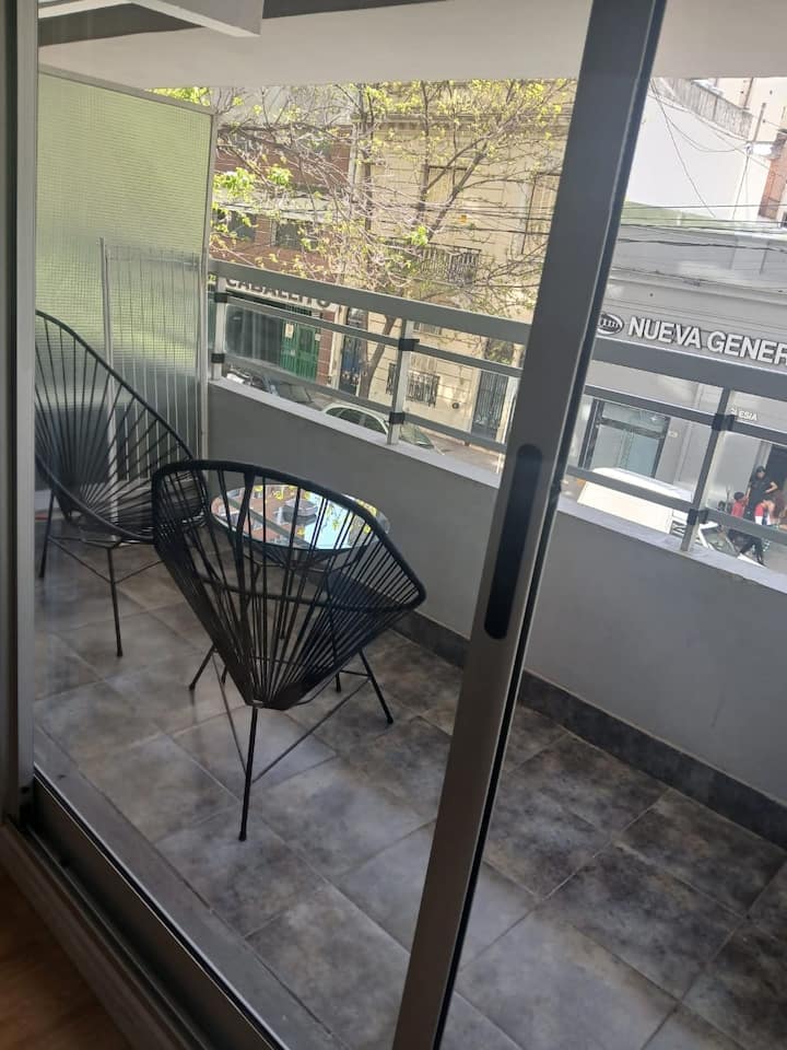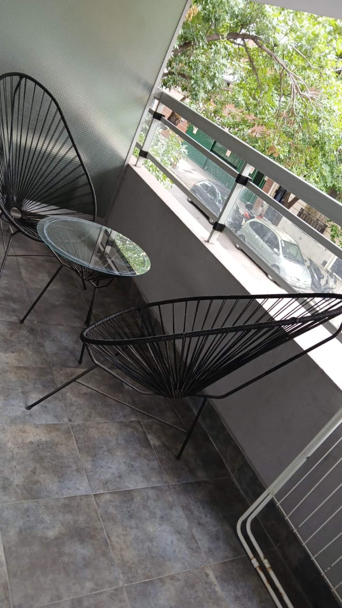 Studio apartment in Villa Crespo. Pool, gym and laundry are available by prior reservation through an online page. Laundry tokens are purchased at a nearby store, and paid parking is available in front of the Garage Caballito building.