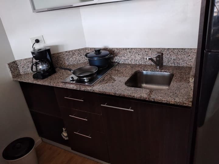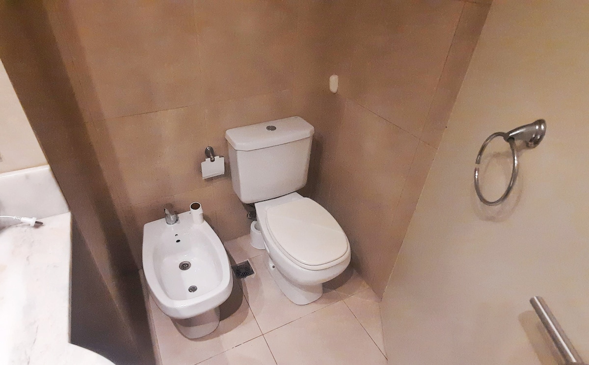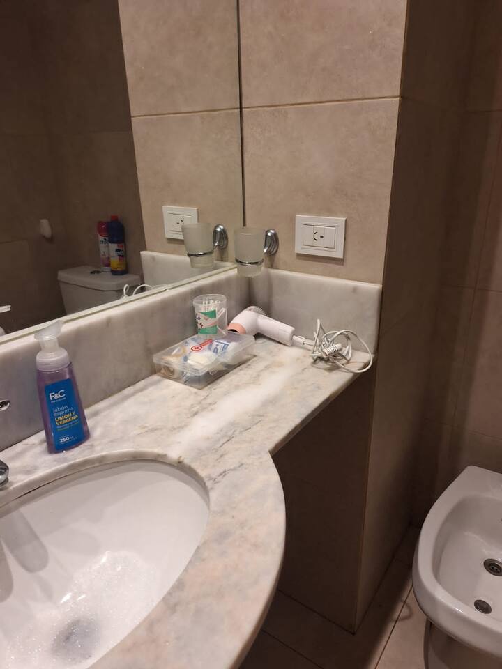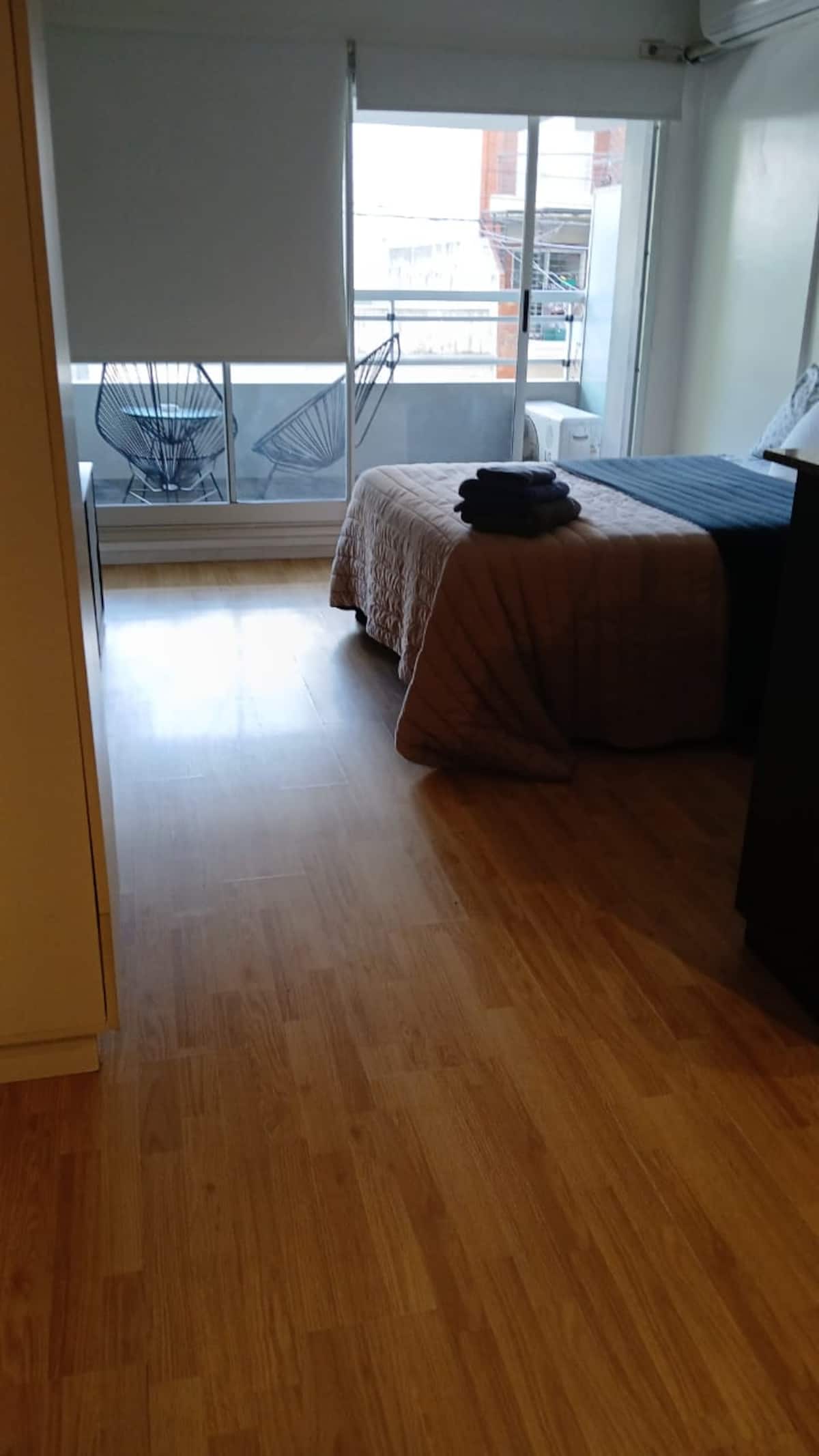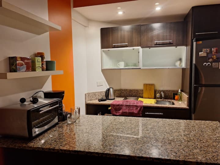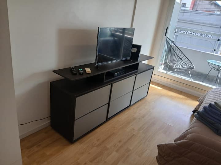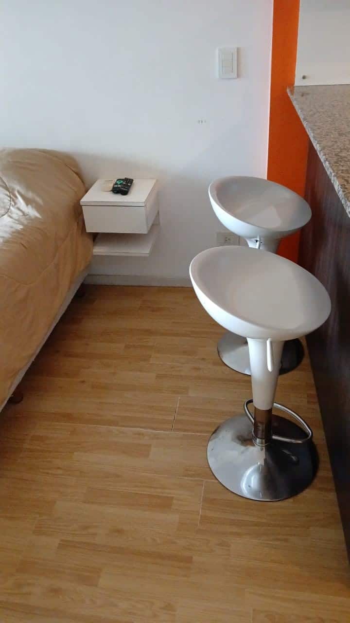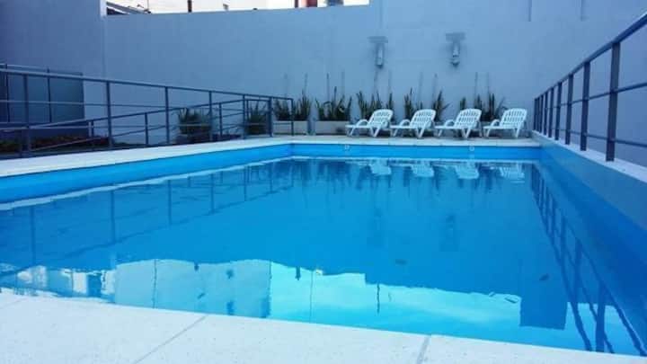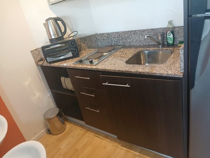 Studio apartment in Villa Crespo. Pool, gym and laundry are available by prior reservation through an online page. Laundry tokens are purchased at a nearby store, and paid parking is available in front of the Garage Caballito building.