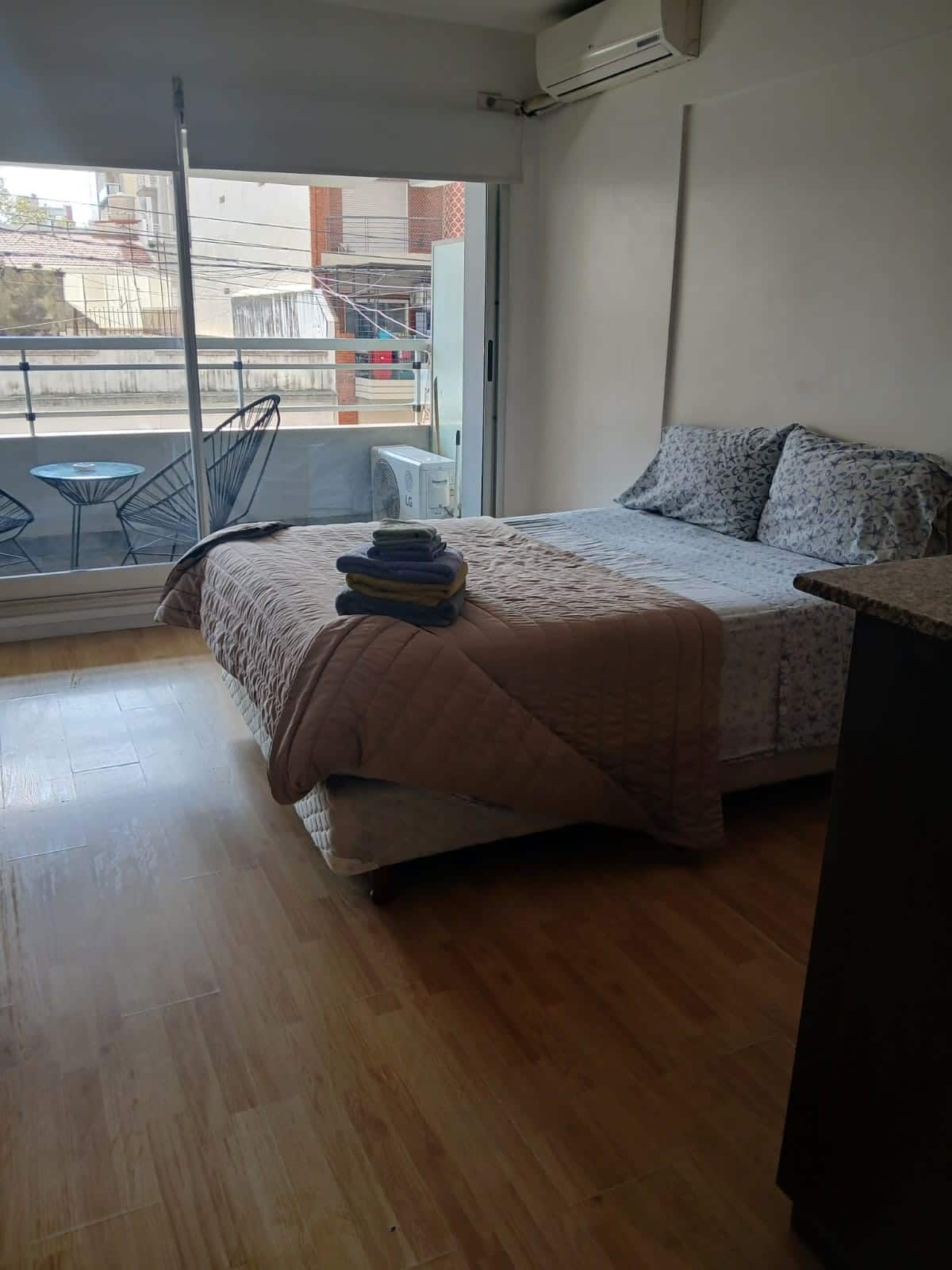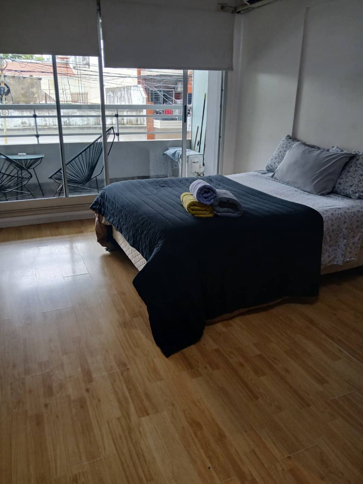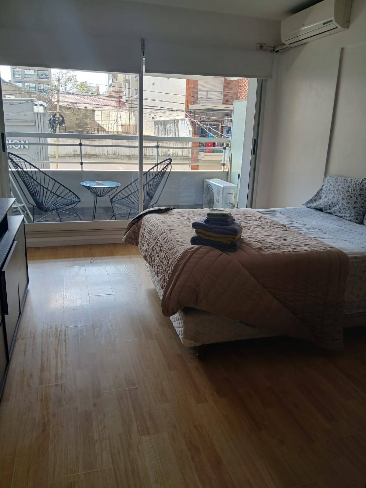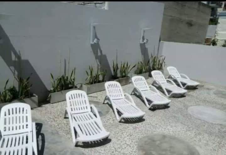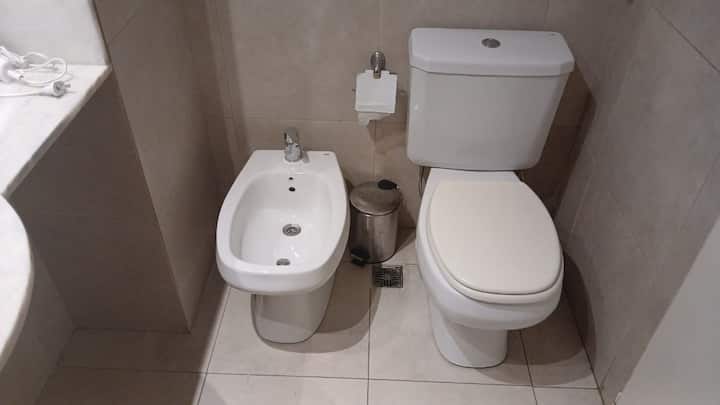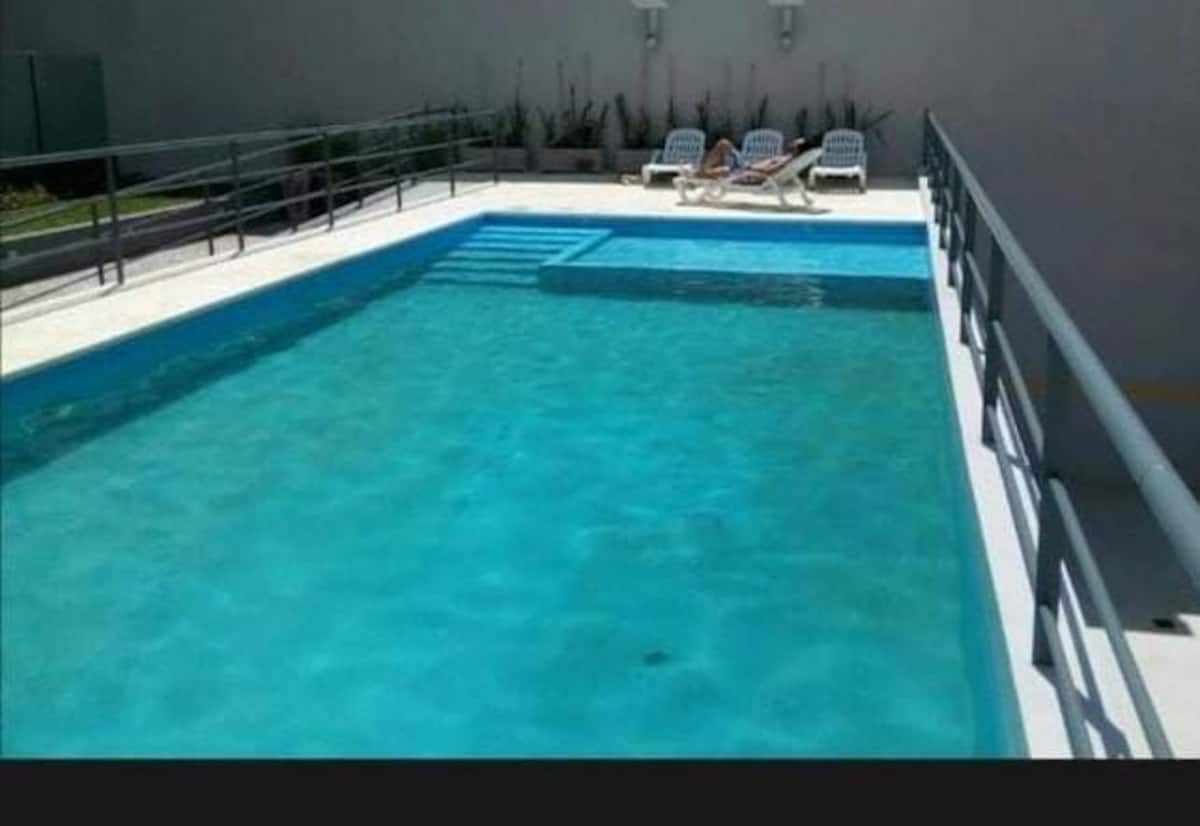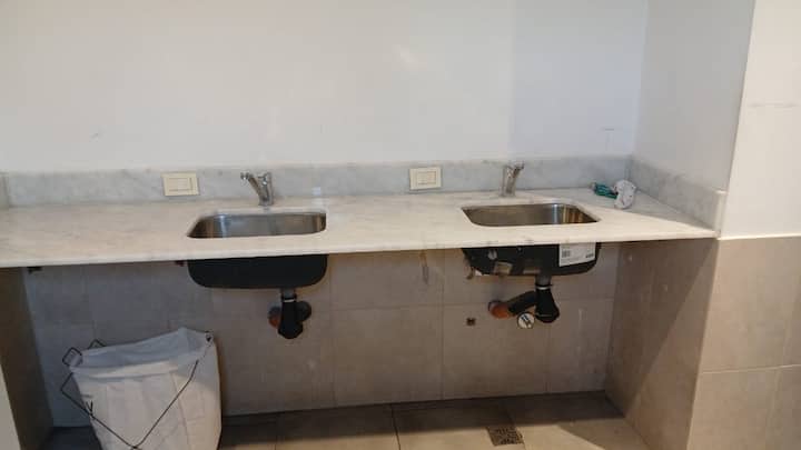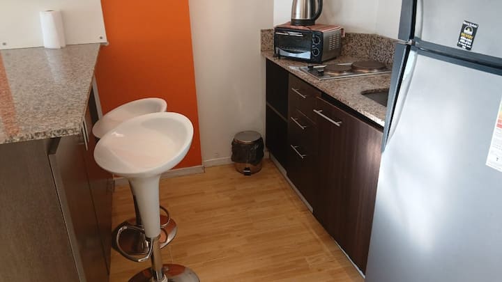 Studio apartment in Villa Crespo. Pool, gym and laundry are available by prior reservation through an online page. Laundry tokens are purchased at a nearby store, and paid parking is available in front of the Garage Caballito building.