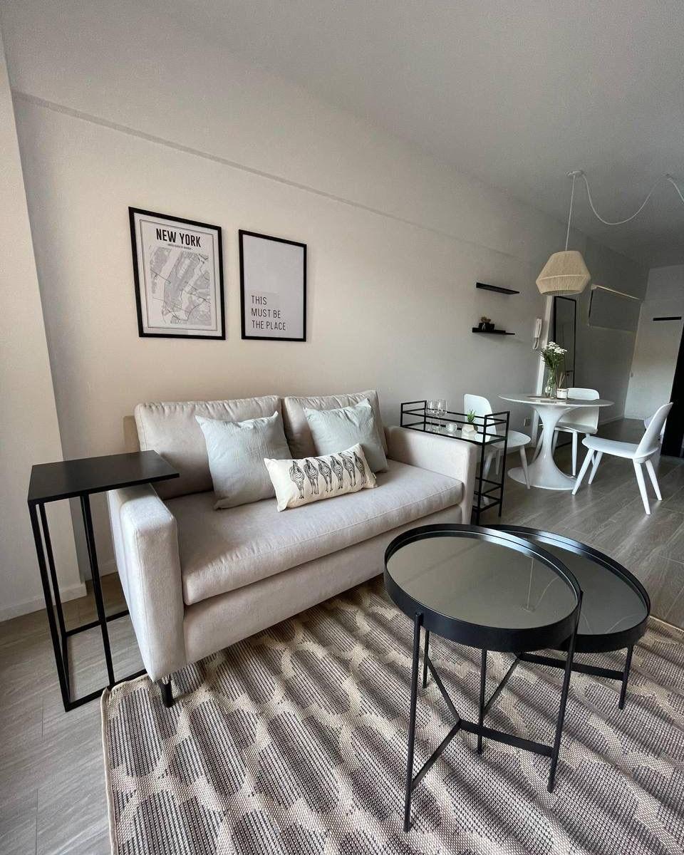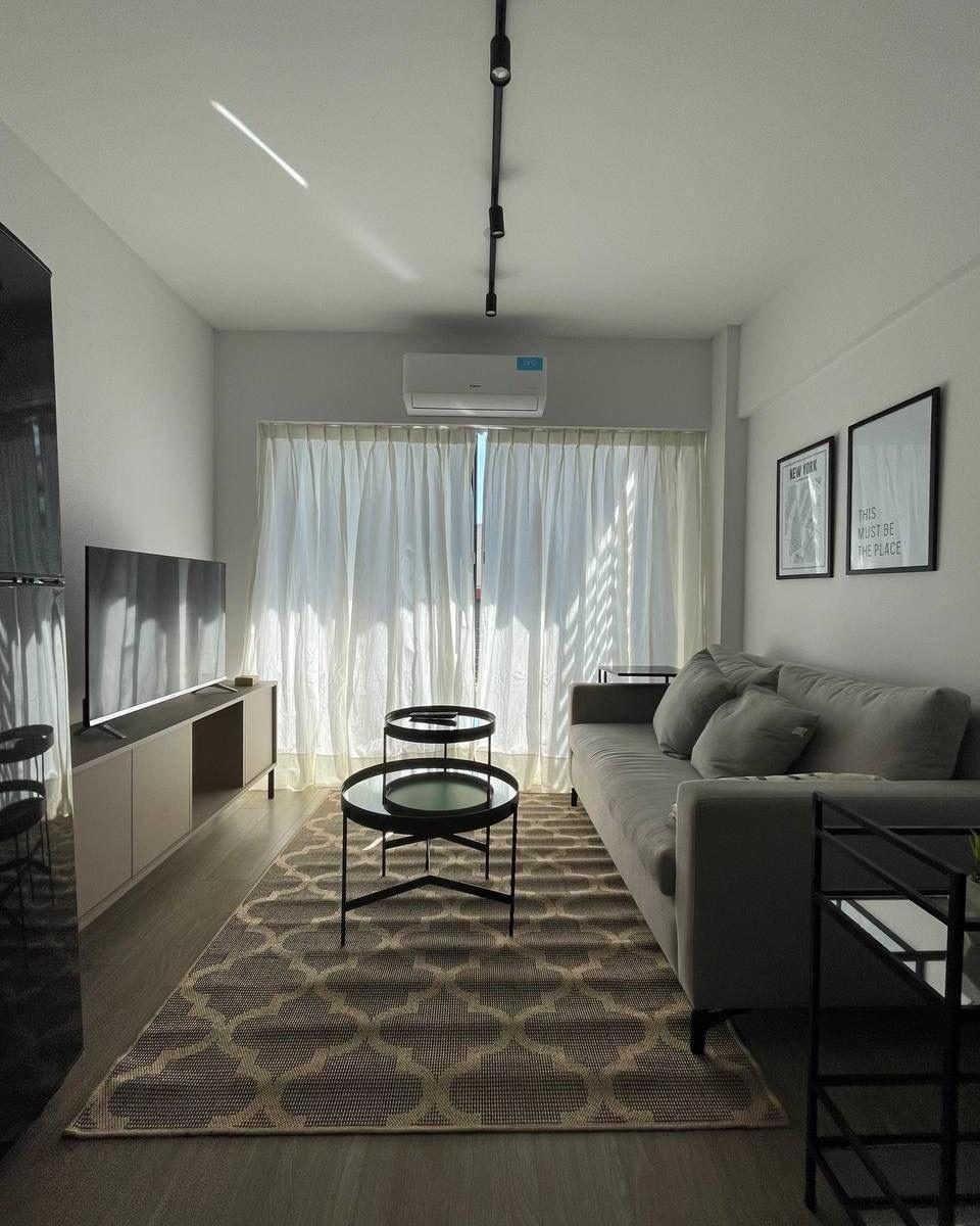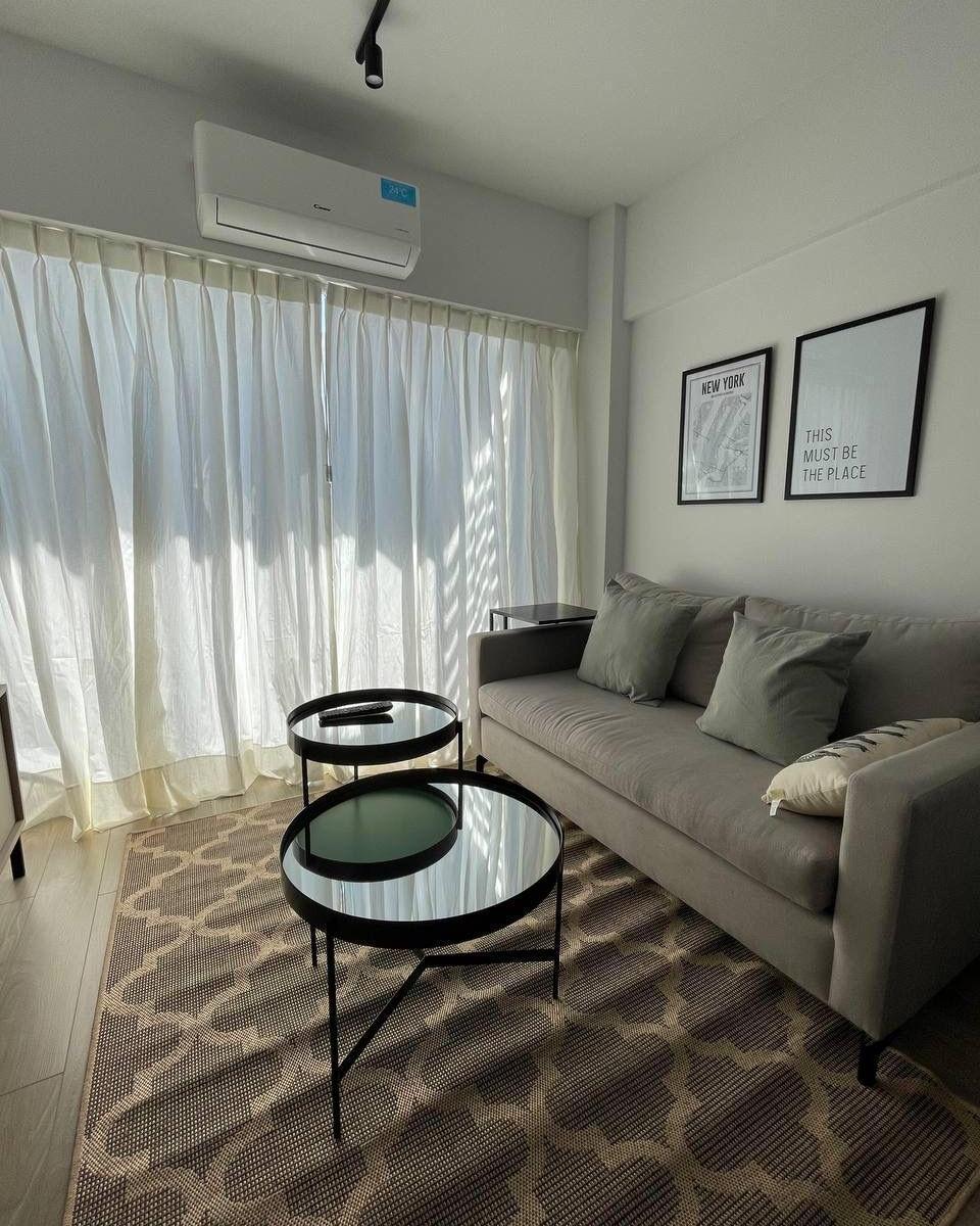 Furnished one-bedroom apartment in Villa Crespo, on the first floor and with a balcony. The living-dining room has a two-piece sofa, a low table and cable TV. The equipped kitchen includes plates, a fridge with freezer, an electric oven and a table for 3, and there is a full bathroom with a bathtub. The building is described as new and has key-access entry, a pool, a solarium and a laundry. The rent includes all services except electricity.