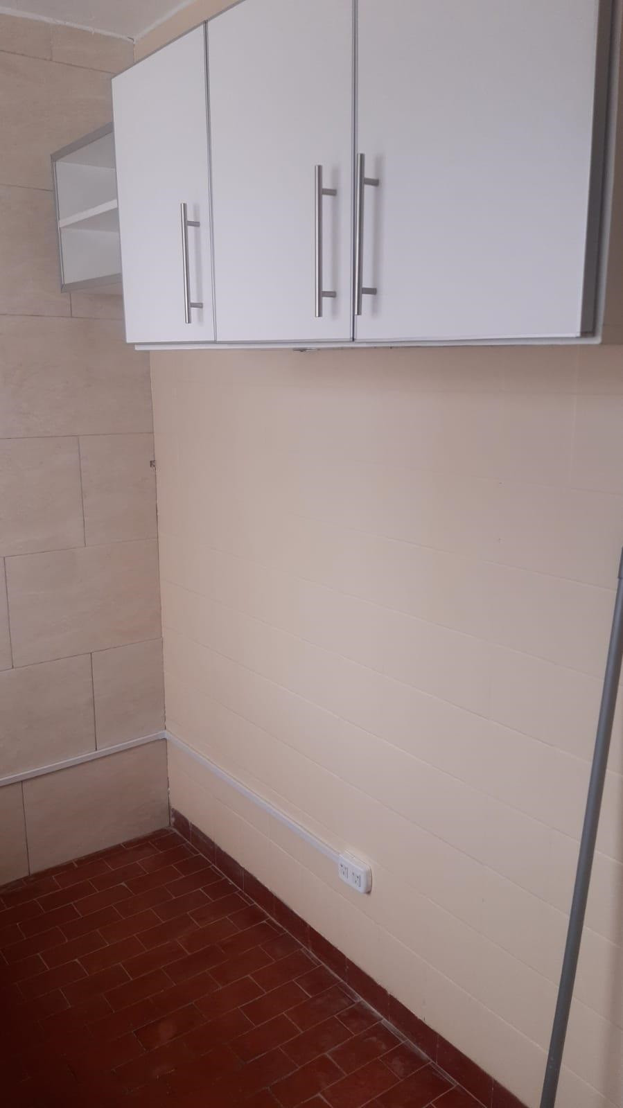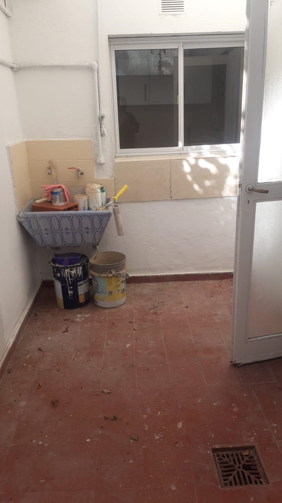 Two-room apartment in Villa del Parque on the ground floor, courtyard-facing (contrafrente) with two uncovered patios. It has a living area, kitchen with built-in cabinets and overhead cupboards, a shower bathroom, and a bedroom with a closet. Includes a laundry sink and an awning for a washing machine. Rental requires a rental guarantee bond and states no pets; suitable for 1 or 2 adults.
