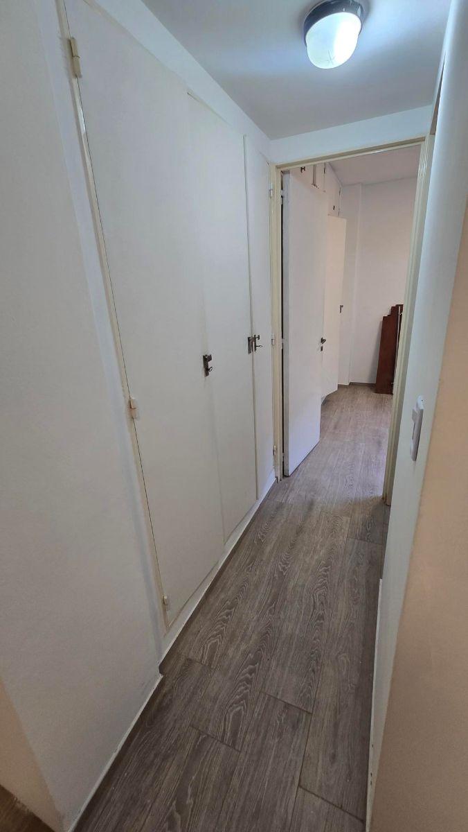 Two-room apartment facing the courtyard (contrafrente), with a living room and a separate kitchen. There is a hallway with a built-in storage cabinet, a full bathroom, and a bedroom with a built-in storage cabinet. Dimensions listed in the listing are approximate.