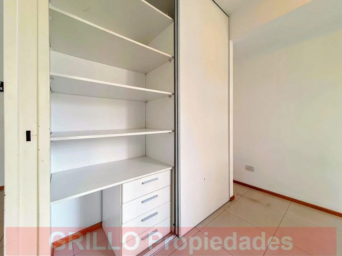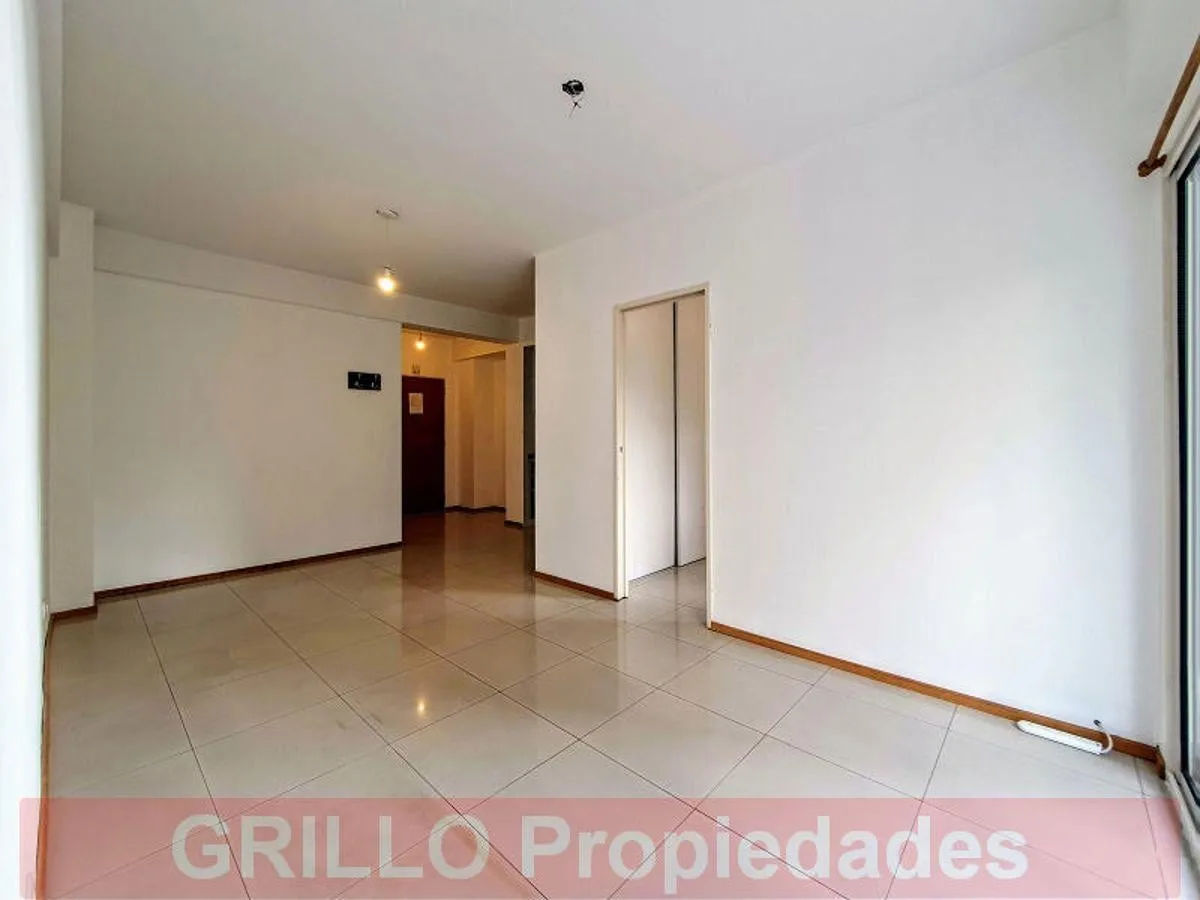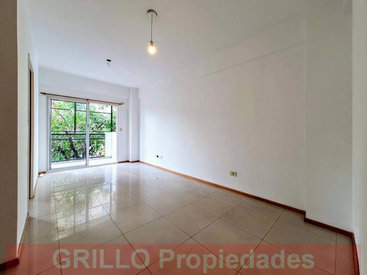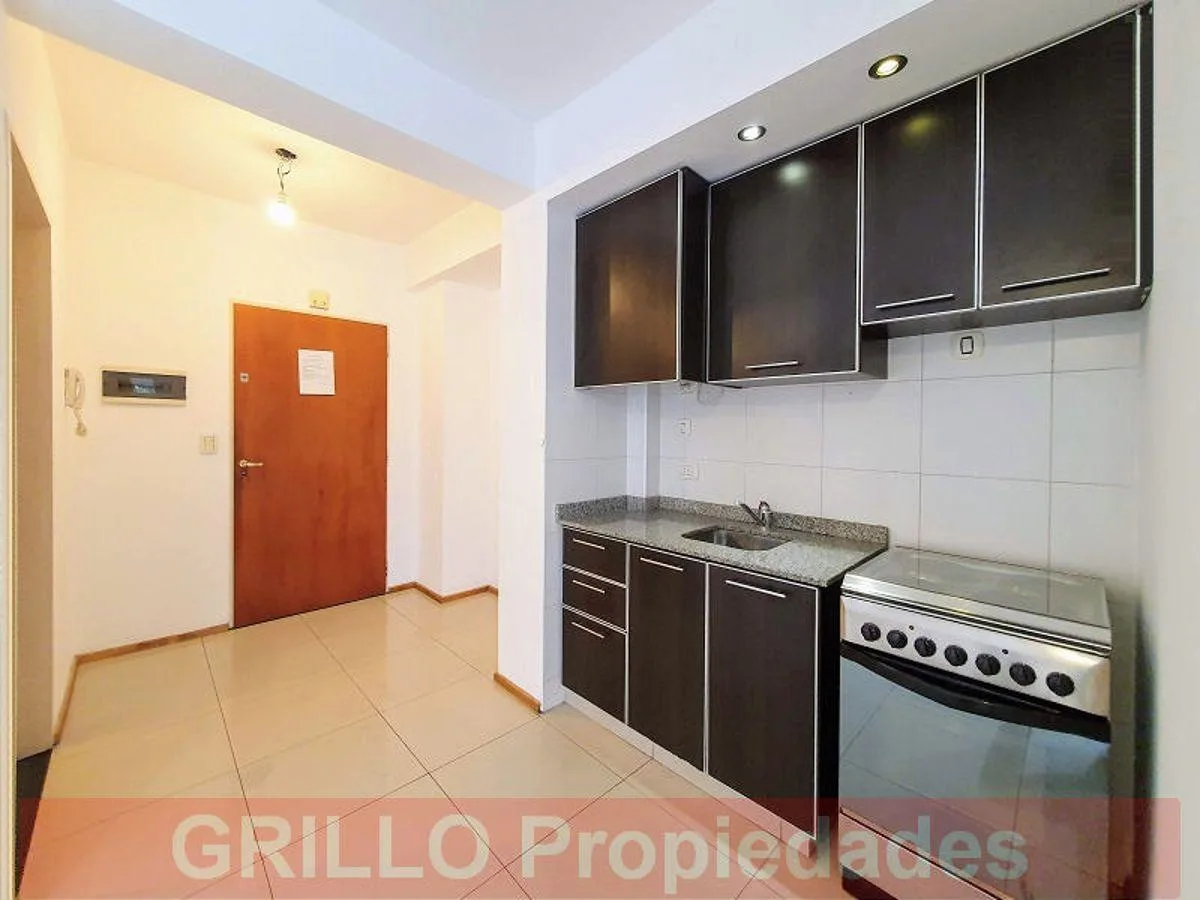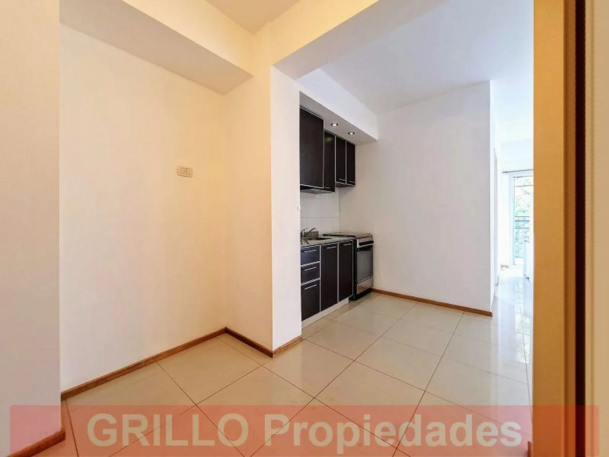 Two-room apartment of 43 m² (37 m² covered and 6 m² balcony) on the front side. Includes built-in wardrobes, living-dining room at the front, bedroom at the front, a full bathroom with a bathtub, and porcelain tile flooring. Kitchen area has an electric water heater (termotanque) and an electric cooking appliance; the balcony has iron mesh safety enclosure and is set up for installing a washer. There is a dedicated space for a home office at the entrance (1.18 x 0.68 m). Building is 9 storeys, w
