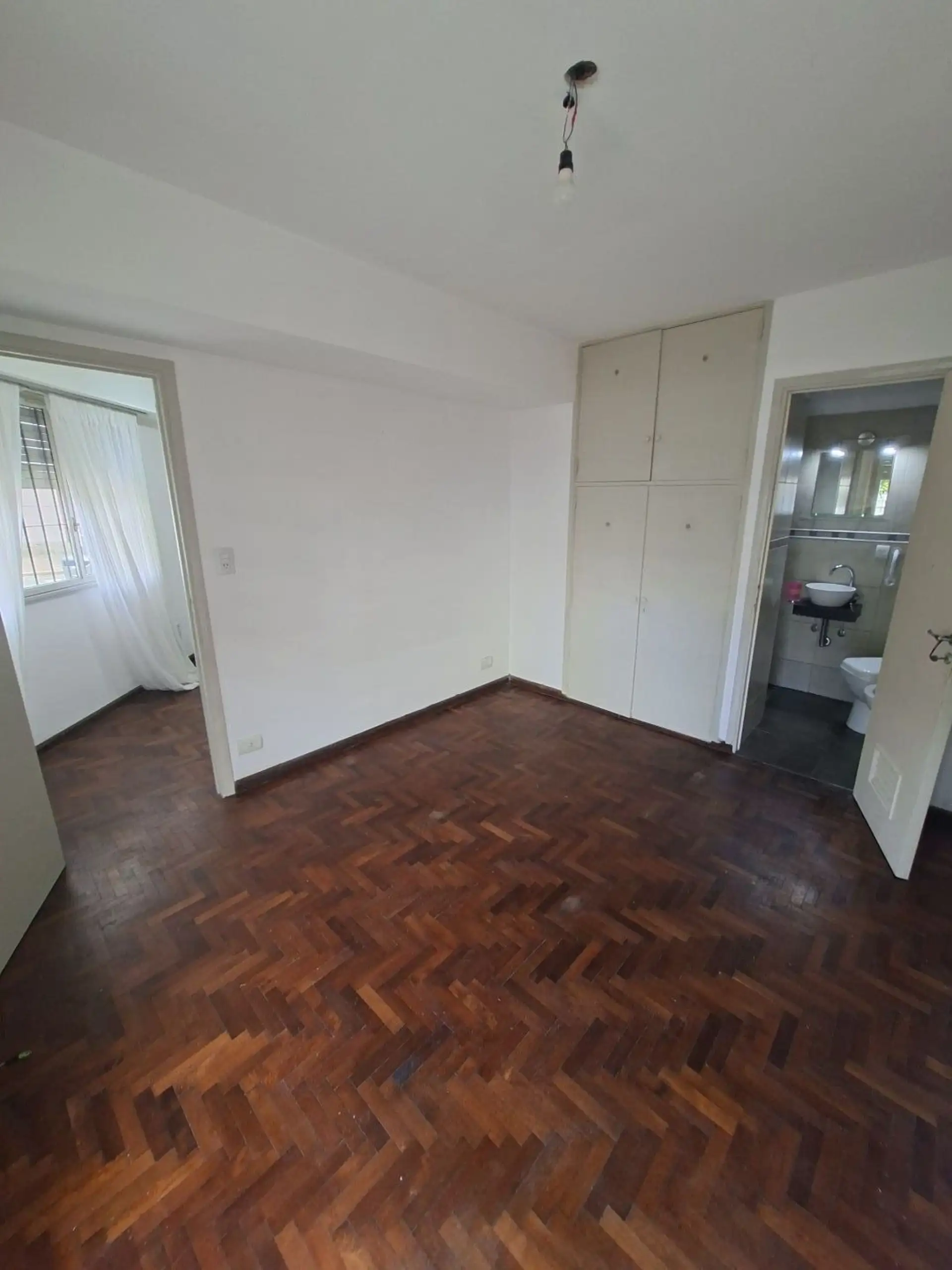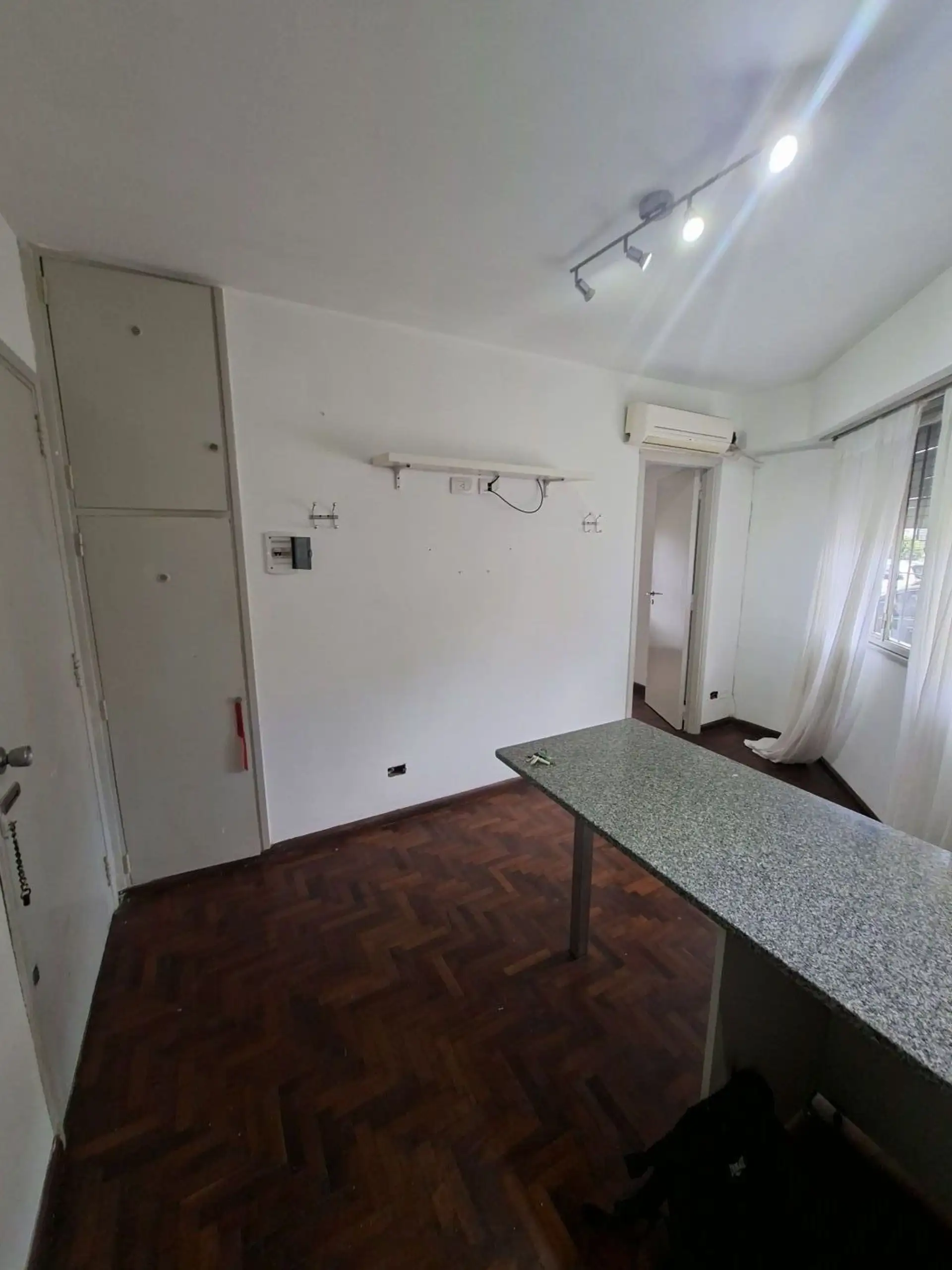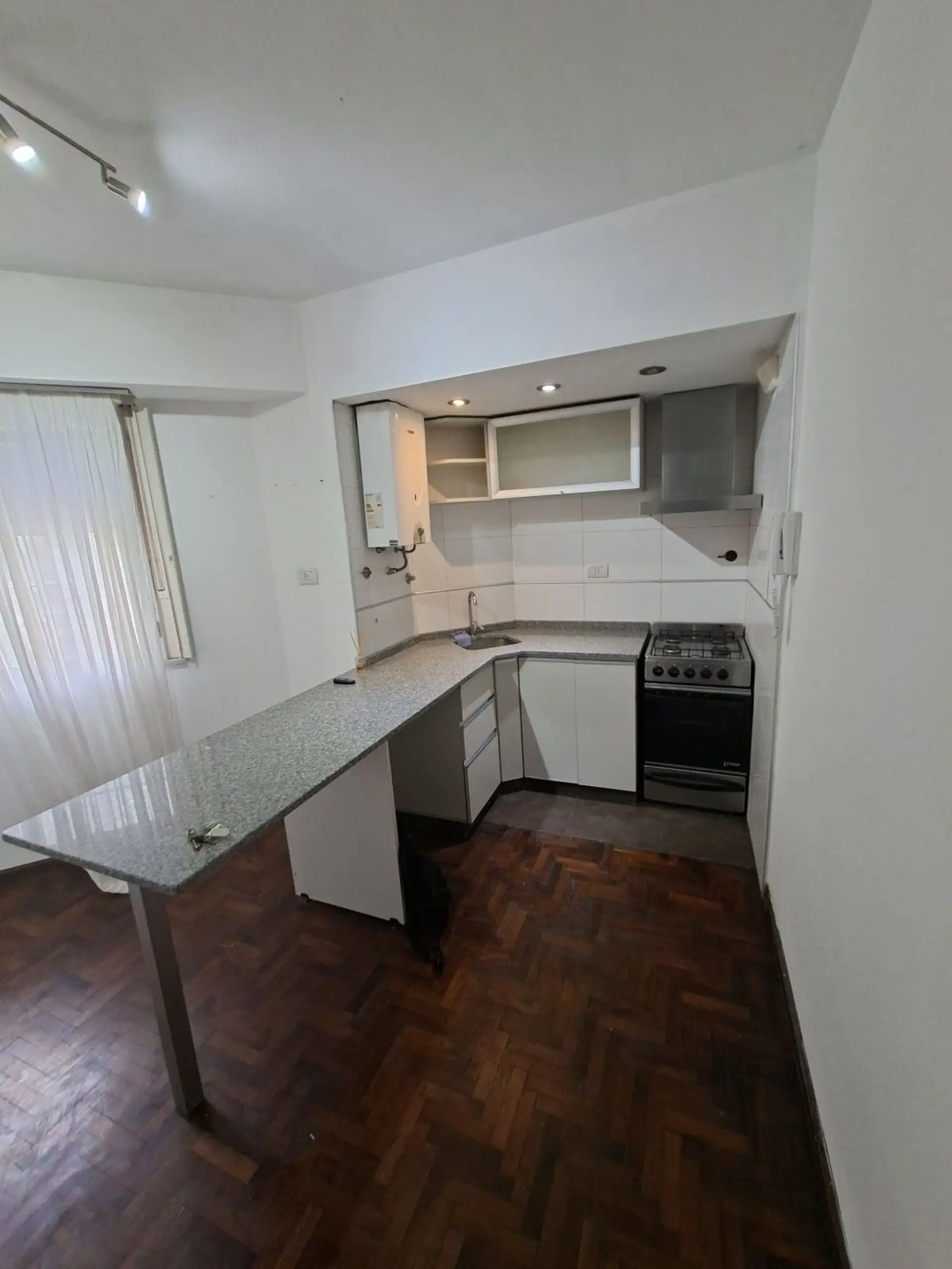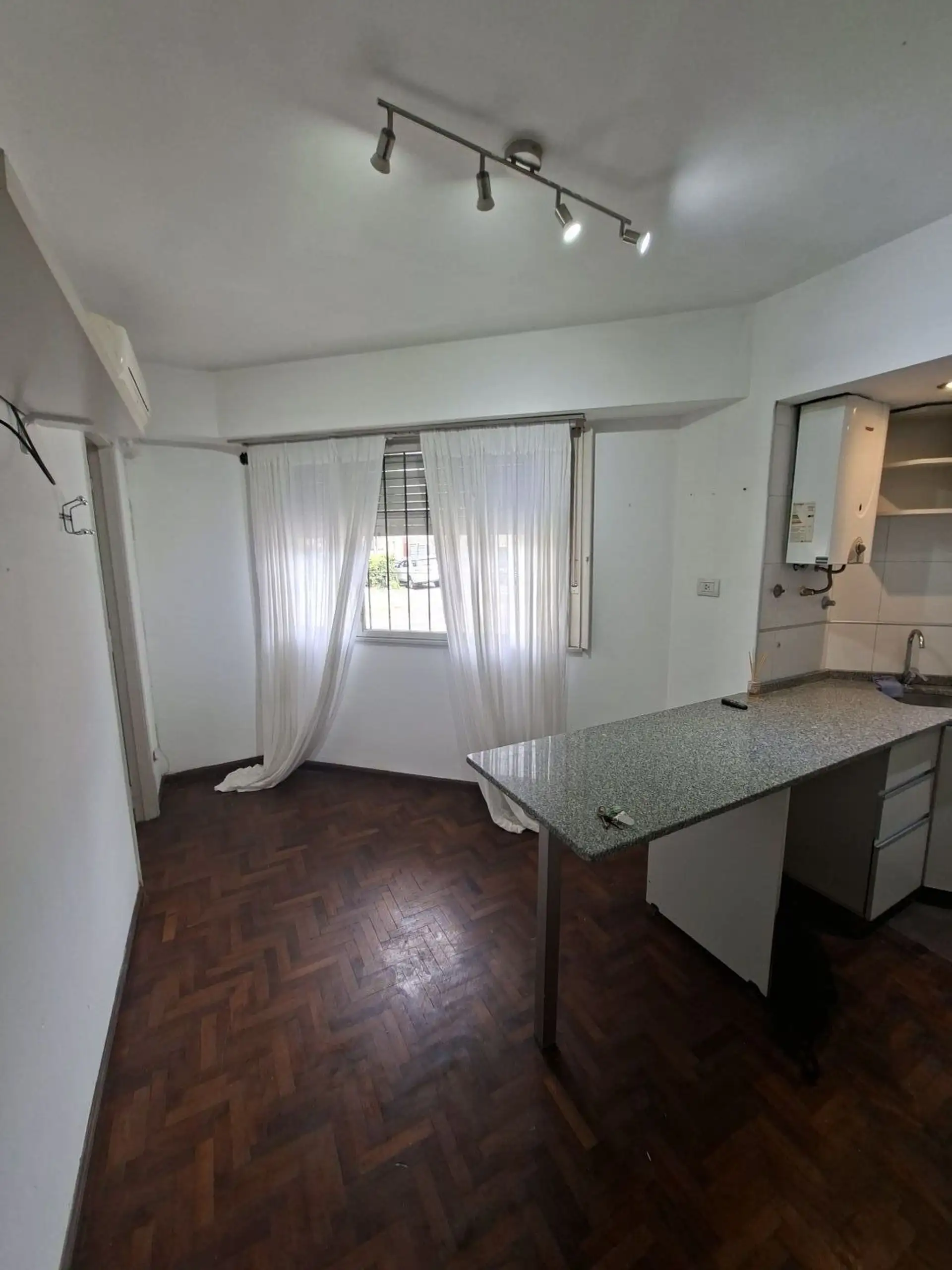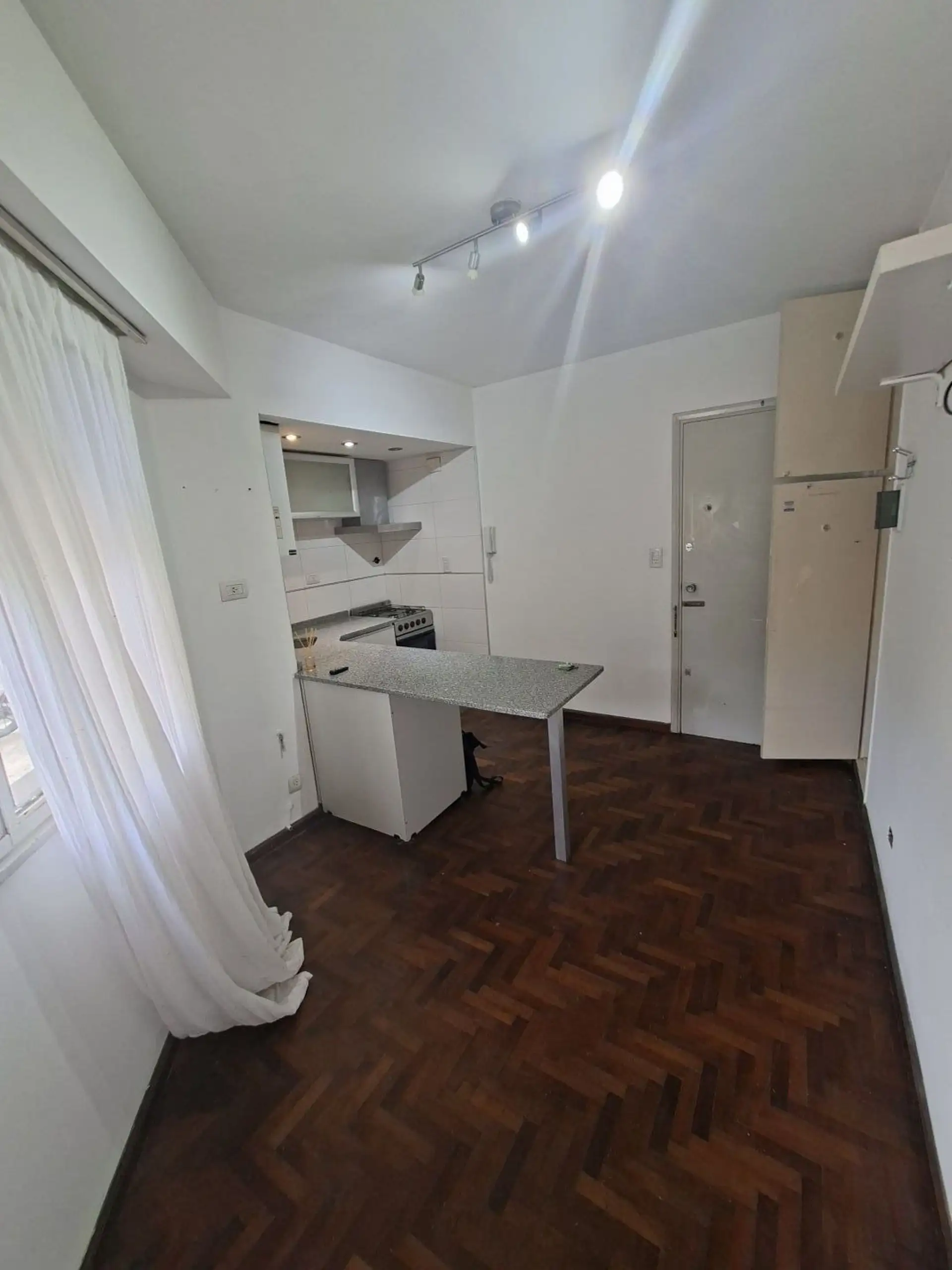 Studio apartment with 1.5 rooms in Villa Devoto, ground-floor unit street-facing. Refurbished “to new”. Living-dining room with a small window facing the corner (ochava), with the kitchen integrated via a breakfast bar and complete modern cabinetry, including space under the counter for a refrigerator. En-suite bedroom area with parquet floors and a built-in wardrobe, plus a modern bathroom with shower and glass partition.