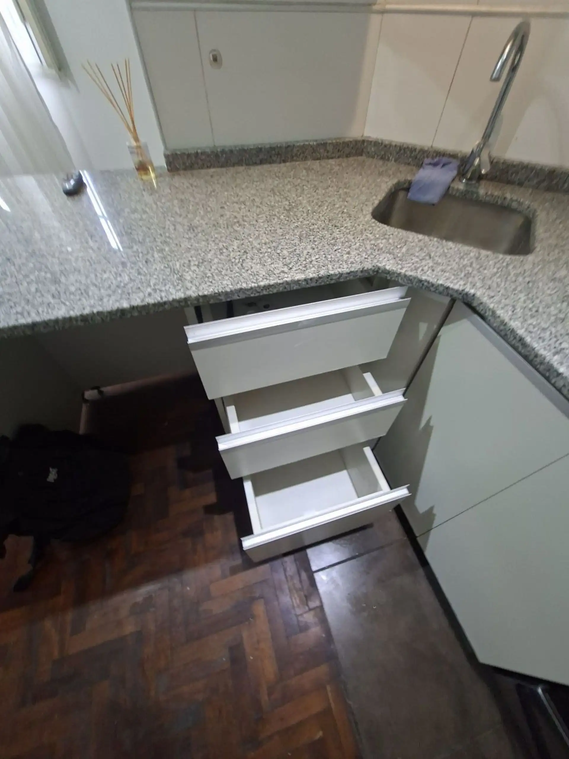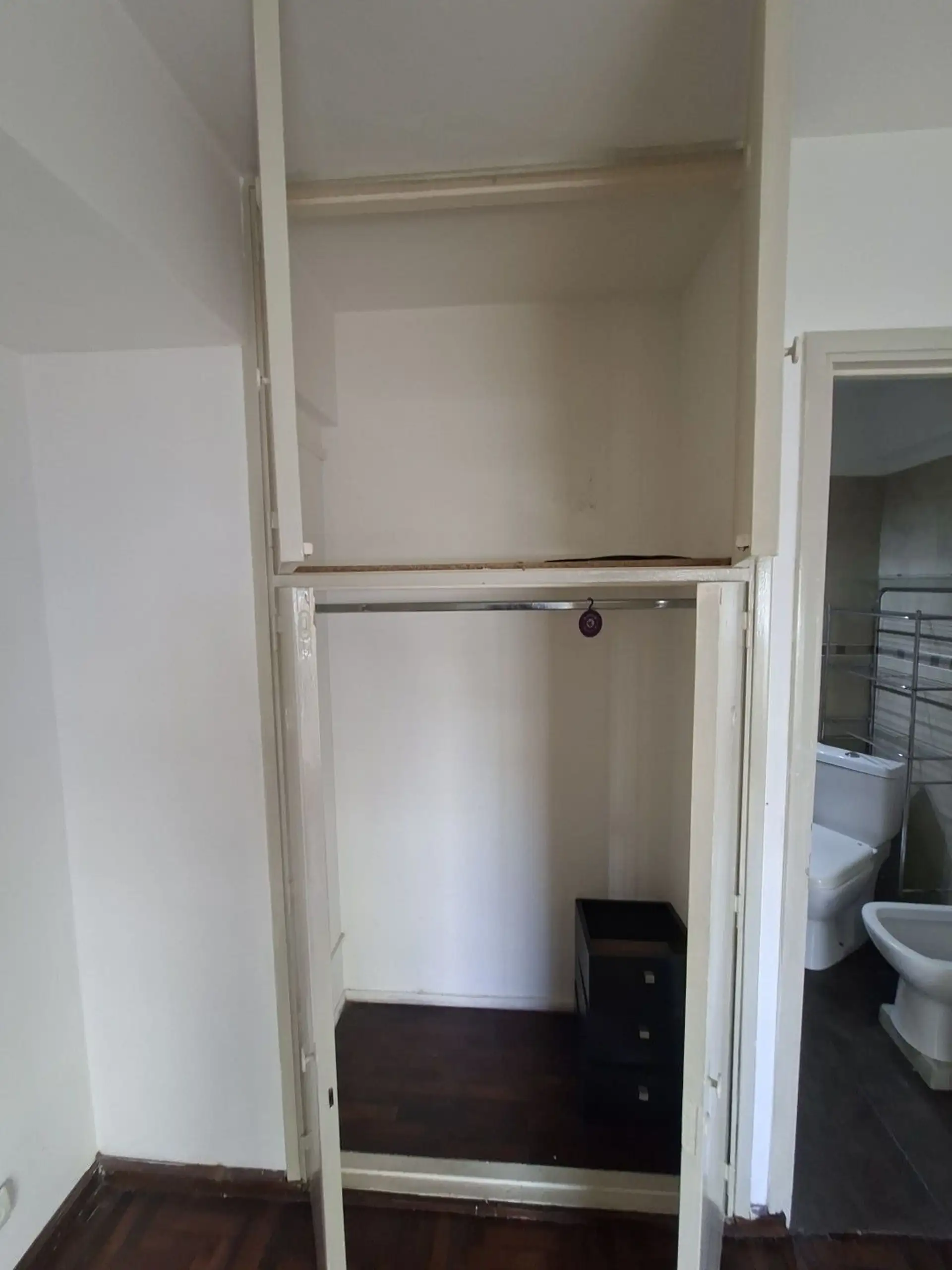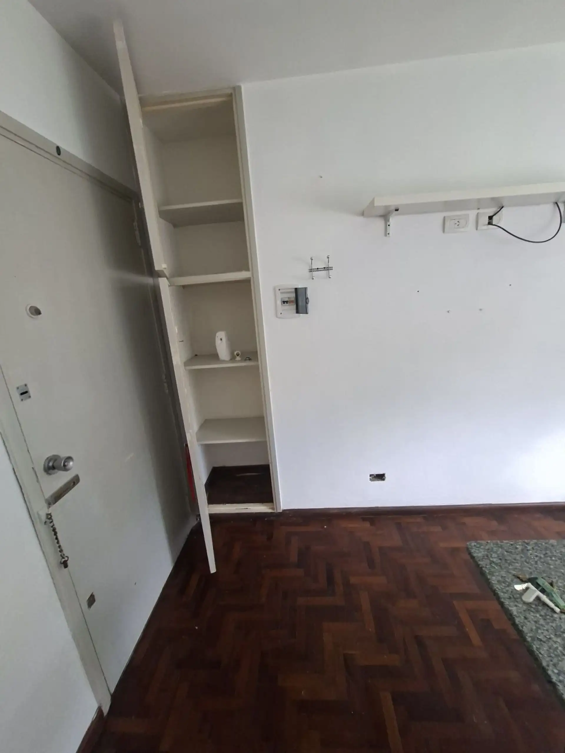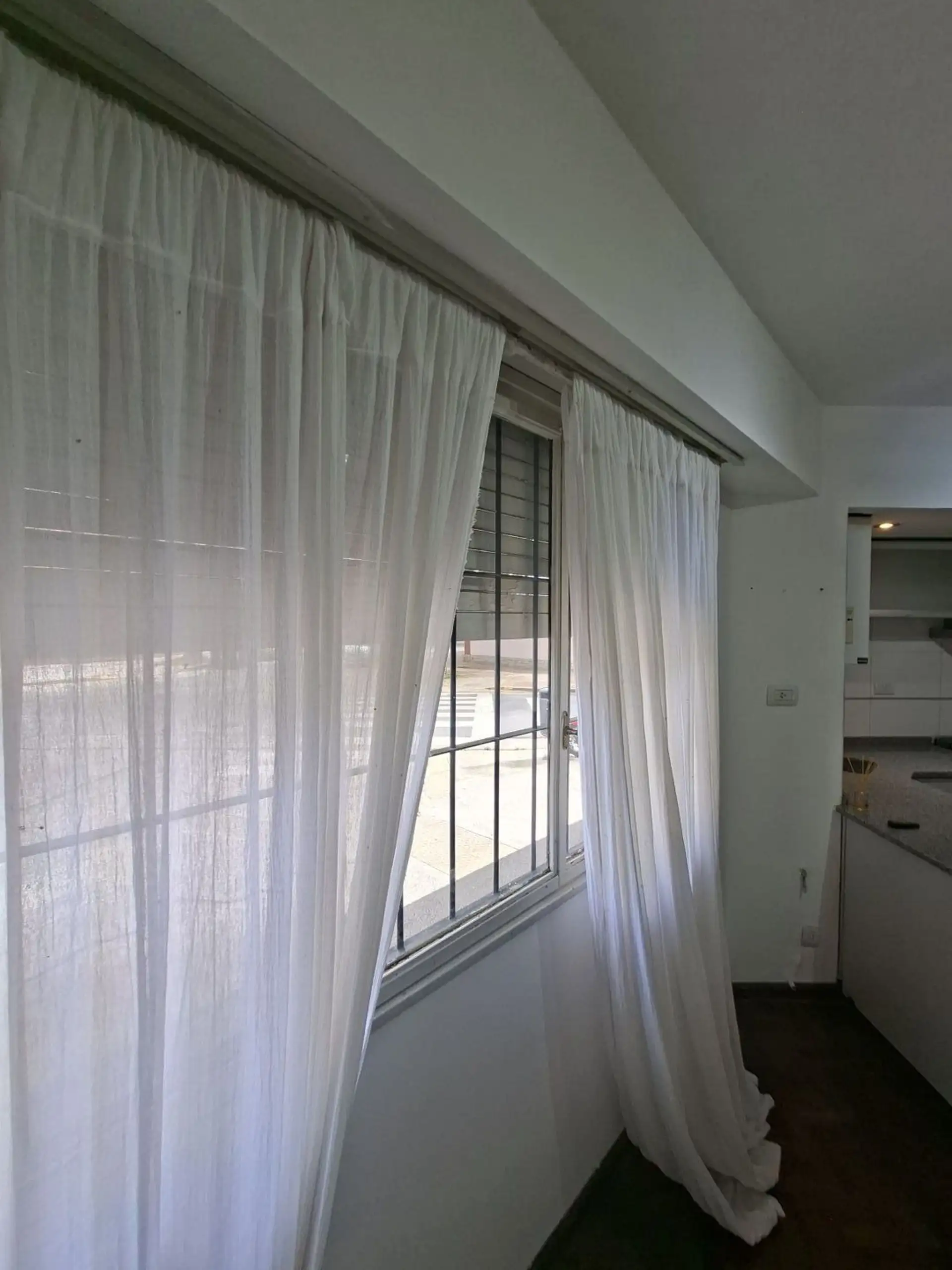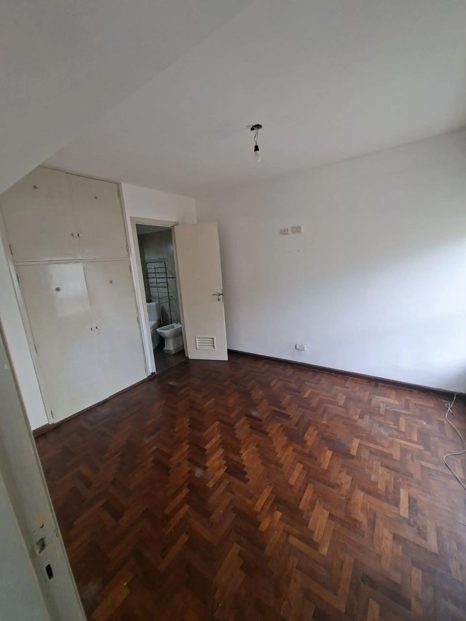 Studio apartment with 1.5 rooms in Villa Devoto, ground-floor unit street-facing. Refurbished “to new”. Living-dining room with a small window facing the corner (ochava), with the kitchen integrated via a breakfast bar and complete modern cabinetry, including space under the counter for a refrigerator. En-suite bedroom area with parquet floors and a built-in wardrobe, plus a modern bathroom with shower and glass partition.