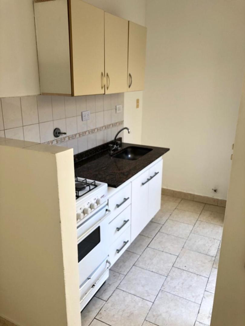 Two-room apartment in Villa Pueyrredón, ground-floor unit street-facing. Access is via a covered side corridor. The living room is 4 x 3 with a window to the street, and the bedroom is 3 x 3 with a built-in wardrobe. The separate kitchen measures 2.50 x 1.60, with a full bathroom and an approximately 5 x 2 patio. General condition is described as good, with the need for general painting.