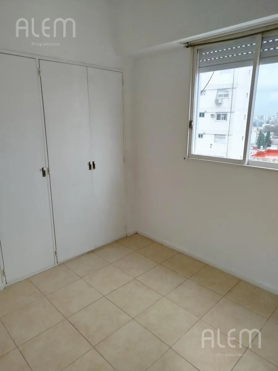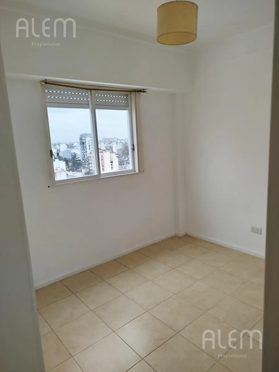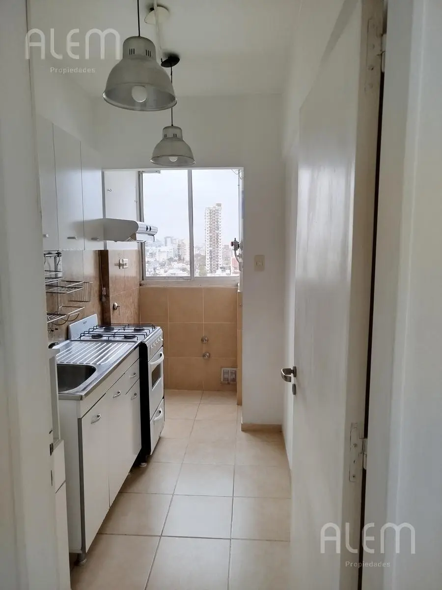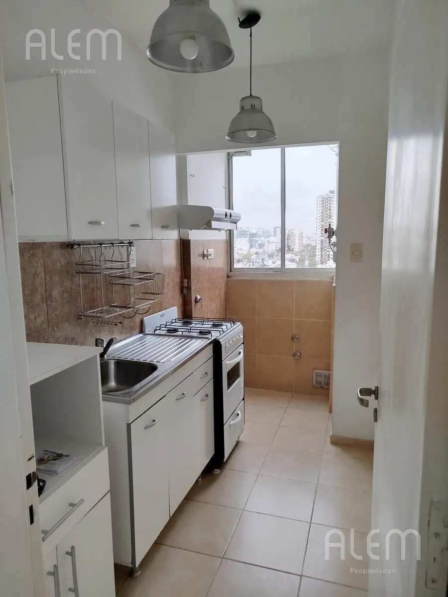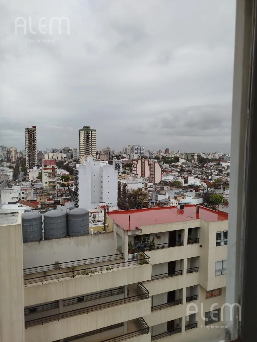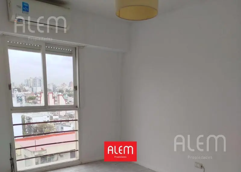 Two-room apartment on the 12th floor in Villa General Mitre with open views. It has a large, bright kitchen with an exterior window and natural gas plus an individual water heater, and a laundry area next to the kitchen with space for a washing machine and an overhead clothes-drying rack with natural ventilation. The living-dining room has a large window and central air conditioning (heating and cooling), and the bedroom includes a built-in floor-to-ceiling wardrobe with three doors and an exter