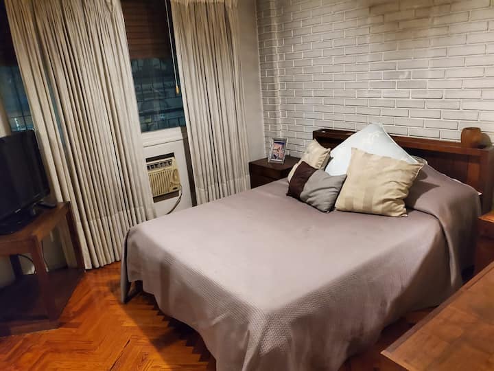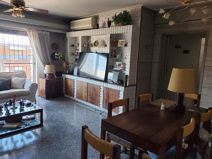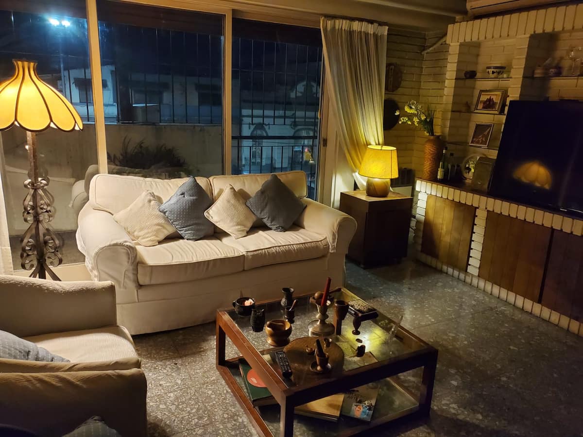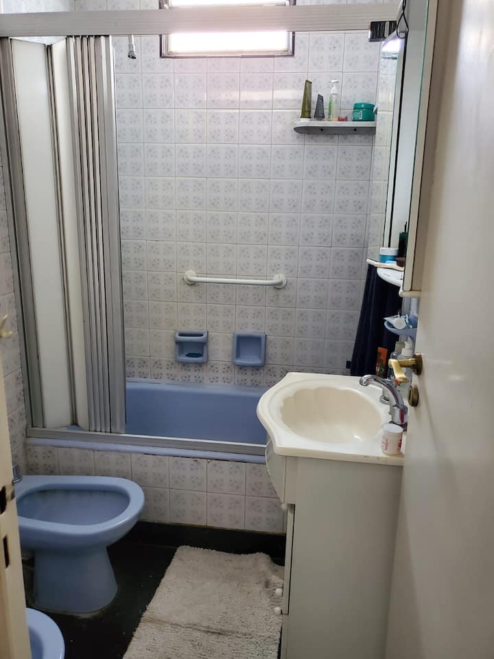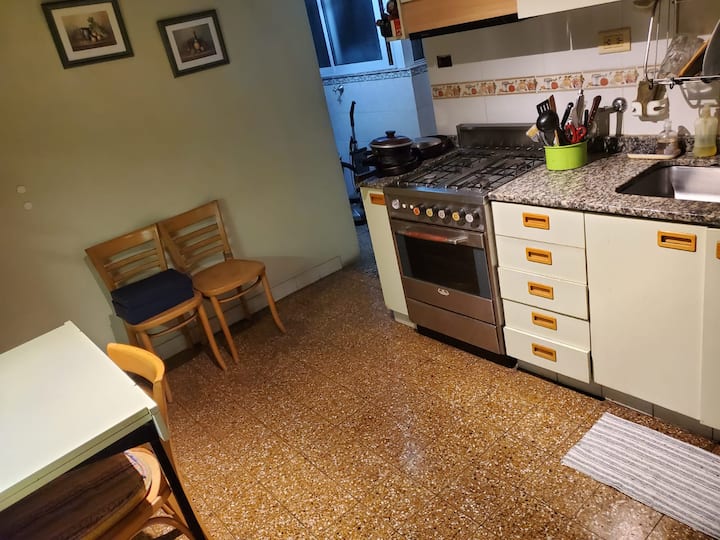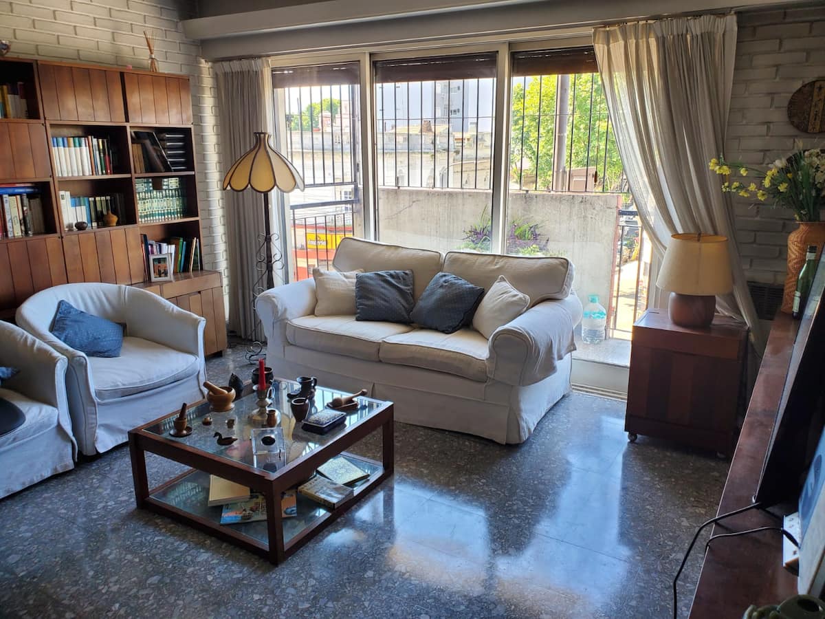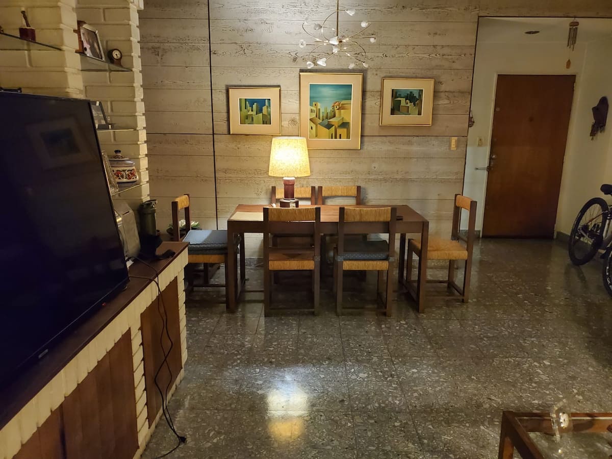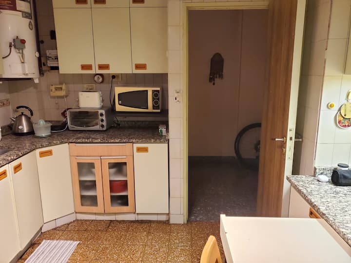 Shared apartment room in Villa General Mitre on the second floor. The unit includes 1 bedroom, a living room, terrace, dining room for guests’ exclusive use, 2 bathrooms and a large kitchen. There is a large balcony, a small minibar available and fans in all rooms, with cameras at entry and exit doors; identity and proof of occupancy are required.