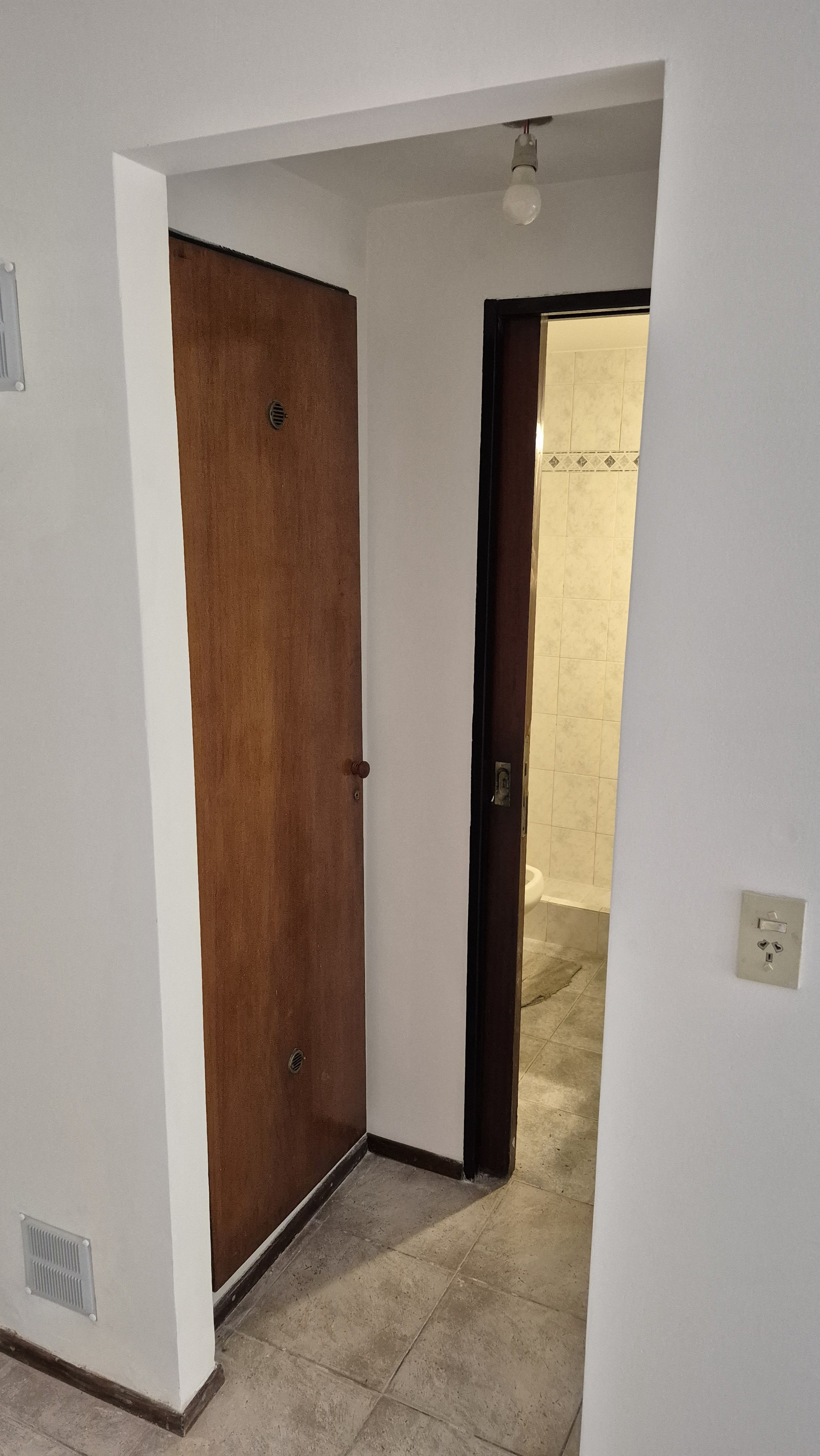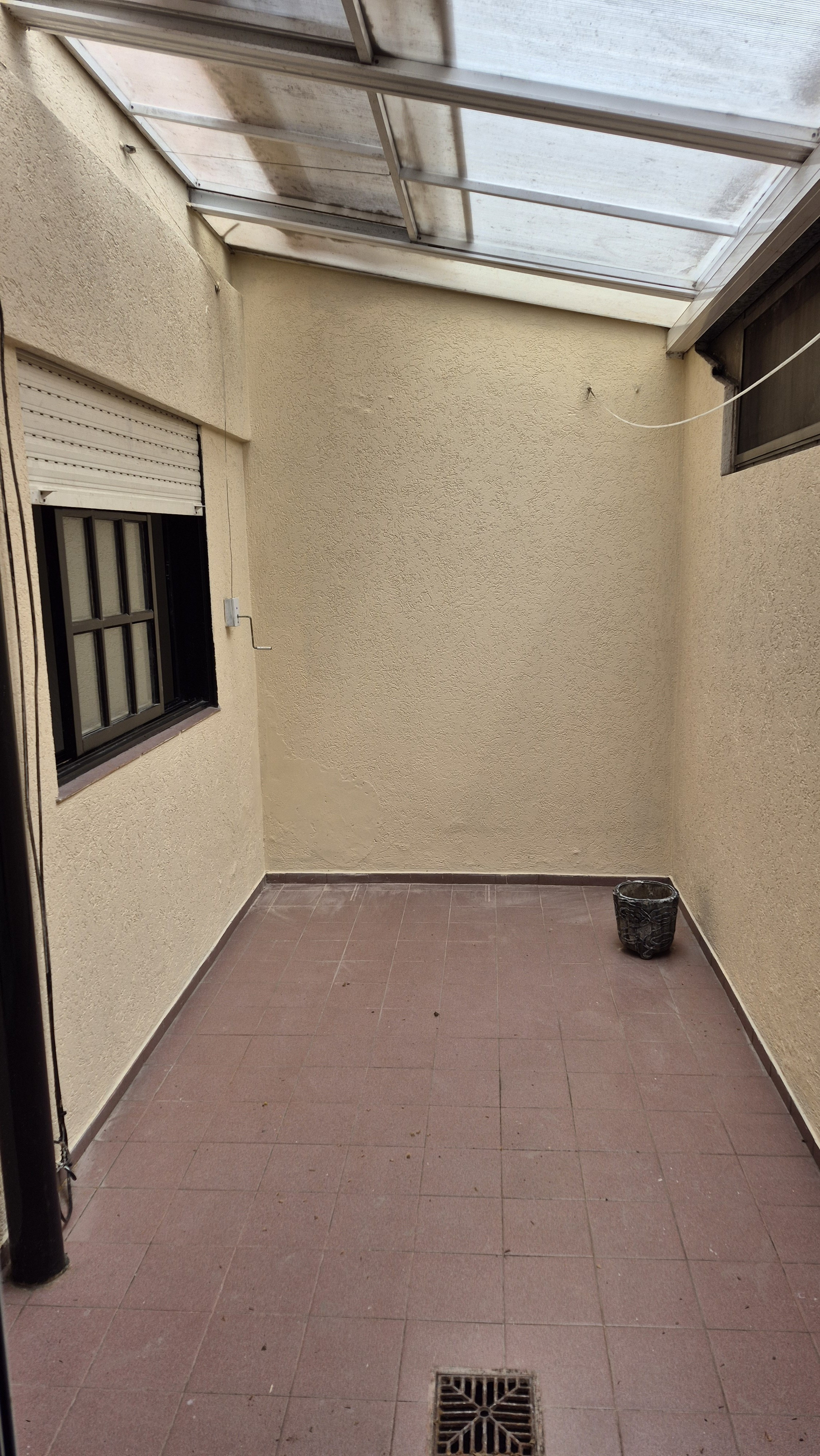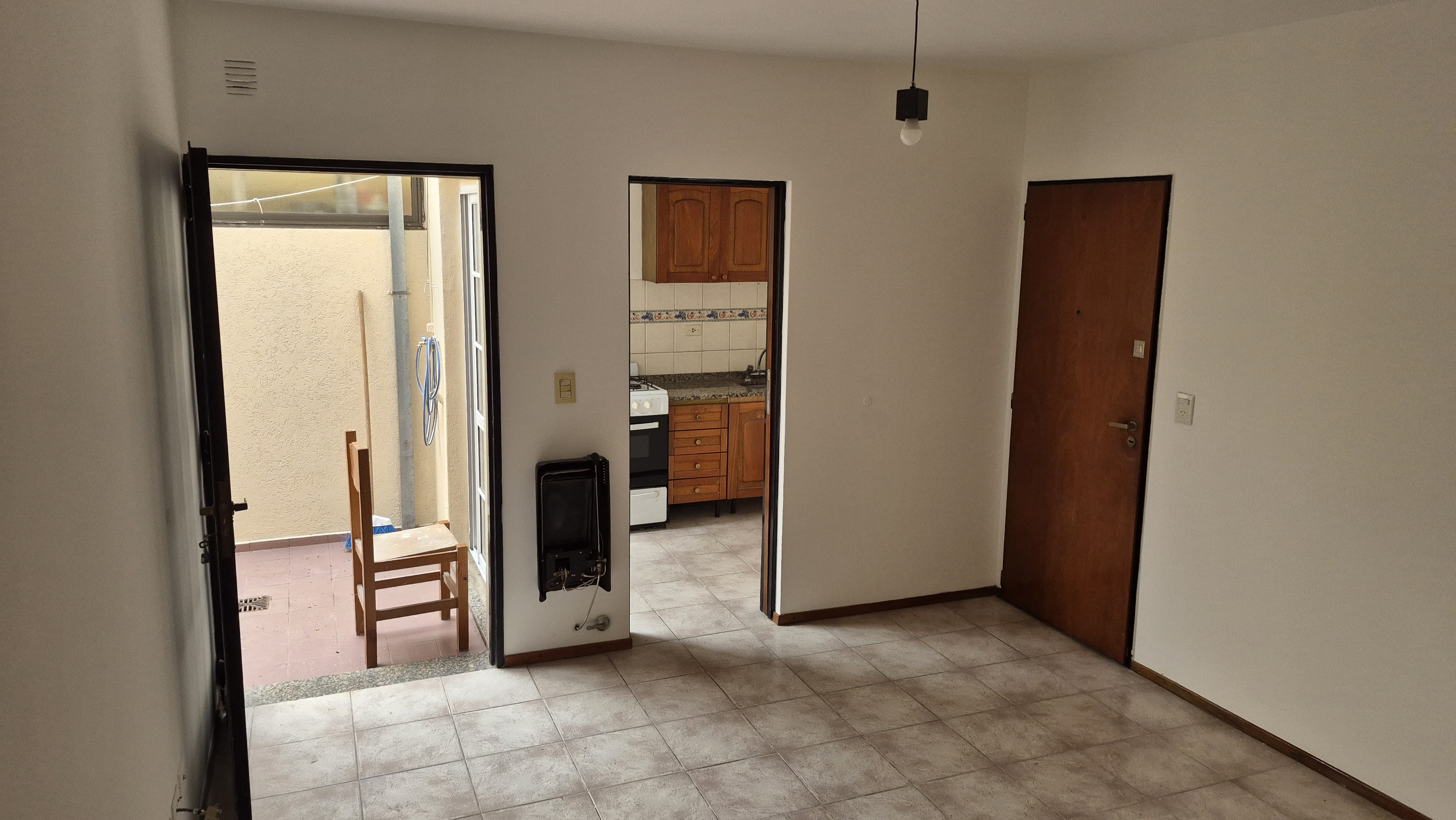 Ground-floor PH with private entrance. It has a 1-bedroom layout plus a living room, with patio 4.00 x 2.00 covered by a sliding roof with an awning. The unit includes a living room (3.50 x 4.55) with an electric heater, a kitchen (2.35 x 1.95), a hallway with a built-in wardrobe, a bedroom (2.75 x 2.50) with a built-in wardrobe, and a bathroom (1.85 x 1.35). Building fees are $70,000, and the property is not suitable for people with reduced mobility. No pets are allowed.