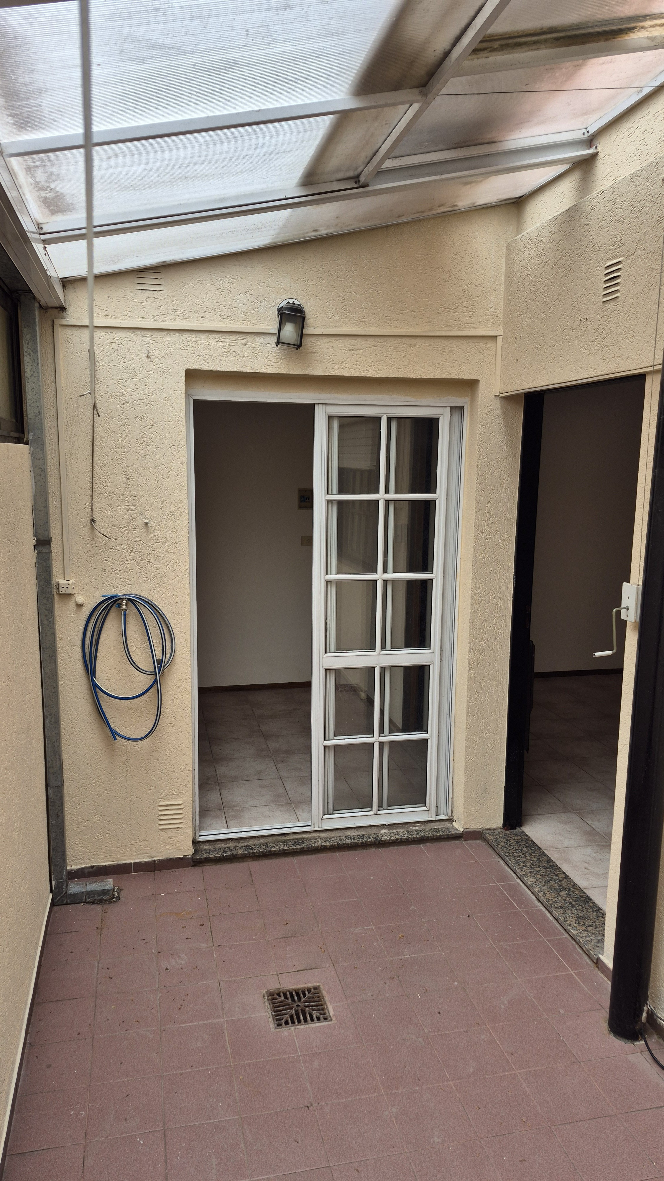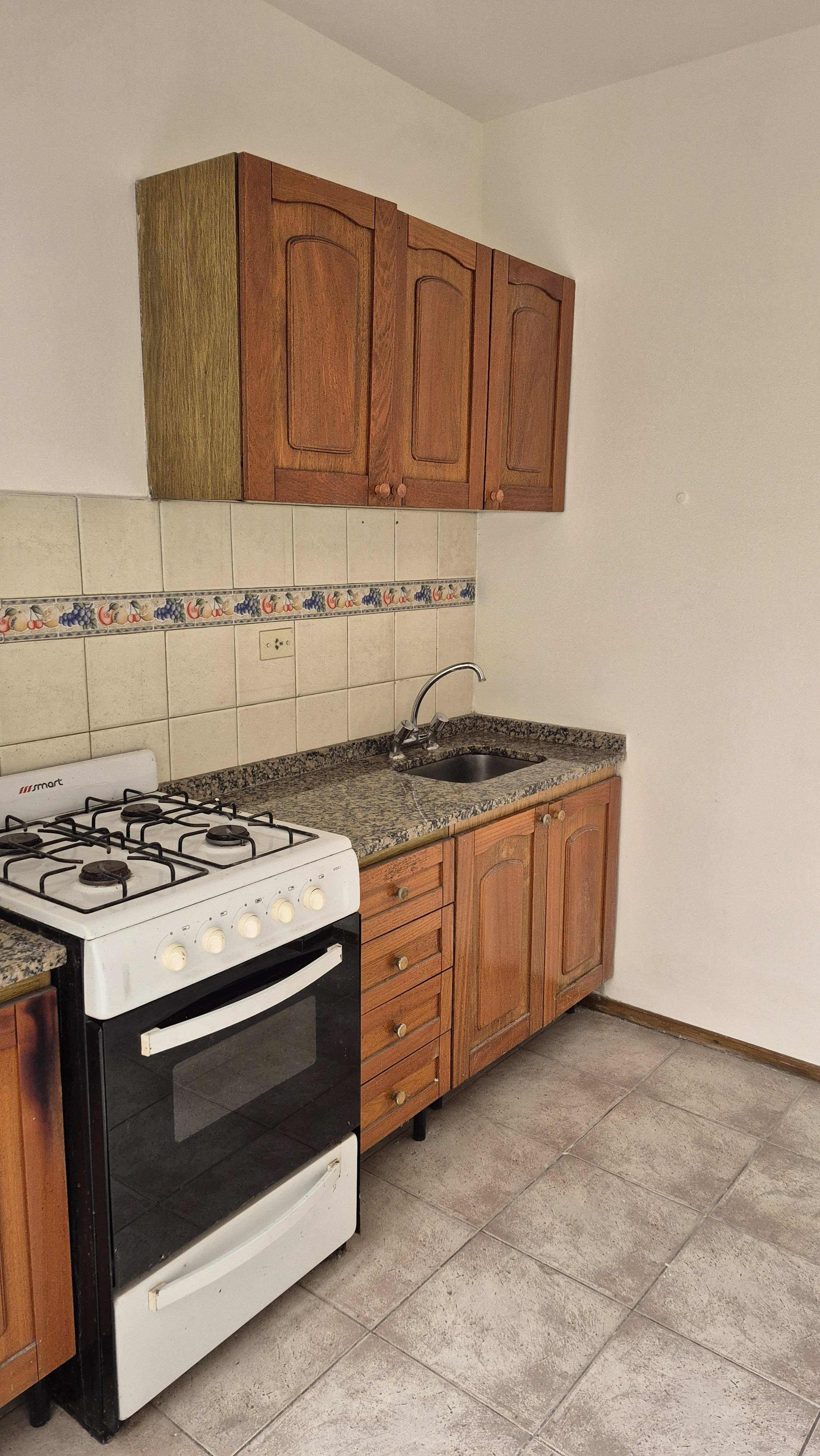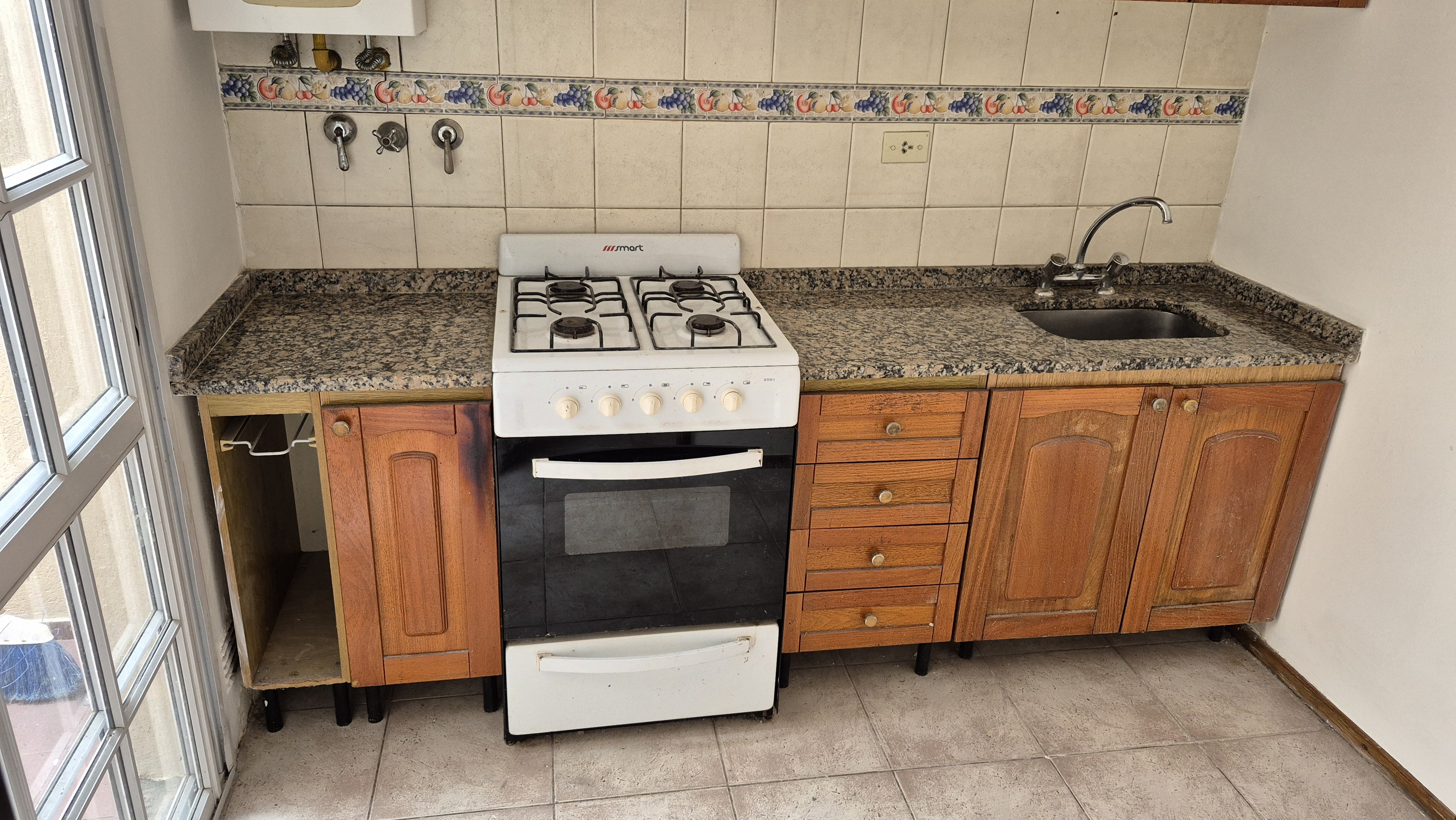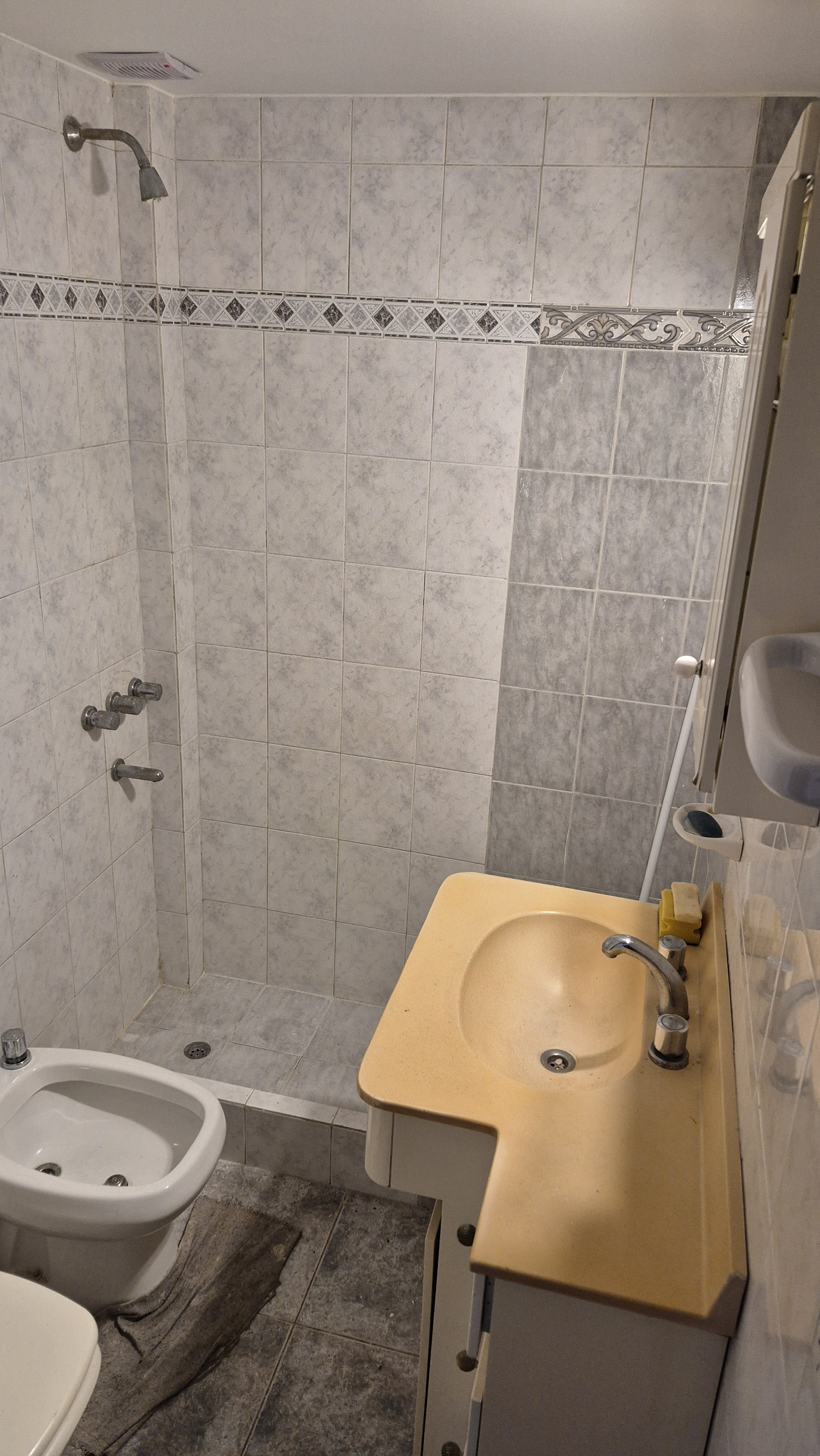 Ground-floor PH with private entrance. It has a 1-bedroom layout plus a living room, with patio 4.00 x 2.00 covered by a sliding roof with an awning. The unit includes a living room (3.50 x 4.55) with an electric heater, a kitchen (2.35 x 1.95), a hallway with a built-in wardrobe, a bedroom (2.75 x 2.50) with a built-in wardrobe, and a bathroom (1.85 x 1.35). Building fees are $70,000, and the property is not suitable for people with reduced mobility. No pets are allowed.