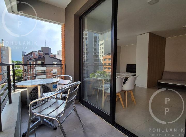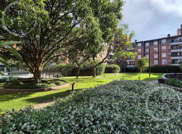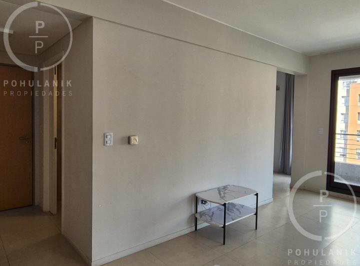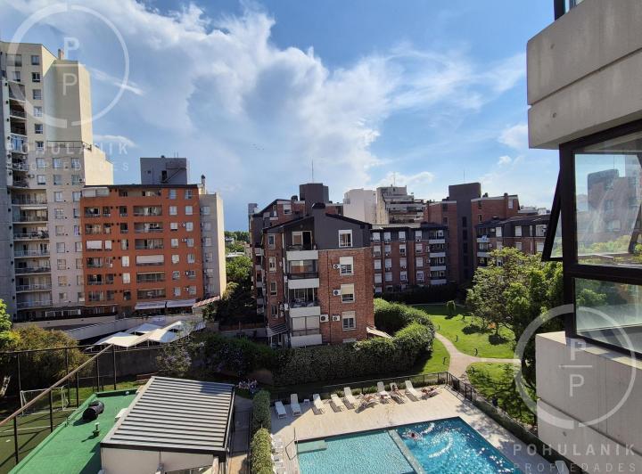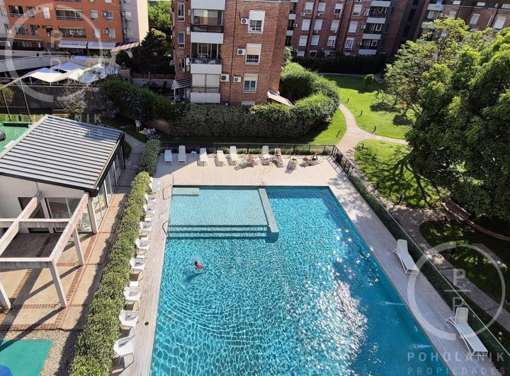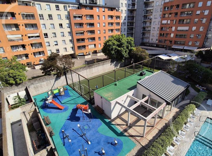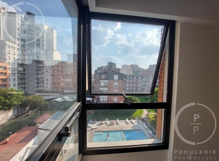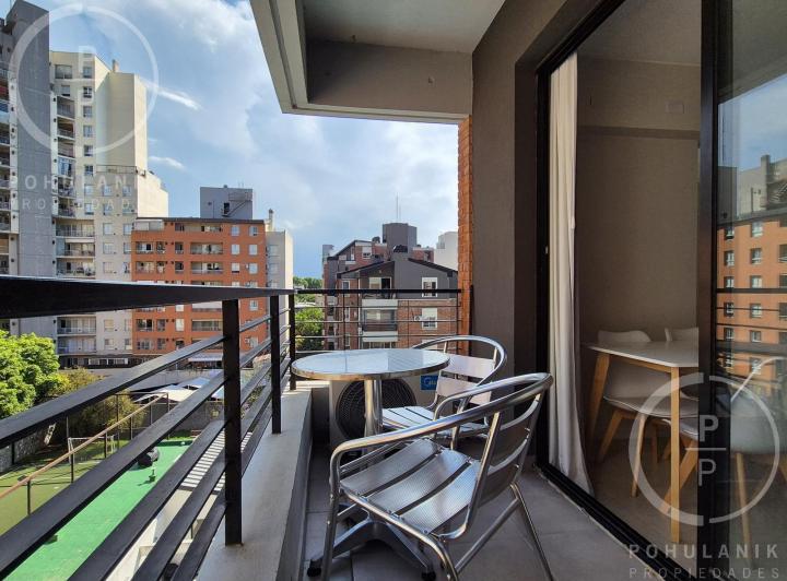 Furnished studio apartment of 1 room in Villa Santa Rita, listed as convertible into 2 rooms through its layout. It has a living-dining area with access to a balcony, a separate kitchen, a space for a bedroom, and 1 full bathroom. The unit offers garden and pool views. The rent does not include building fees (expensas ordinarias), utilities, or ABL (tax). The complex, Las Fresias Garden, includes a central park of 3,700 m², a heated pool, a football pitch, a gym, a communal SUM, and a children’s