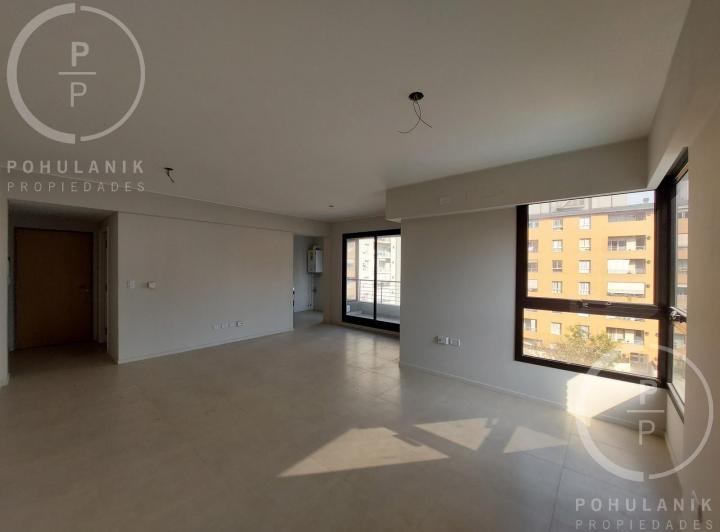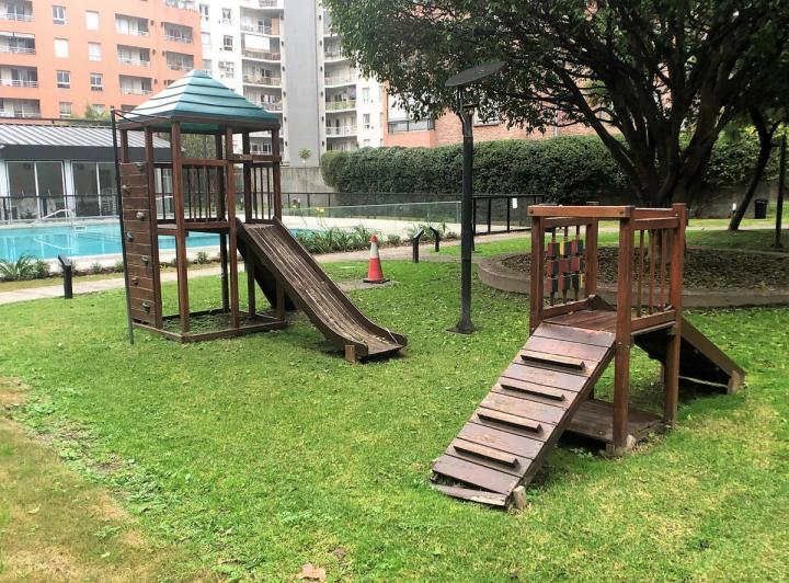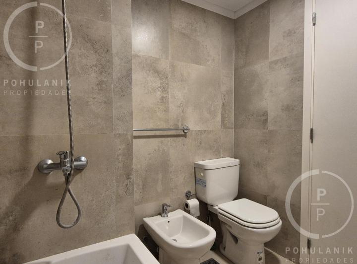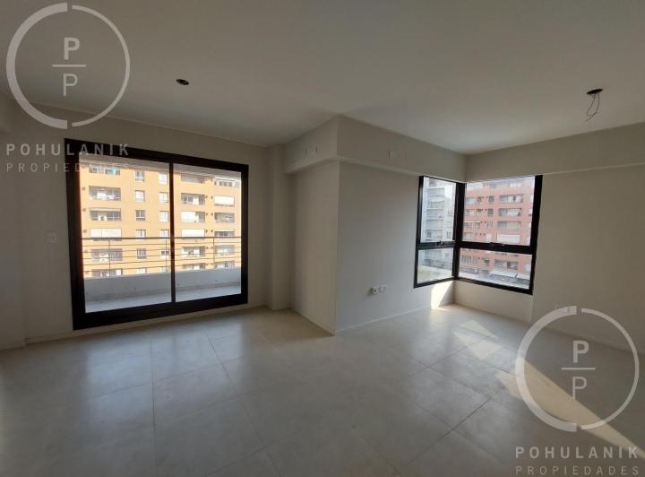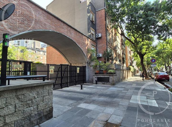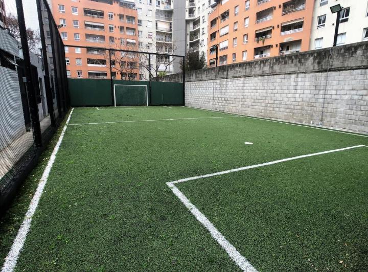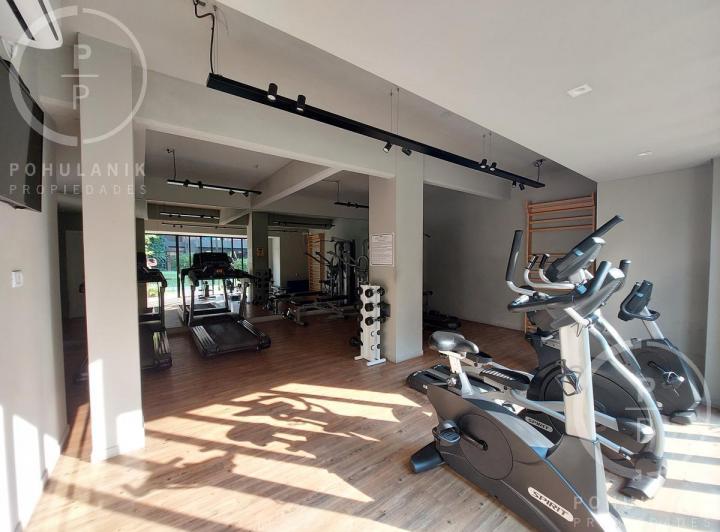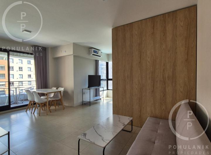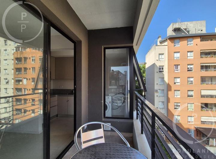Furnished studio apartment of 1 room in Villa Santa Rita, listed as convertible into 2 rooms through its layout. It has a living-dining area with access to a balcony, a separate kitchen, a space for a bedroom, and 1 full bathroom. The unit offers garden and pool views. The rent does not include building fees (expensas ordinarias), utilities, or ABL (tax). The complex, Las Fresias Garden, includes a central park of 3,700 m², a heated pool, a football pitch, a gym, a communal SUM, and a children’s
