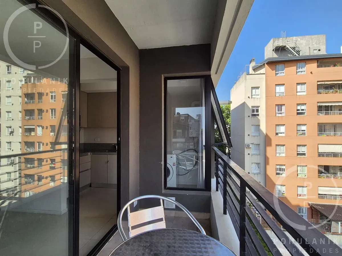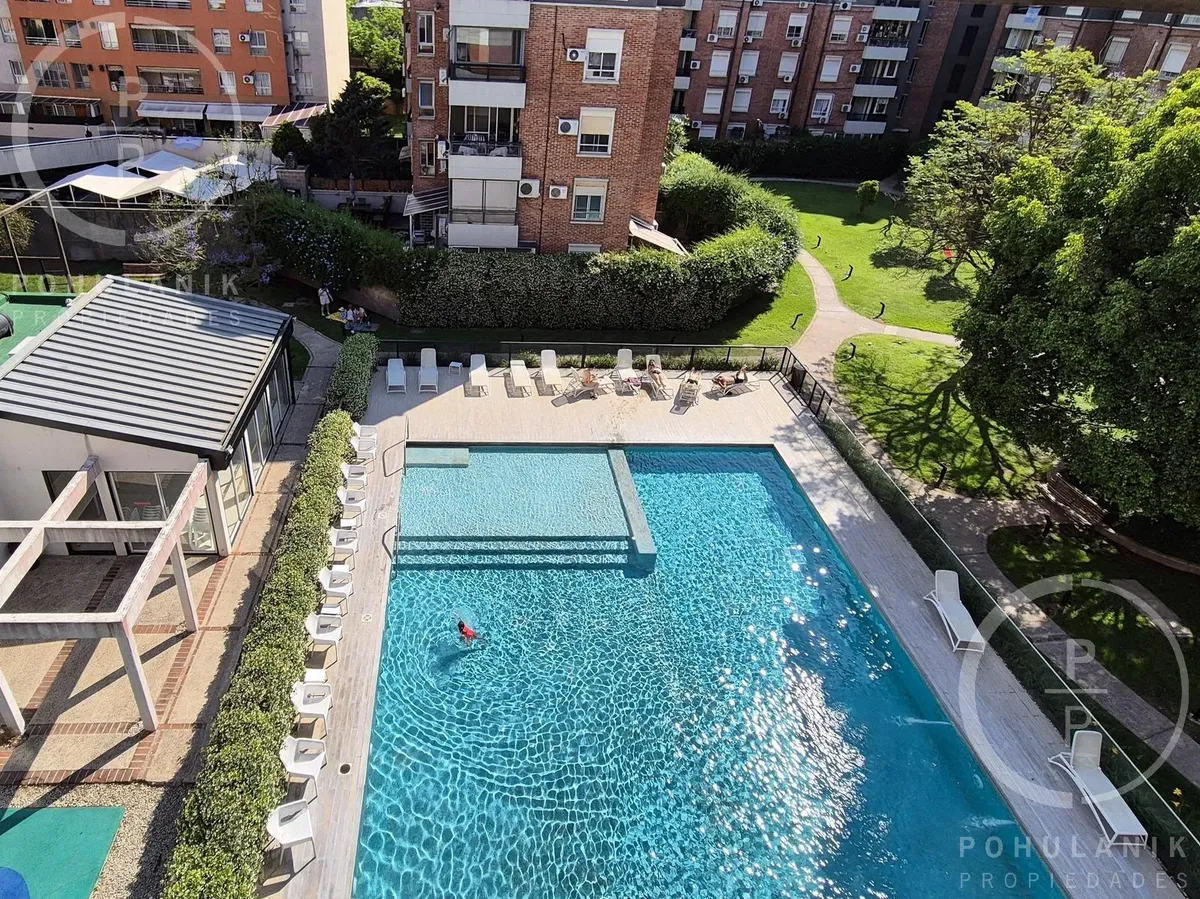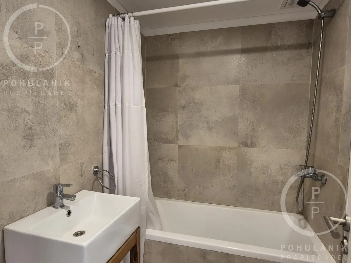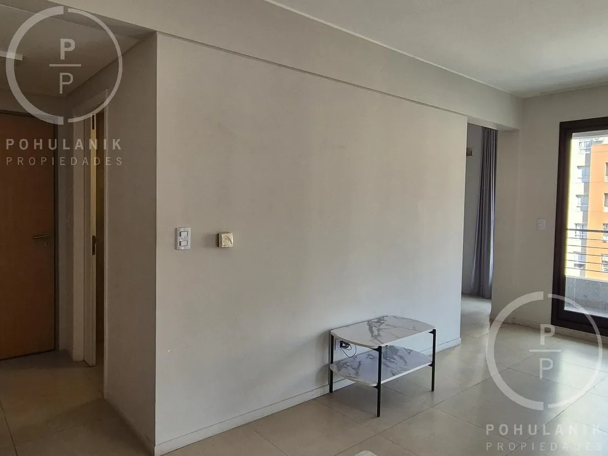 Furnished studio apartment of 1 bathroom in Villa Santa Rita, in Las Fresias Garden. The layout allows it to be divided into 2 rooms with natural light, including a living-dining area with balcony access and a separate kitchen. It has space for a sleeping area and views of the gardens and pool. Rent does not include building fees, utilities, or ABL.