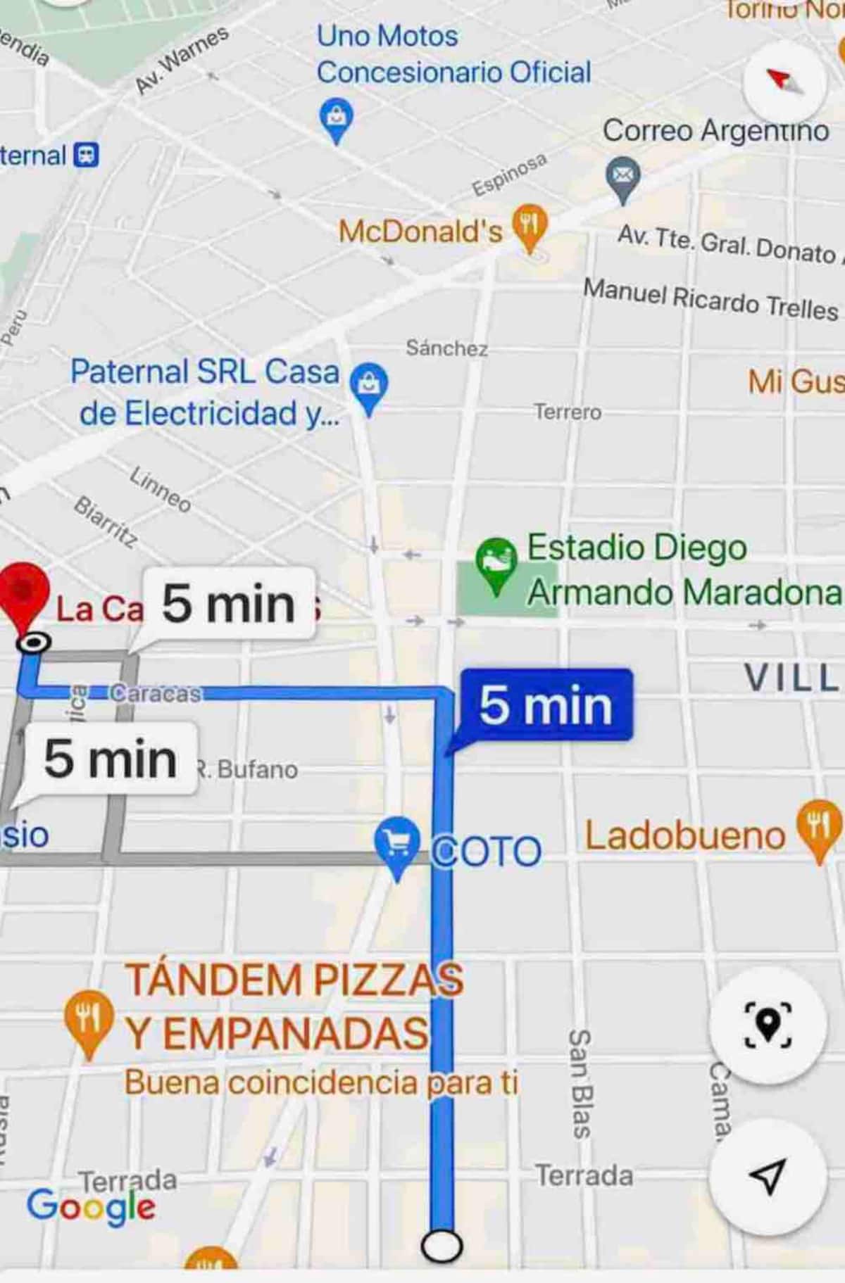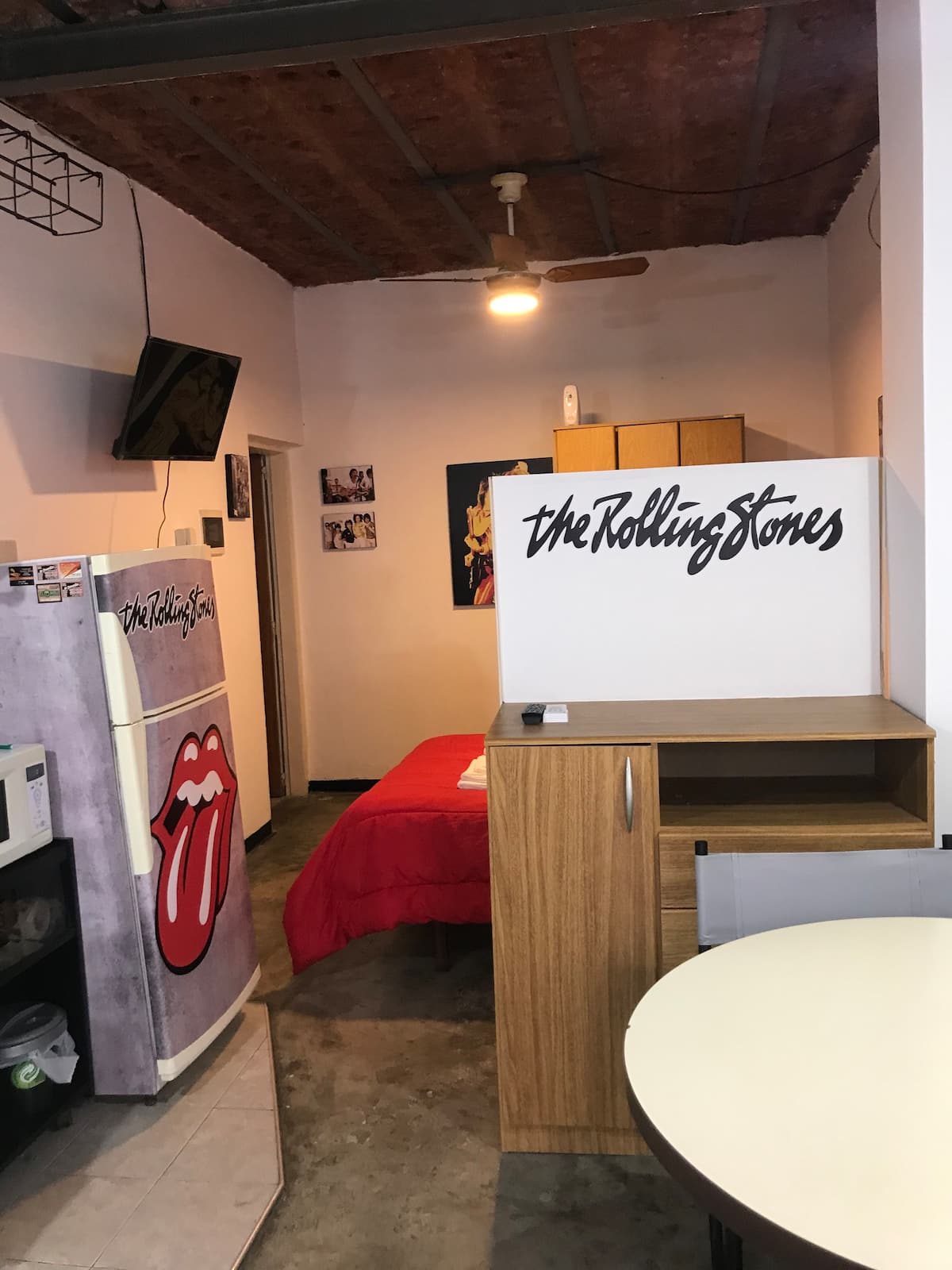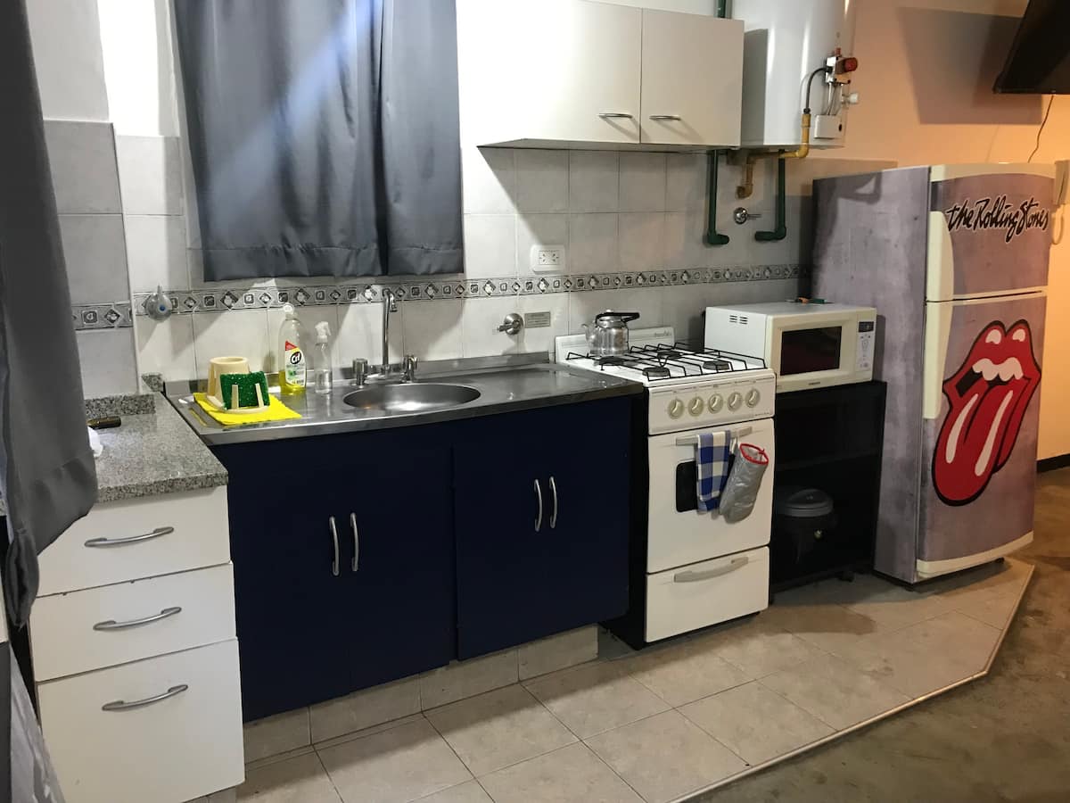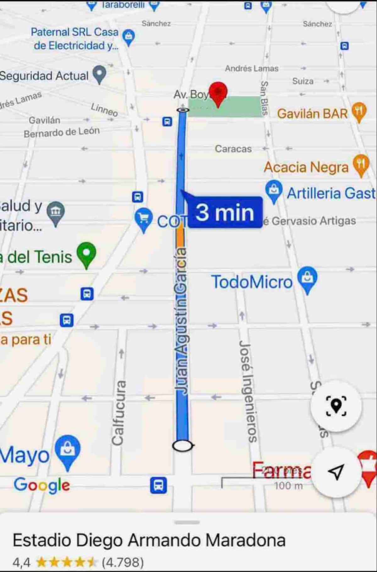 The listing is for a one-bedroom themed loft apartment in Villa Santa Rita. It is described as 50 metres from public transport, with nearby references including Diego Armando Maradona Stadium (600 metres), Maradona’s former home and museum (10 blocks), the open-air shopping centre in Flores (15 blocks), the Faculty of Agronomy (15 blocks), the Metrobus to Palermo (8 blocks) and Roff Hospital (20 blocks). The apartment is stated to have a shared terrace and shared-use washer and dryer. Parking is