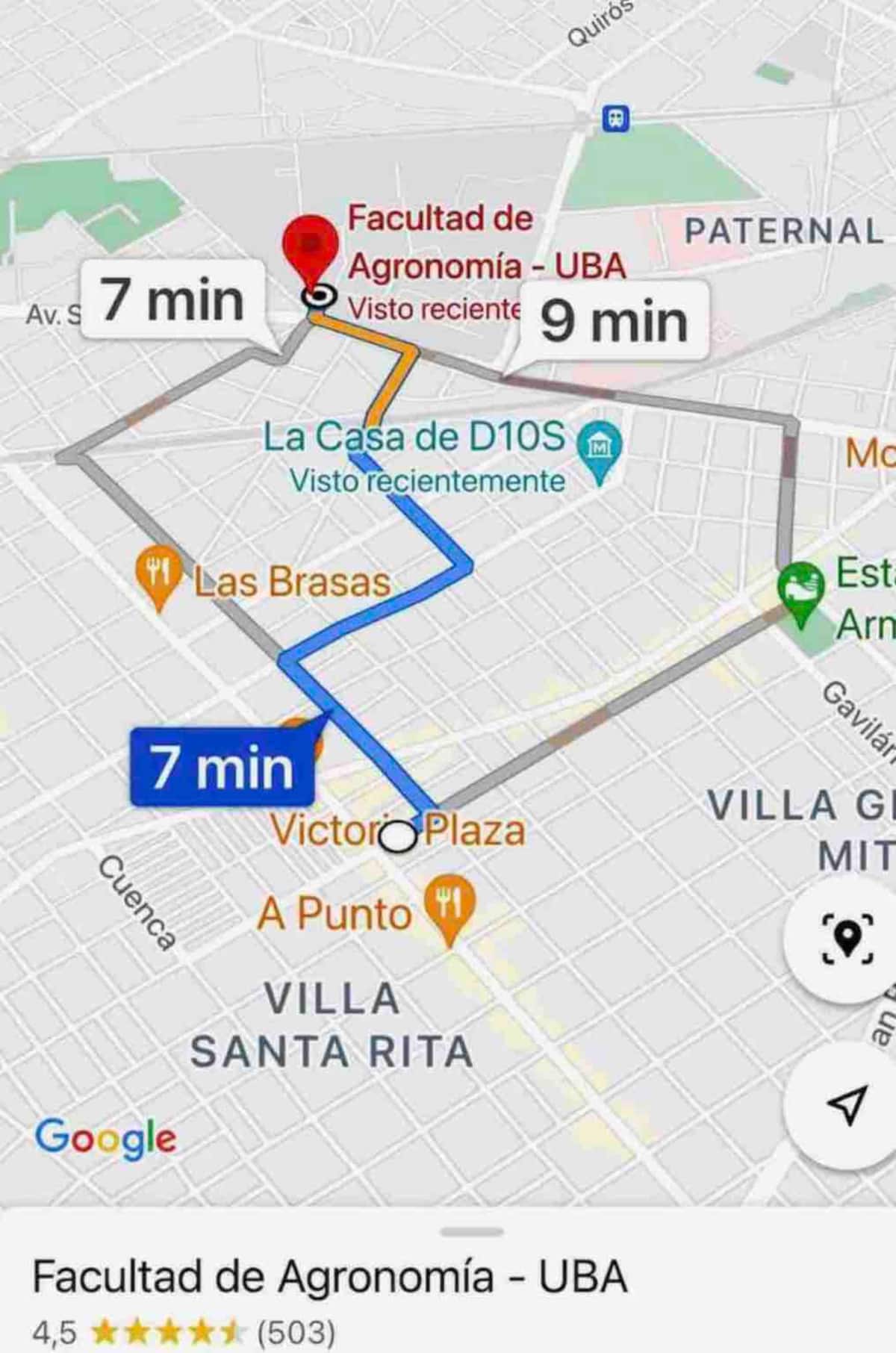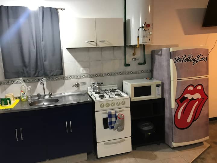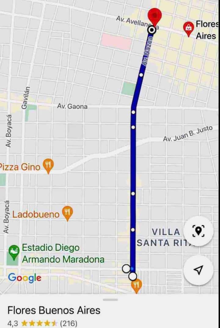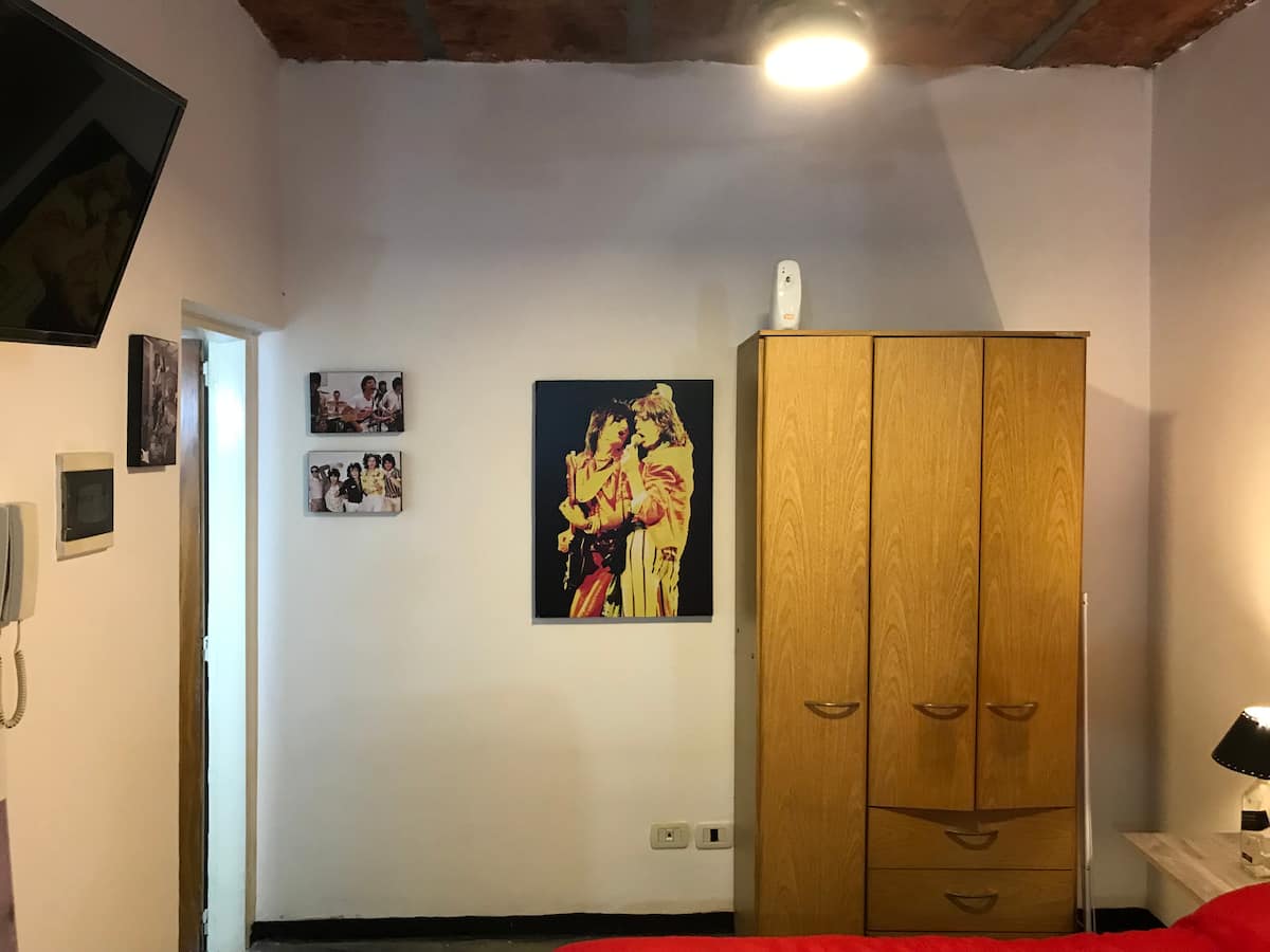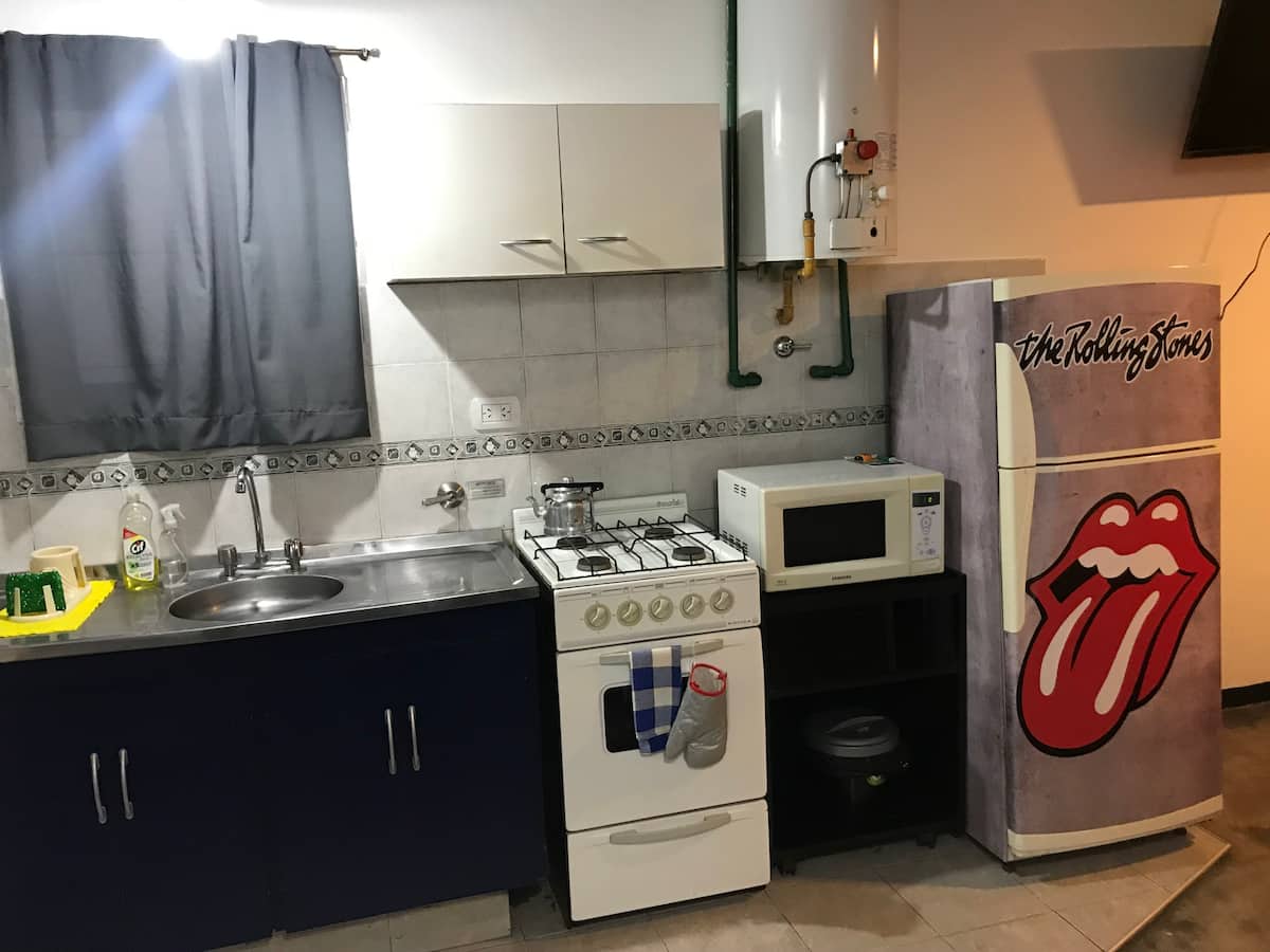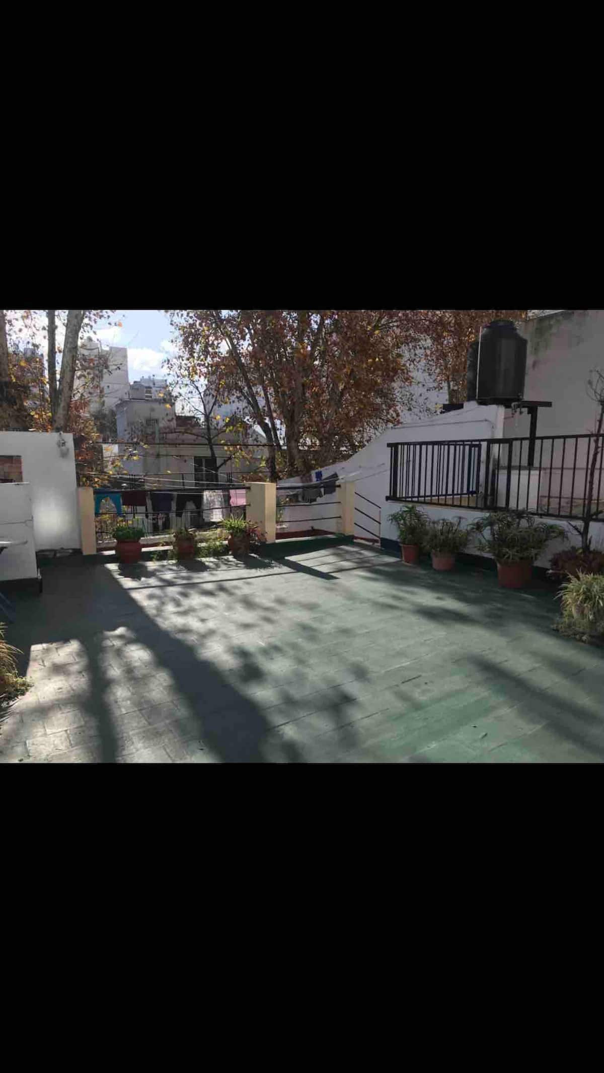 The listing is for a one-bedroom themed loft apartment in Villa Santa Rita. It is described as 50 metres from public transport, with nearby references including Diego Armando Maradona Stadium (600 metres), Maradona’s former home and museum (10 blocks), the open-air shopping centre in Flores (15 blocks), the Faculty of Agronomy (15 blocks), the Metrobus to Palermo (8 blocks) and Roff Hospital (20 blocks). The apartment is stated to have a shared terrace and shared-use washer and dryer. Parking is