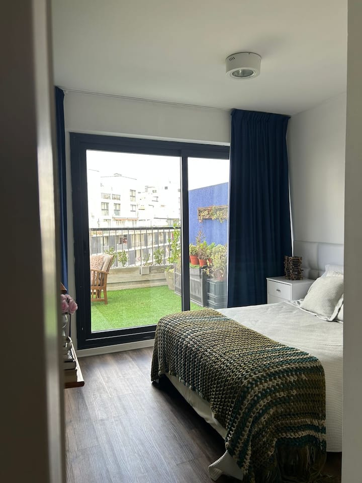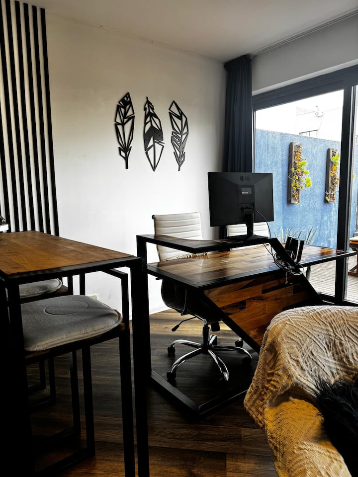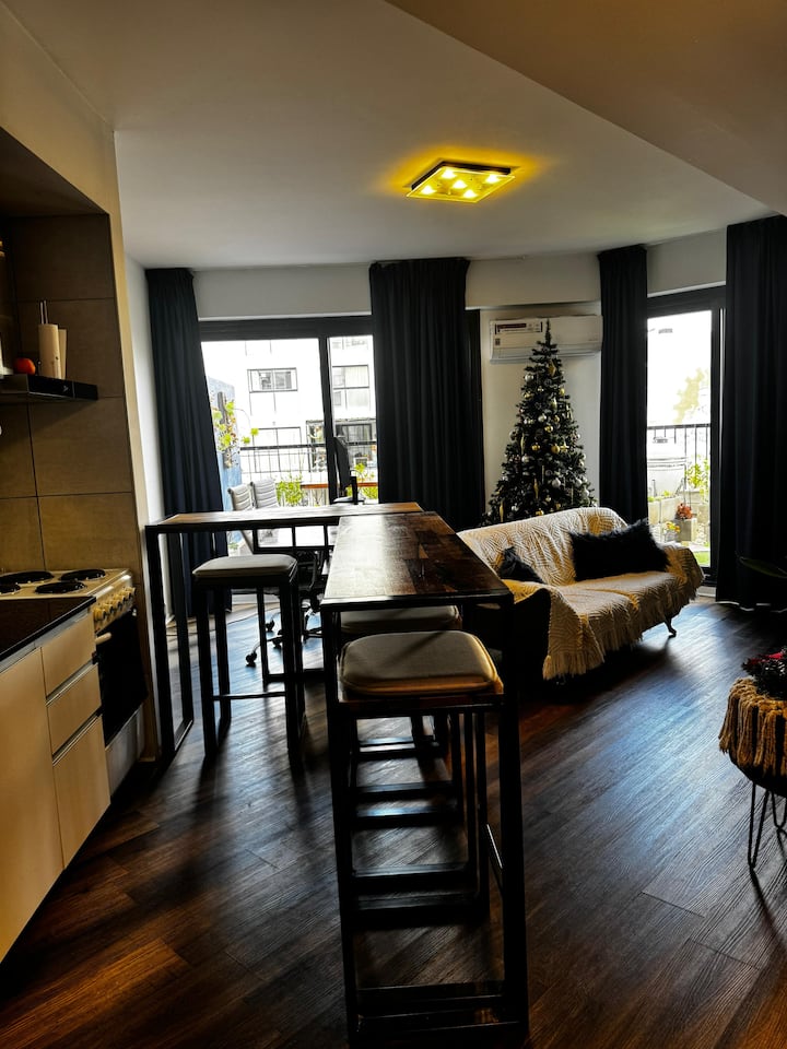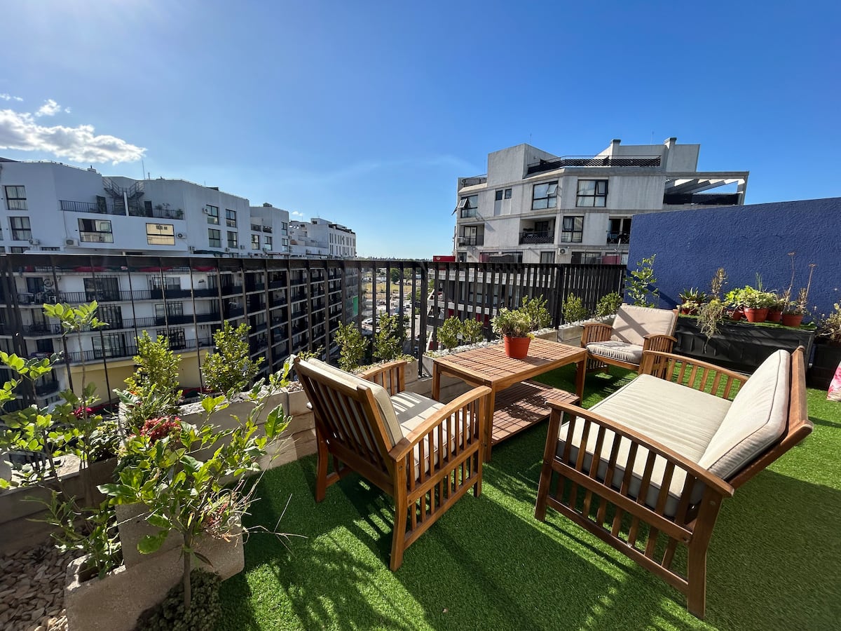 Apartment in Barrio Olímpico, Villa Soldati, with 1 bedroom and 1 main bathroom. The kitchen is open-plan and integrated into the living area. There is a dedicated workspace indoors and on a terrace balcony, plus a barbecue grill. The listing mentions a fully equipped kitchen and views.