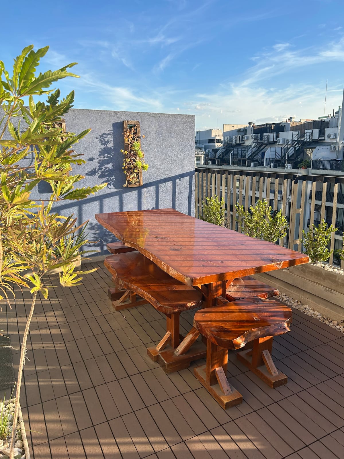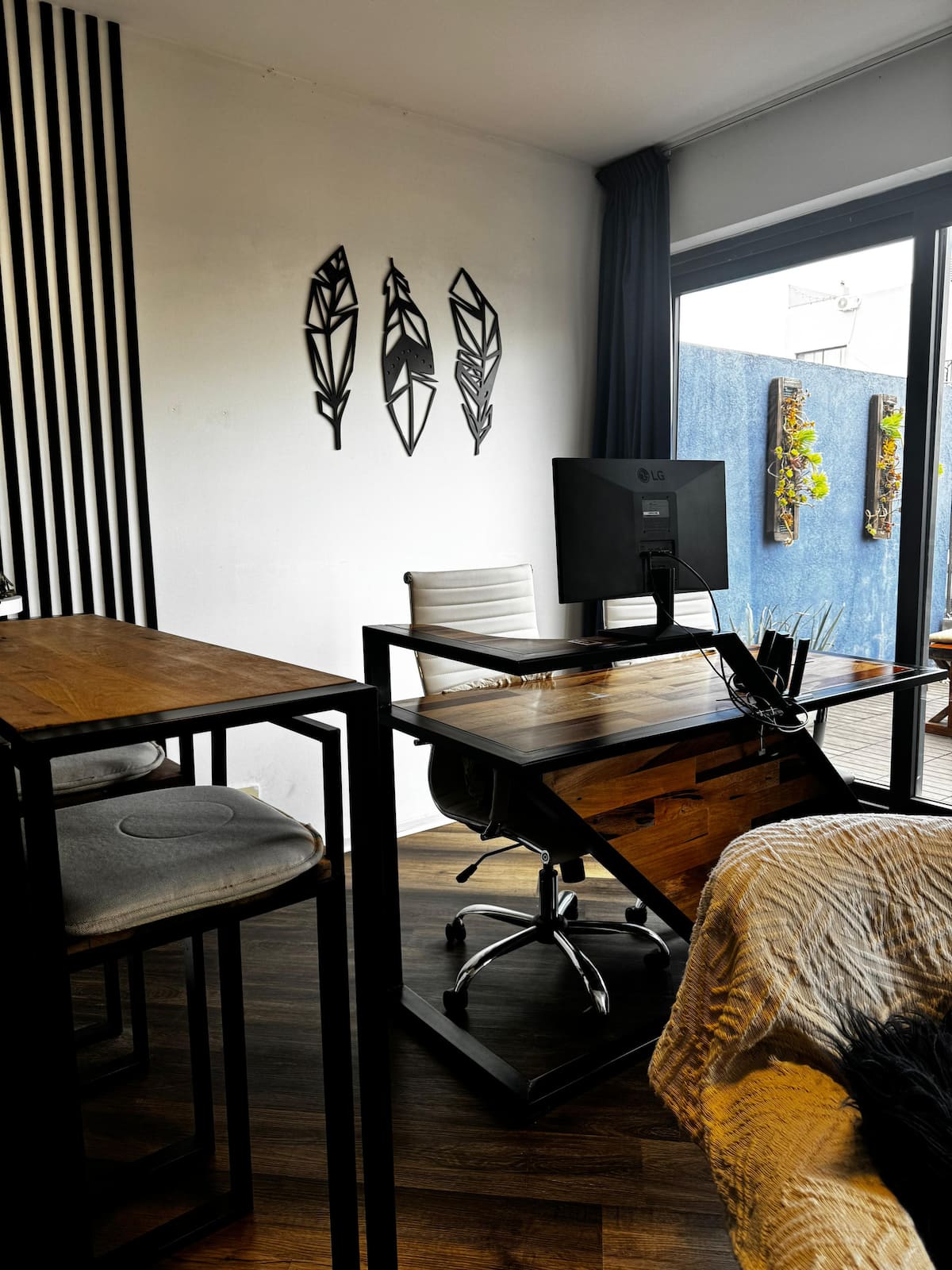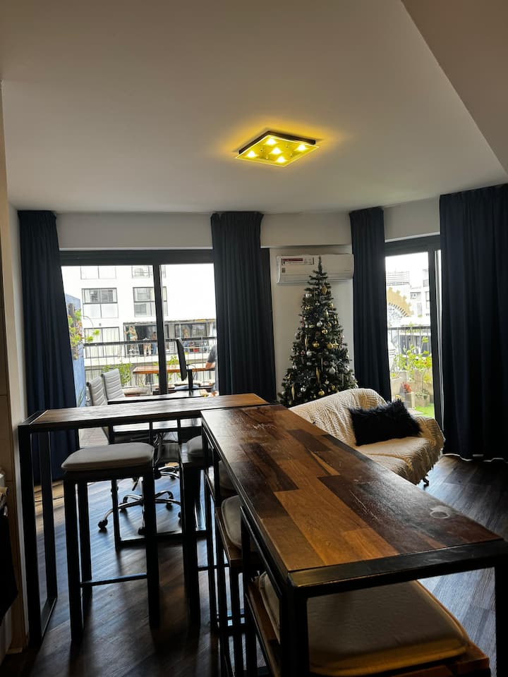 Apartment in Barrio Olímpico, Villa Soldati, with 1 bedroom and 1 main bathroom. The kitchen is open-plan and integrated into the living area. There is a dedicated workspace indoors and on a terrace balcony, plus a barbecue grill. The listing mentions a fully equipped kitchen and views.