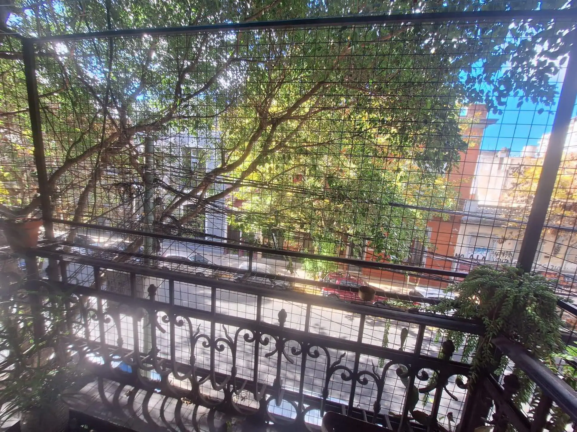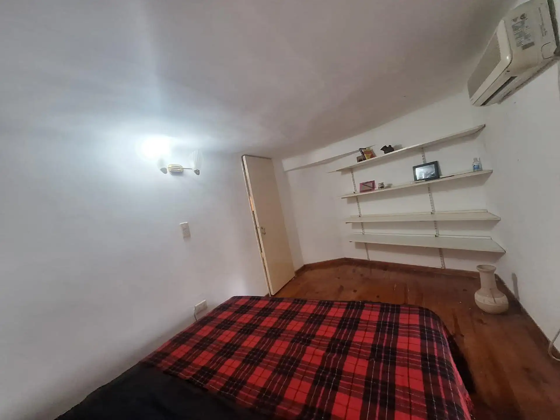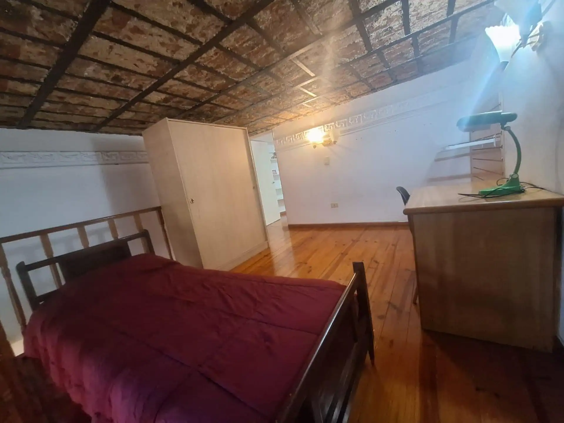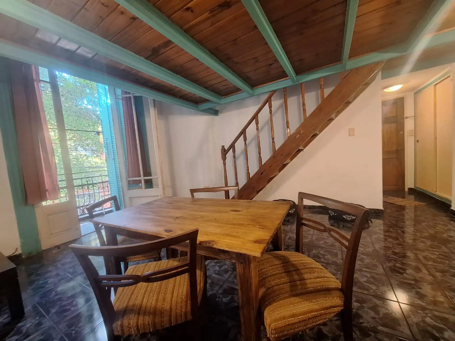 Duplex apartment with 2 bedrooms and a balcony, in Almagro. Street-facing living-dining area with a balcony and front view; kitchen is fully equipped and has a nearby laundry area. Main bedroom has air conditioning and a separate dressing room; there is a full bathroom with bathtub plus an additional toilet, and an upper mezzanine with a single bed, wardrobe and desk. Building fees and real-estate tax are included, along with central hot water and Wi‑Fi internet; final cleaning, electricity and