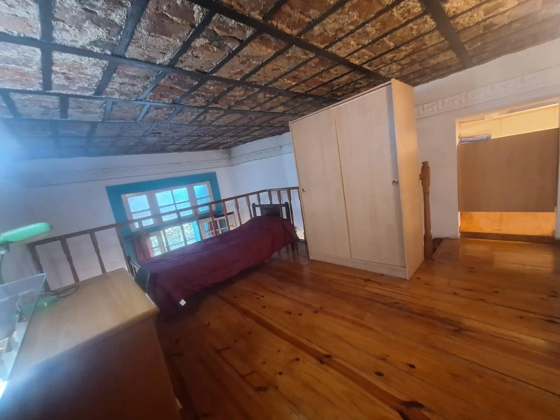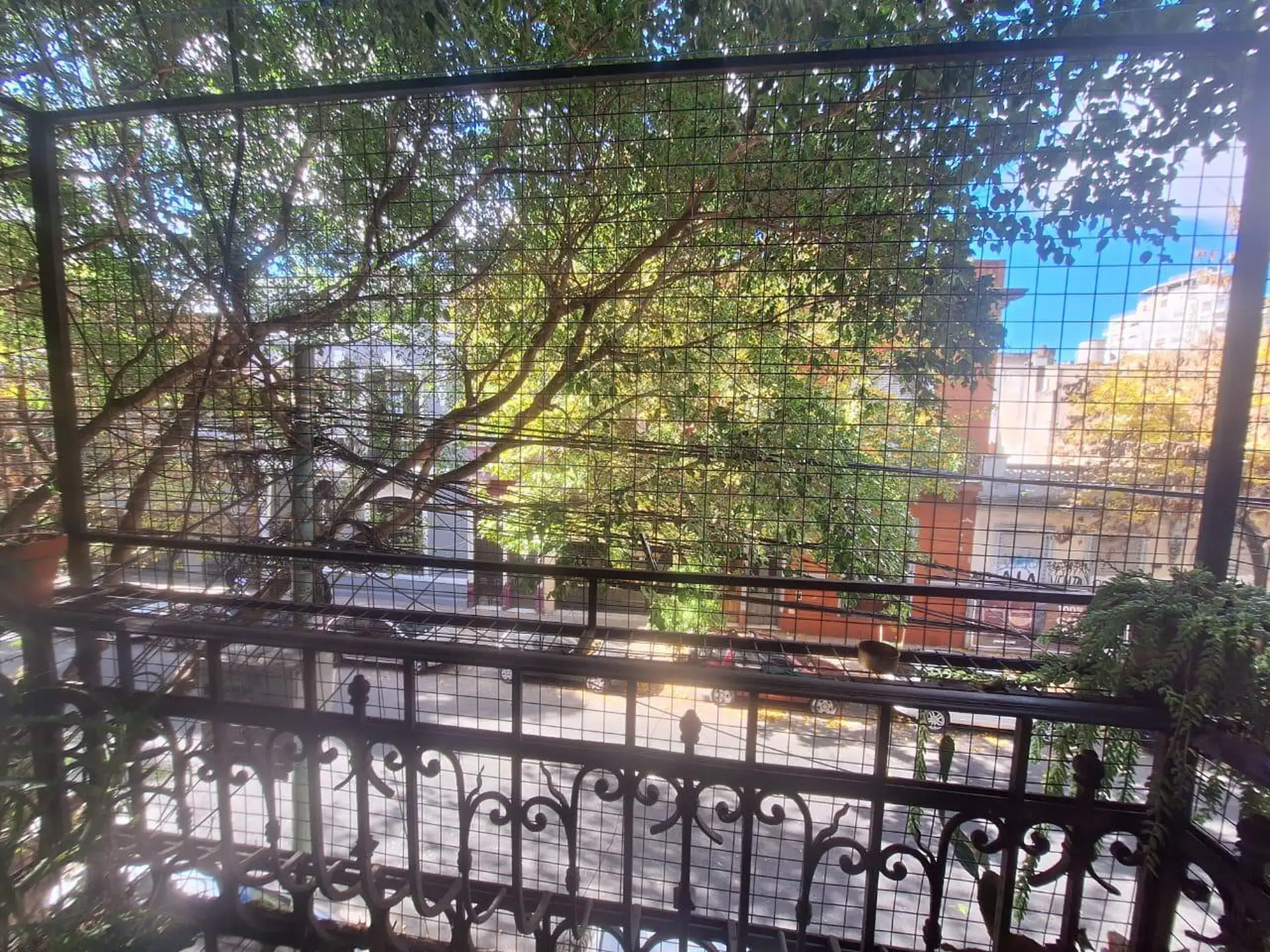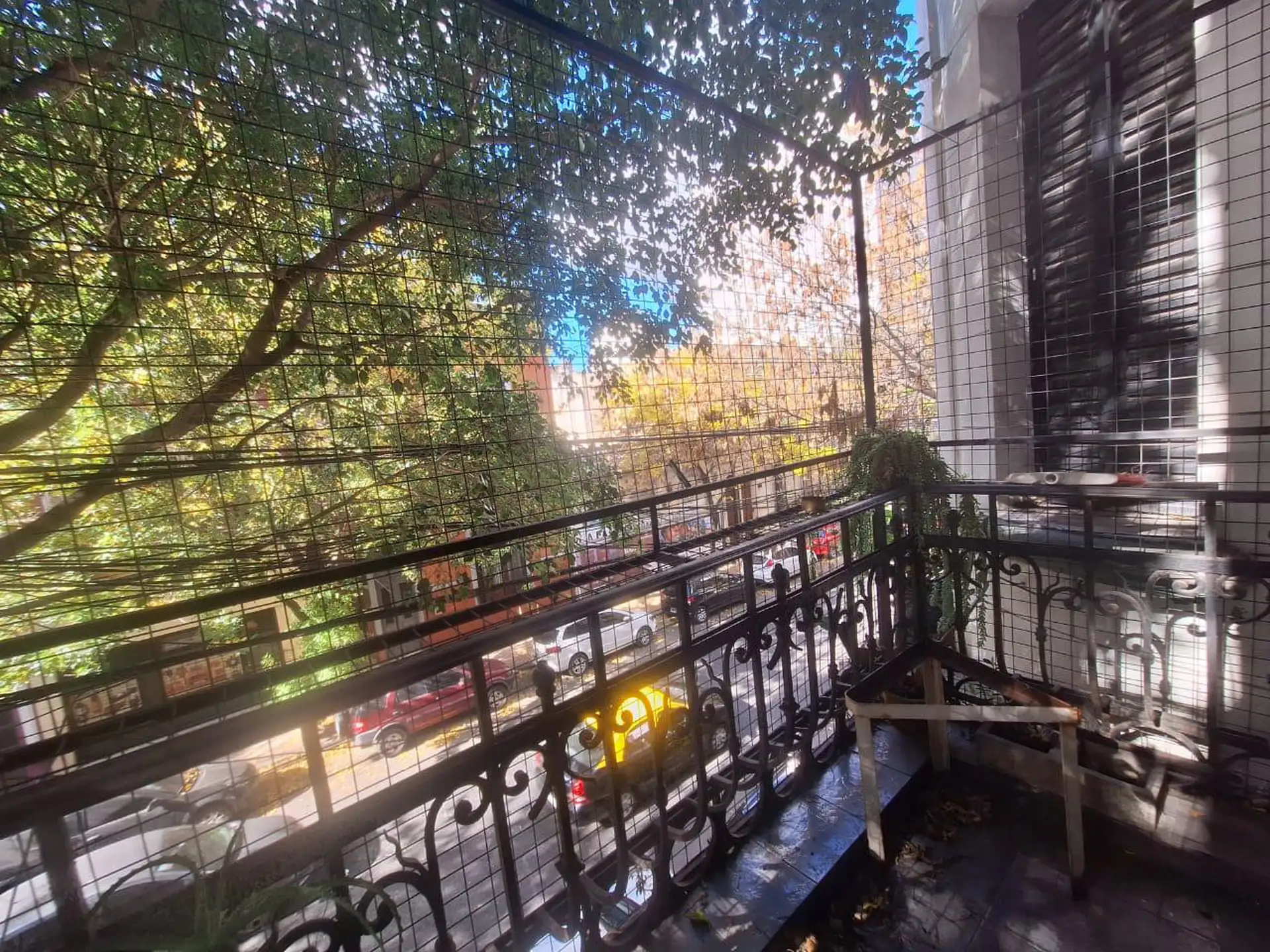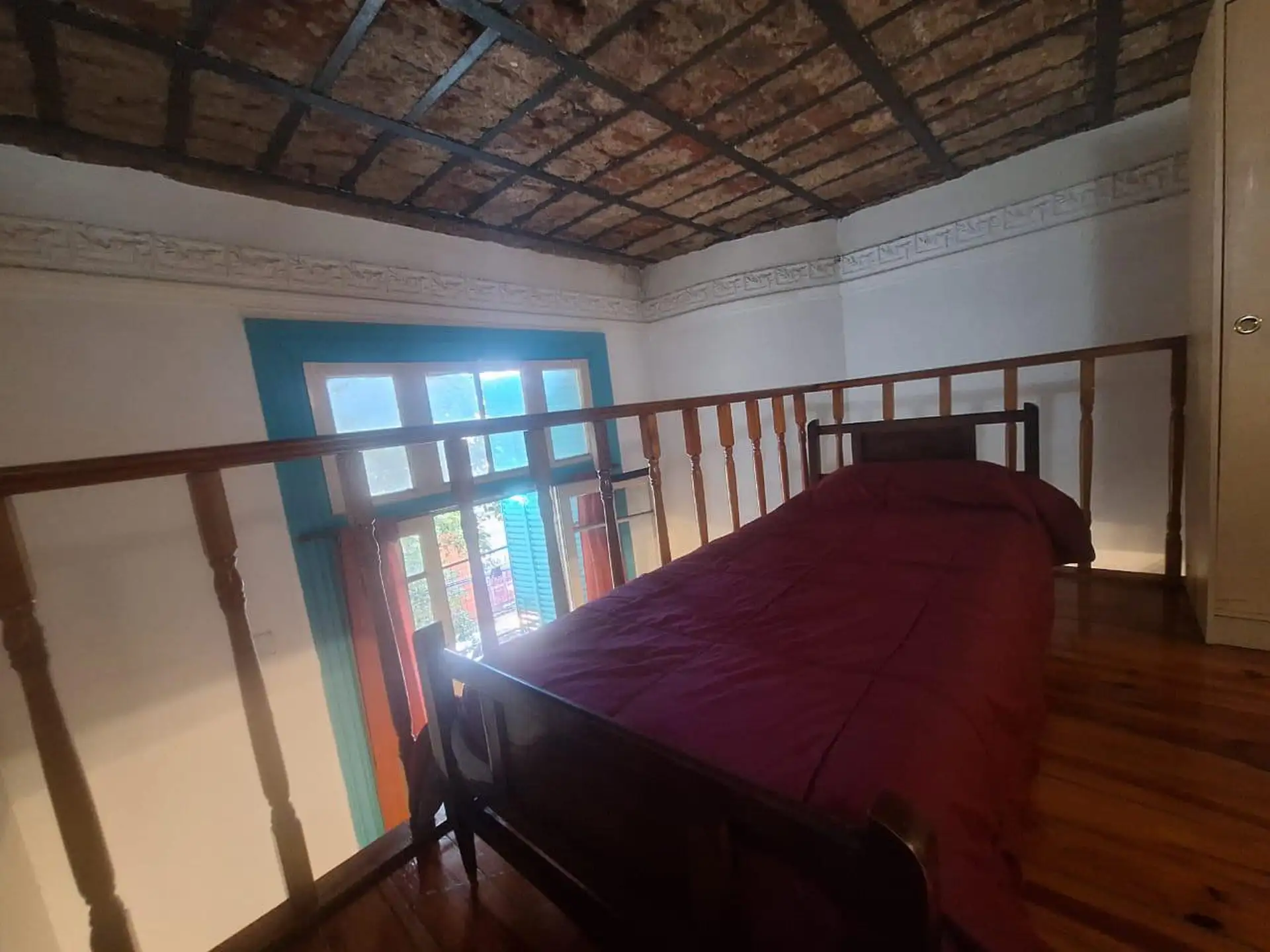 Duplex apartment with 2 bedrooms and a balcony, in Almagro. Street-facing living-dining area with a balcony and front view; kitchen is fully equipped and has a nearby laundry area. Main bedroom has air conditioning and a separate dressing room; there is a full bathroom with bathtub plus an additional toilet, and an upper mezzanine with a single bed, wardrobe and desk. Building fees and real-estate tax are included, along with central hot water and Wi‑Fi internet; final cleaning, electricity and