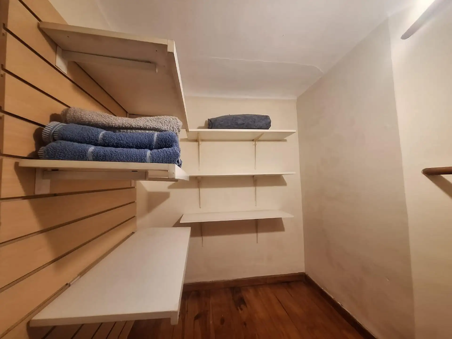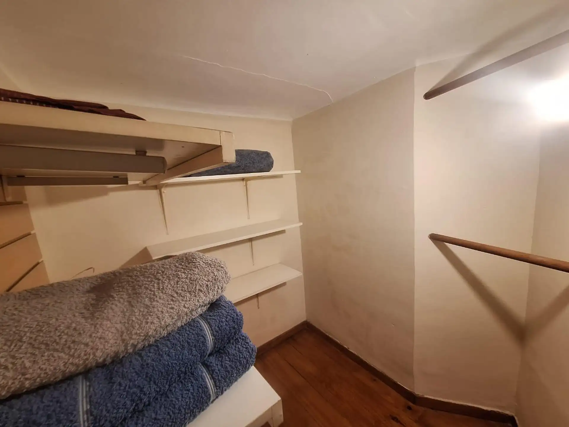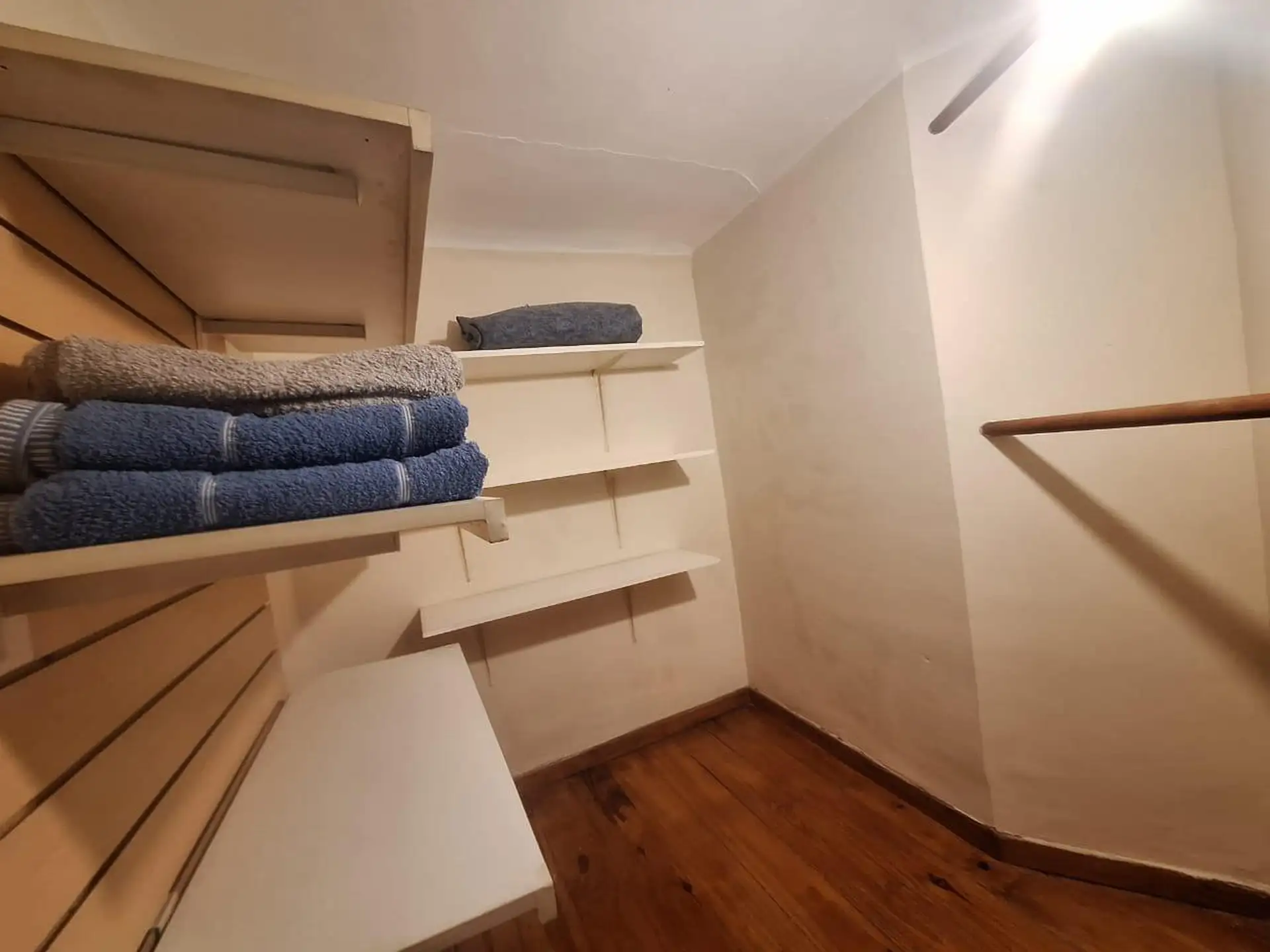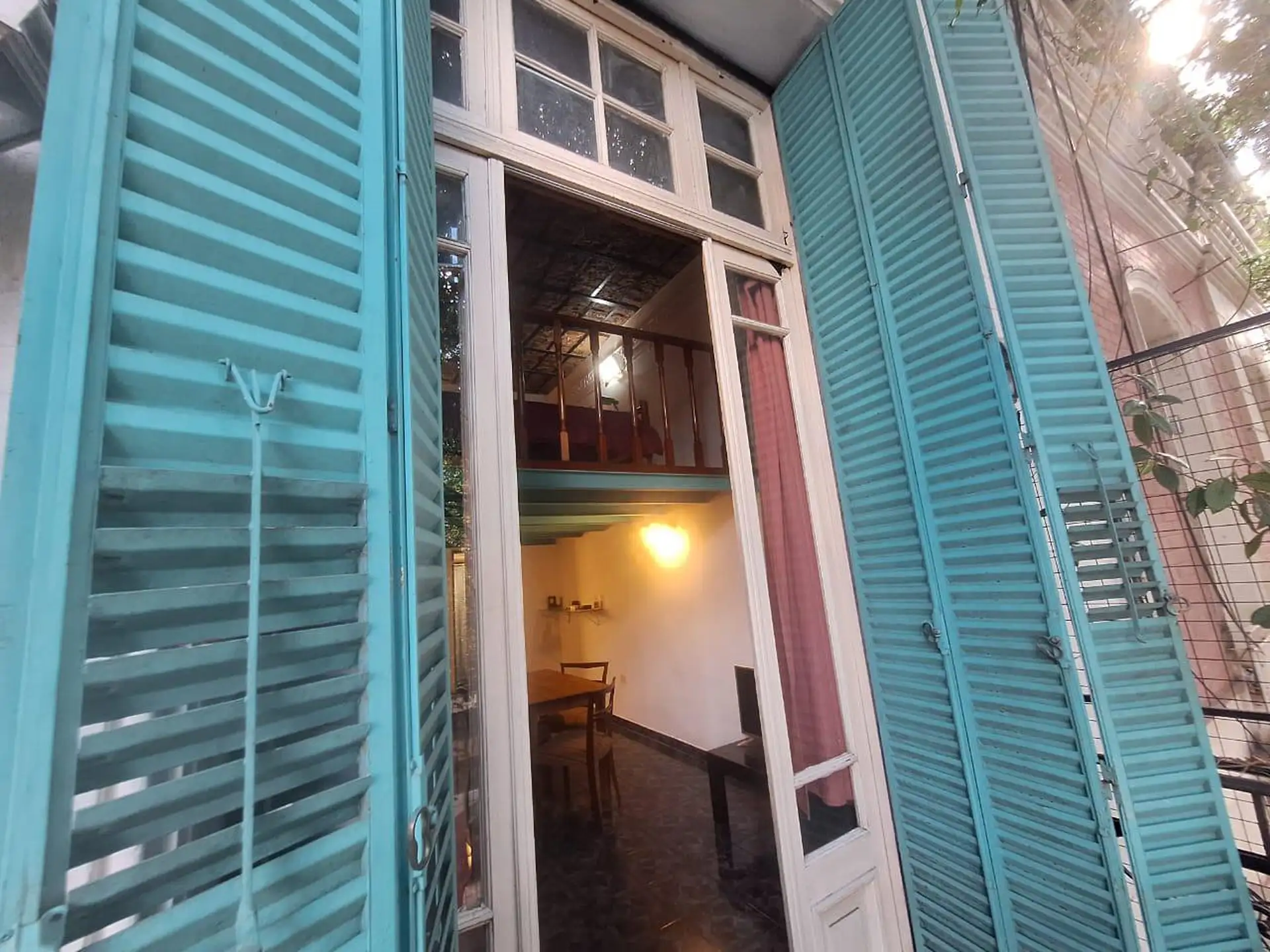 Duplex apartment with 2 bedrooms and a balcony, in Almagro. Street-facing living-dining area with a balcony and front view; kitchen is fully equipped and has a nearby laundry area. Main bedroom has air conditioning and a separate dressing room; there is a full bathroom with bathtub plus an additional toilet, and an upper mezzanine with a single bed, wardrobe and desk. Building fees and real-estate tax are included, along with central hot water and Wi‑Fi internet; final cleaning, electricity and