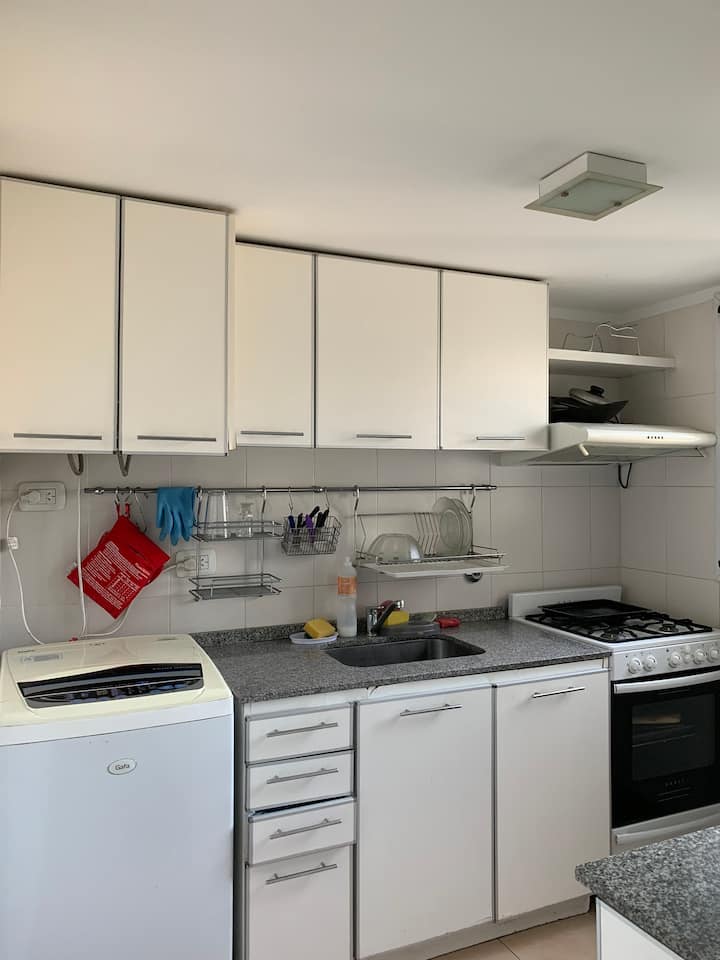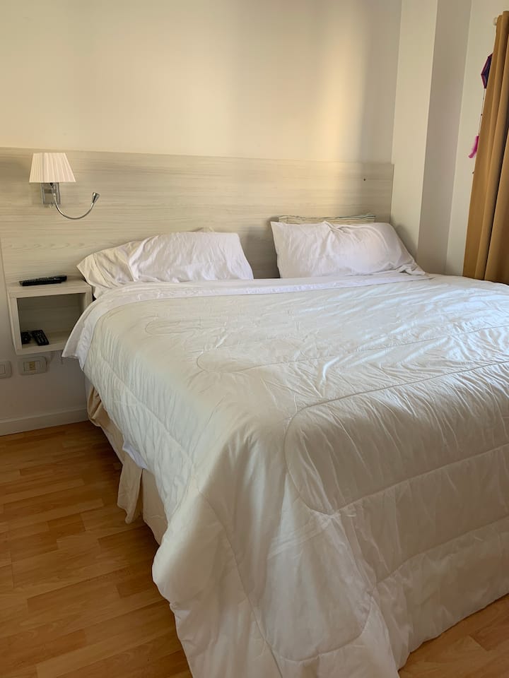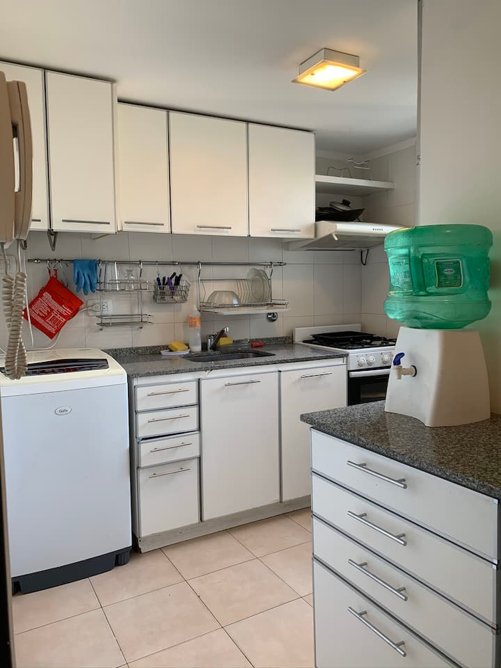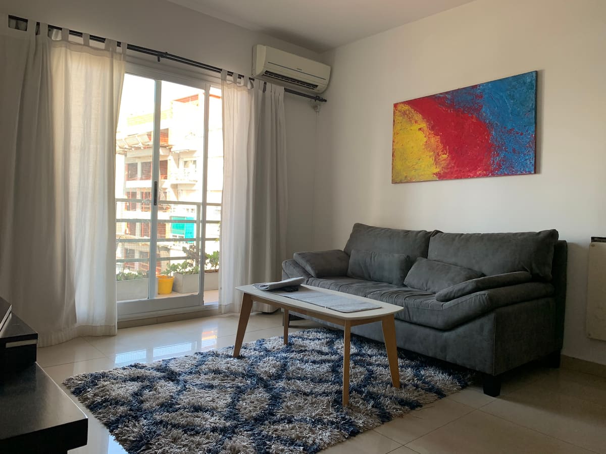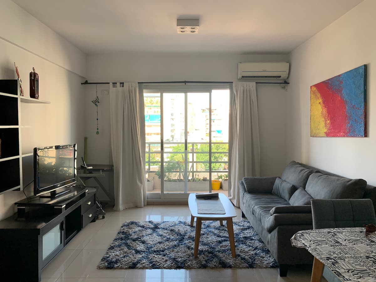 Three-room apartment with 75 m², located on the street-facing side opposite Parque Centenario. It has a balcony and a view over the block’s green area. The building includes a pool with year-round access, a gym, a laundry room, and a communal room with a grill. Building fees, common-space access rules and any additional charges for longer stays are subject to regulation.