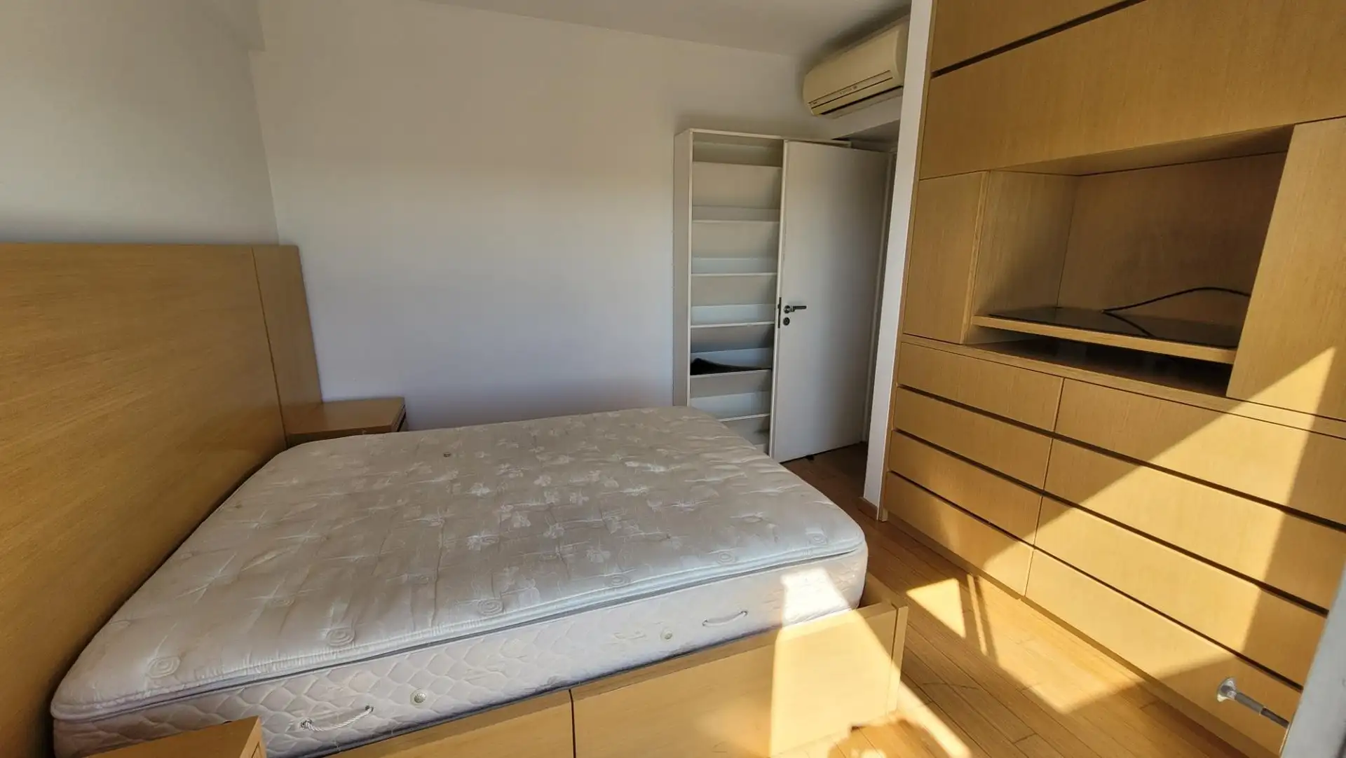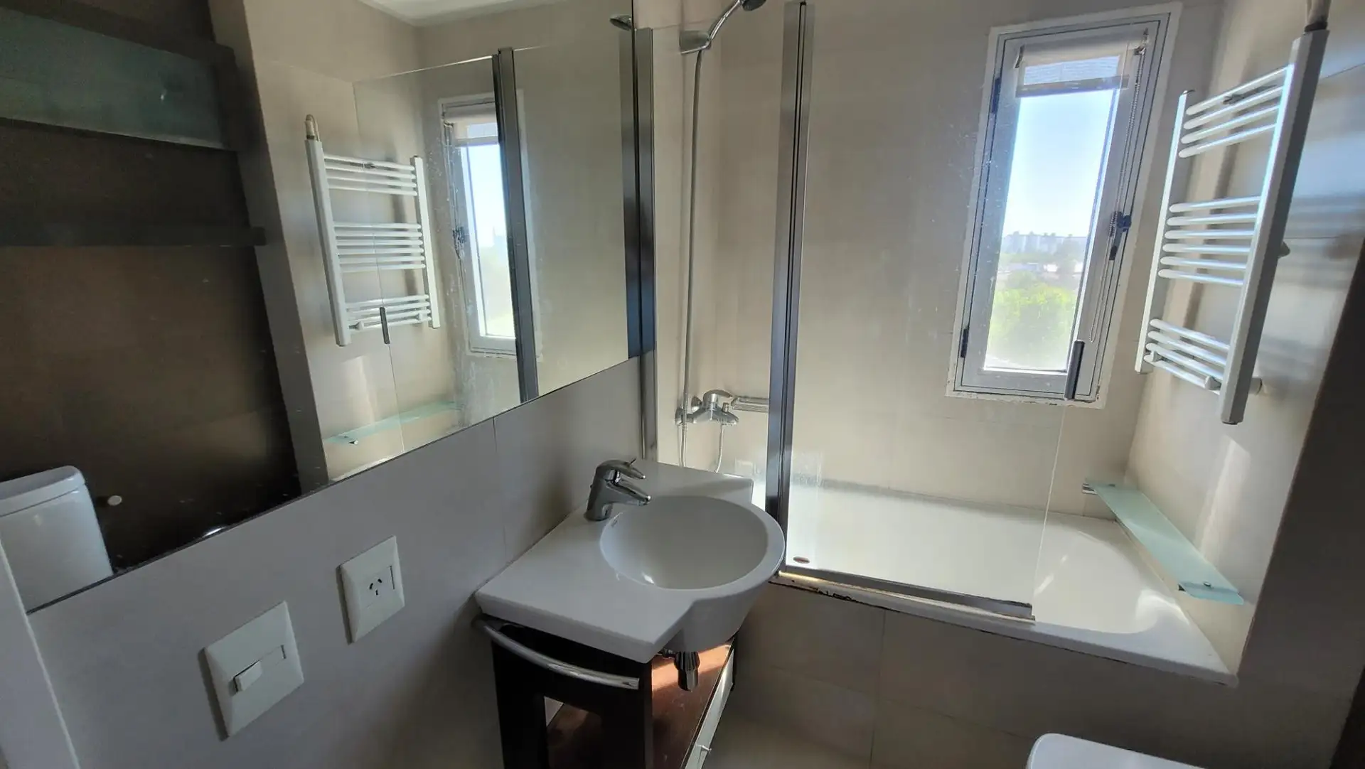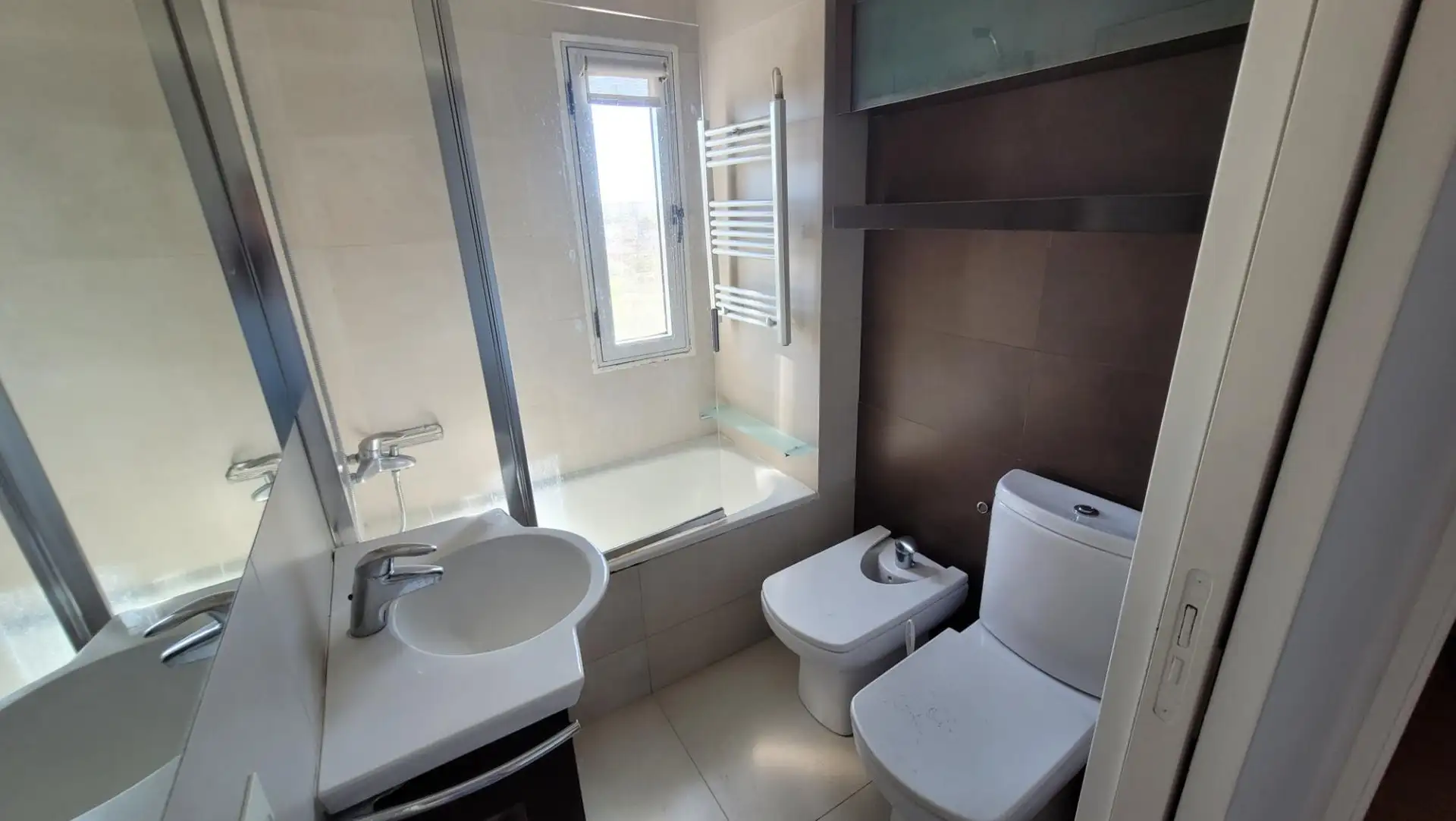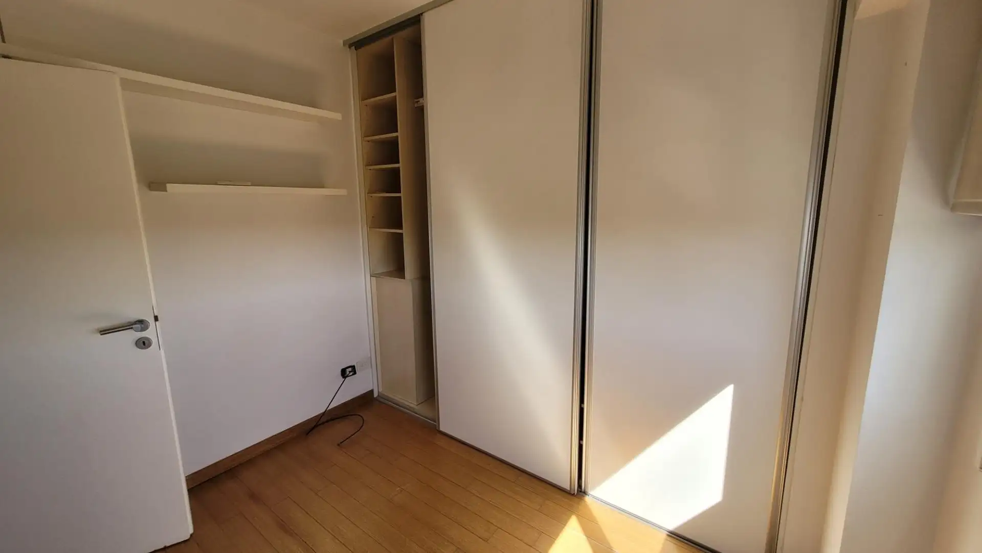 Three-room apartment with a living-dining room with porcelain stoneware floors and access to the first balcony. Separate kitchen with marble countertop, under-counter units and melamine wall cabinets, and an exhaust fan; there is no cooking appliance. First bedroom with floating floors, bed frame and built-in wardrobe, with access to the second balcony; second bedroom with floating floors and a built-in wardrobe. Full bathroom with ceramic tiles, bathtub and shower screen. The unit includes a pa