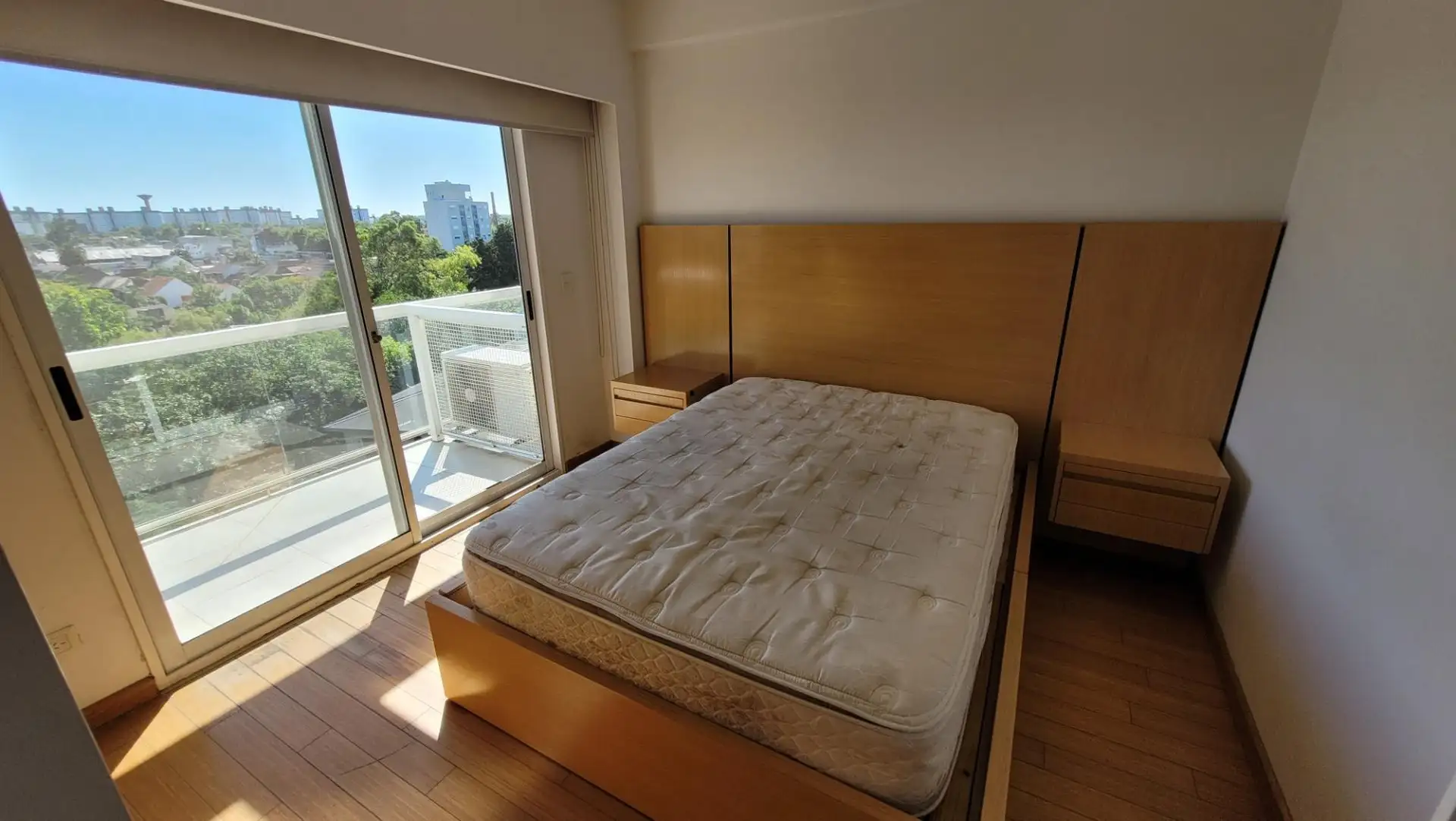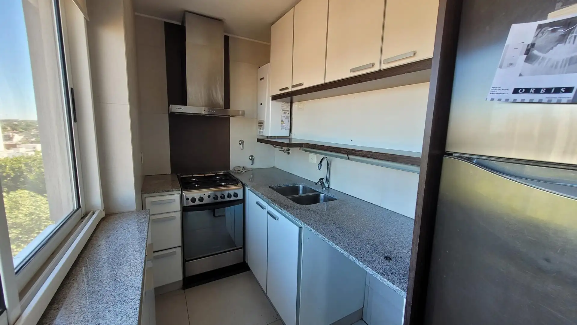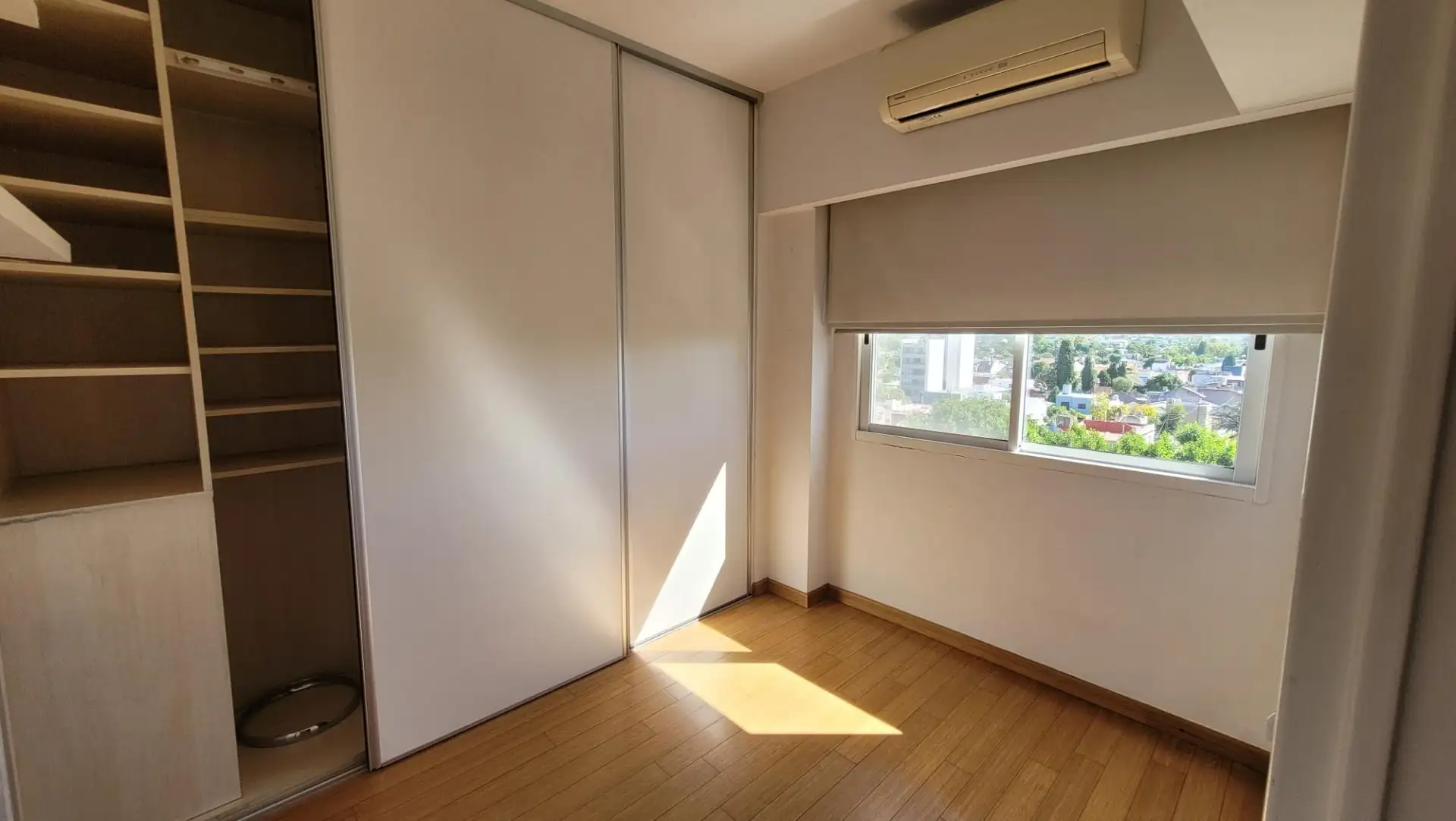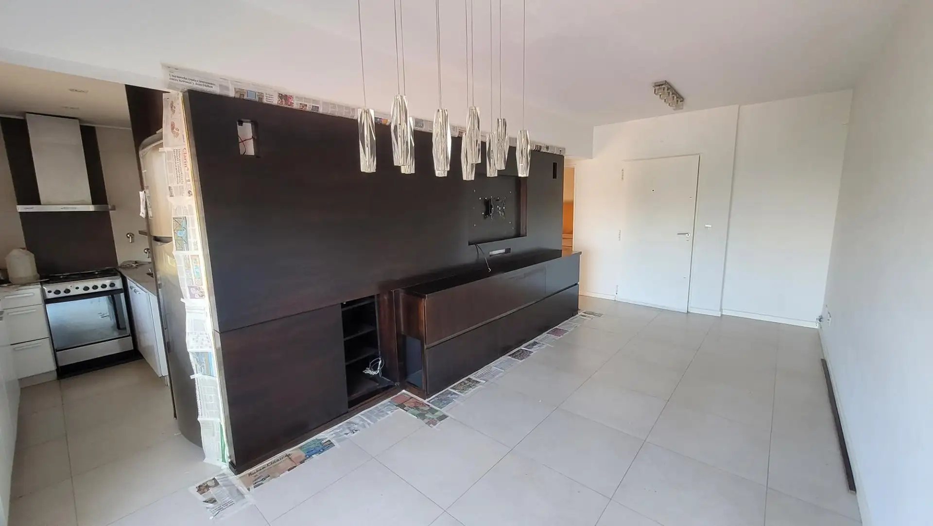 Three-room apartment with a living-dining room with porcelain stoneware floors and access to the first balcony. Separate kitchen with marble countertop, under-counter units and melamine wall cabinets, and an exhaust fan; there is no cooking appliance. First bedroom with floating floors, bed frame and built-in wardrobe, with access to the second balcony; second bedroom with floating floors and a built-in wardrobe. Full bathroom with ceramic tiles, bathtub and shower screen. The unit includes a pa