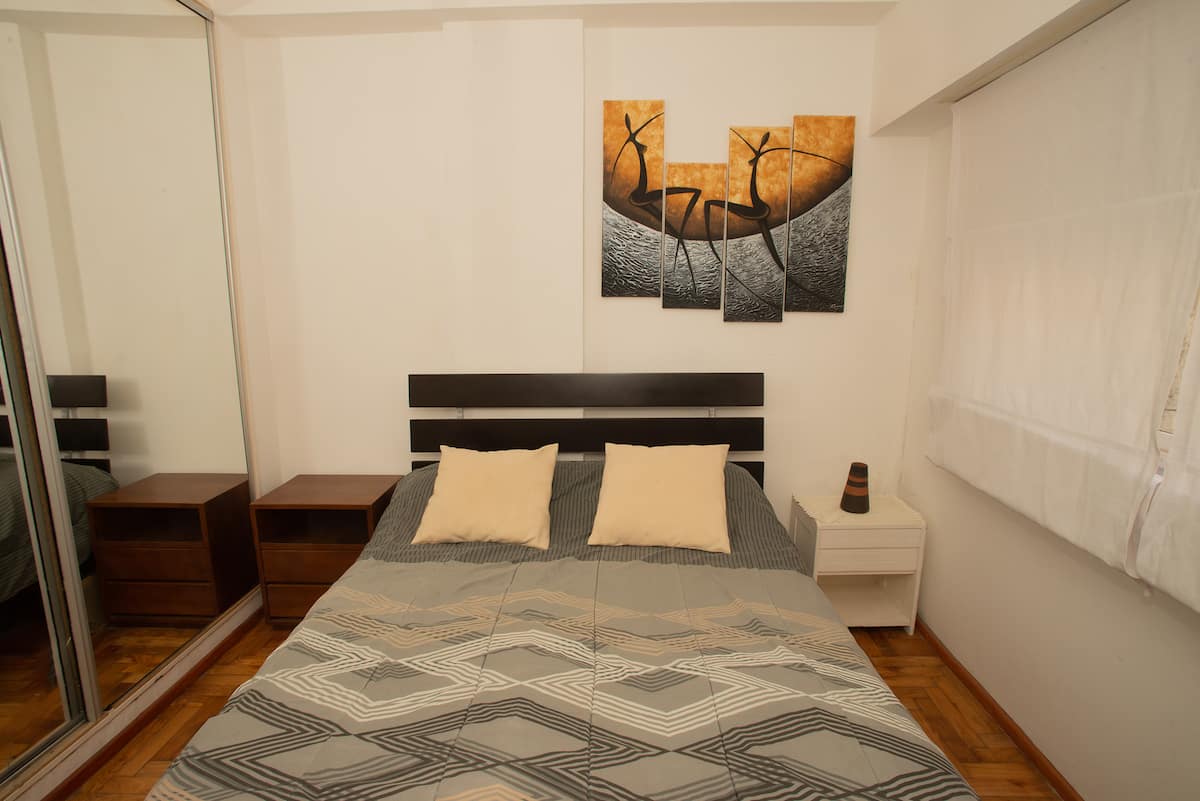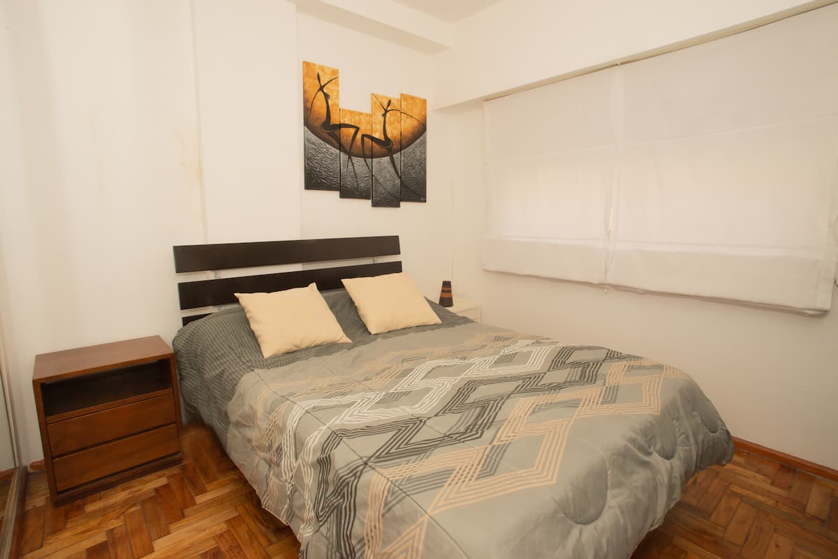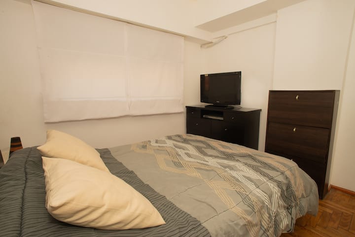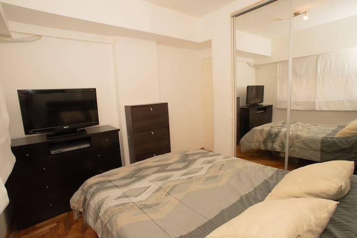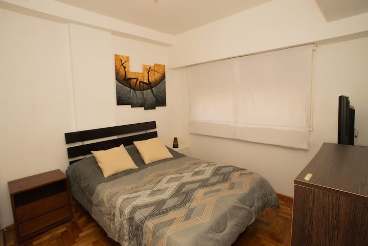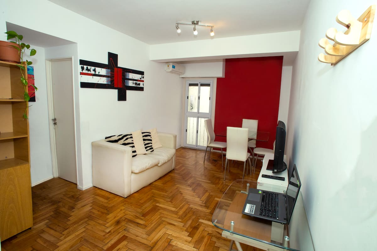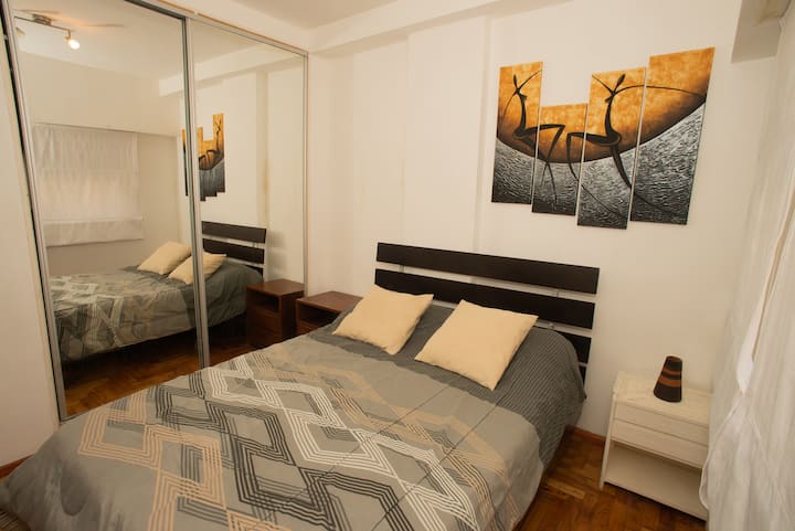 Furnished apartment of 2 bedrooms (3 rooms), with fully equipped kitchen and bathroom. Cable TV in the living room and bedrooms, Wi-Fi, and air conditioning (hot and cold) throughout. Kitchen includes a refrigerator with freezer, microwave oven, and washing machine; hot water is available, and the dining area has a table and chairs for 4 people and a desk. The apartment is in downtown Balvanera, a 5-minute walk from the National Congress and 1 minute from Av. de Mayo.
