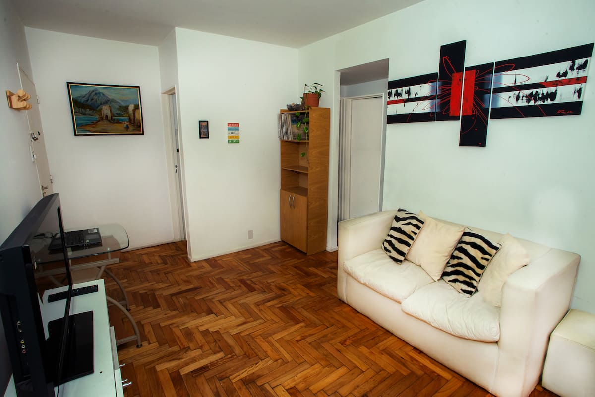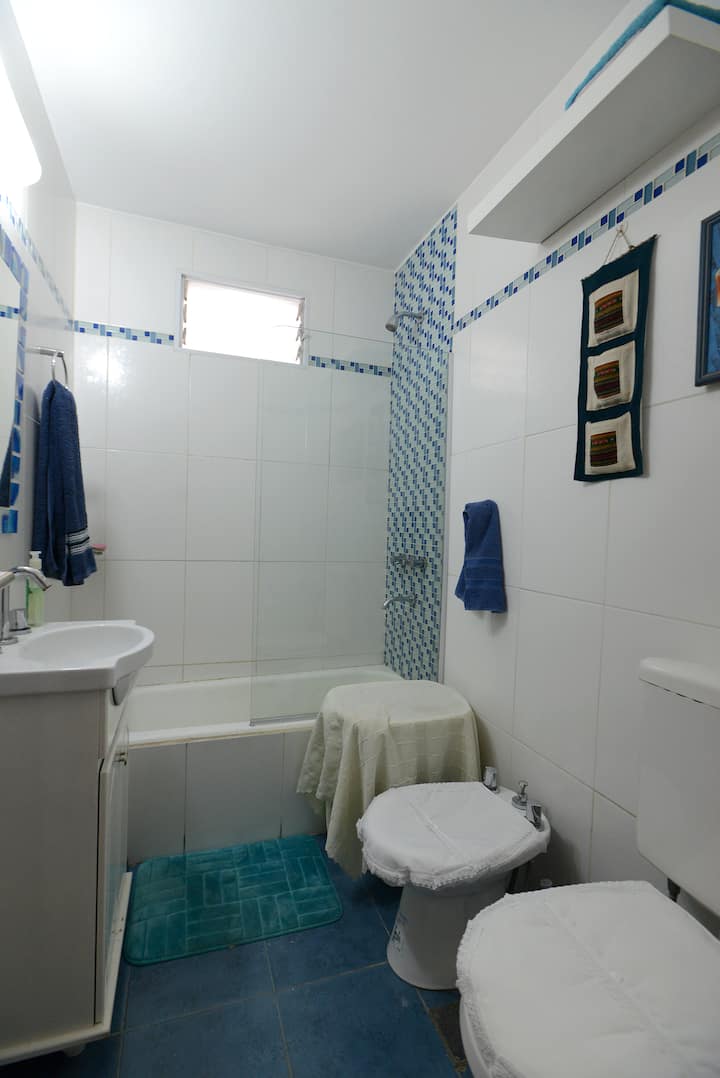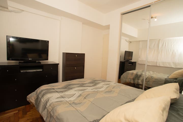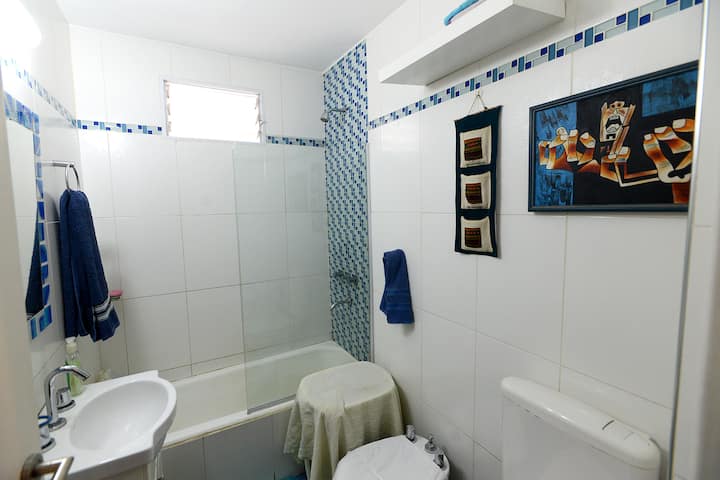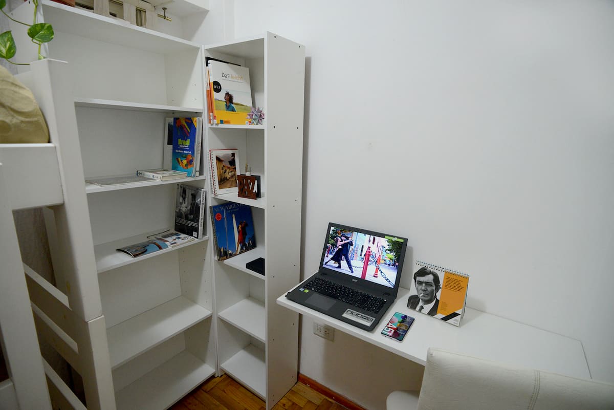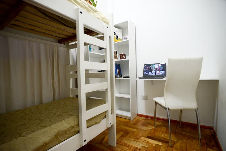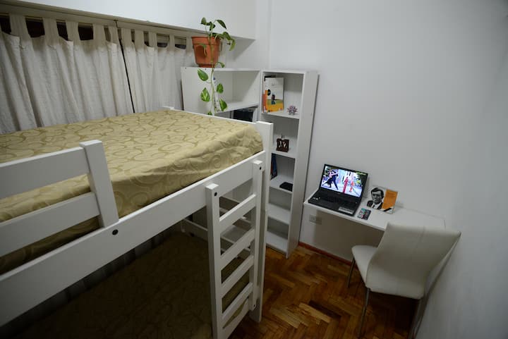 Furnished apartment of 2 bedrooms (3 rooms), with fully equipped kitchen and bathroom. Cable TV in the living room and bedrooms, Wi-Fi, and air conditioning (hot and cold) throughout. Kitchen includes a refrigerator with freezer, microwave oven, and washing machine; hot water is available, and the dining area has a table and chairs for 4 people and a desk. The apartment is in downtown Balvanera, a 5-minute walk from the National Congress and 1 minute from Av. de Mayo.