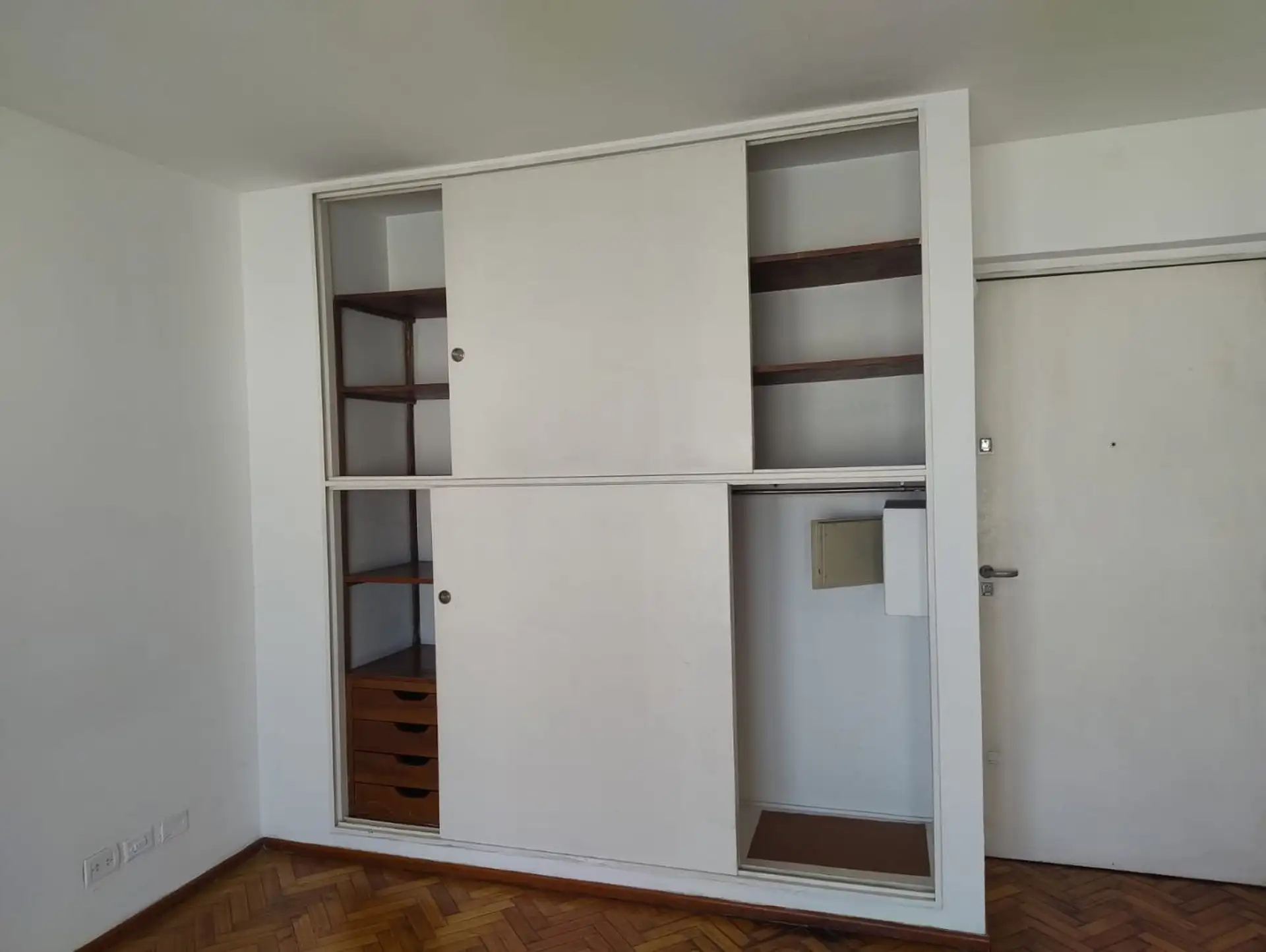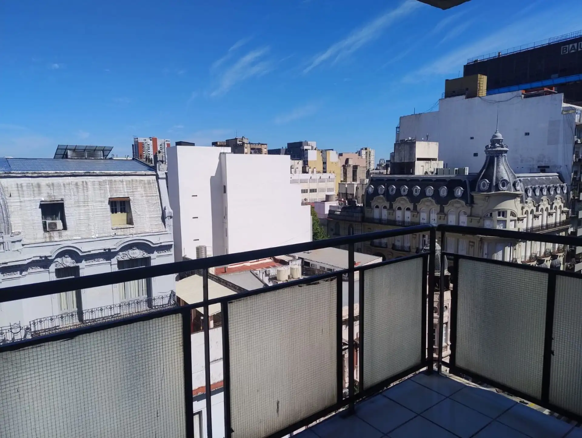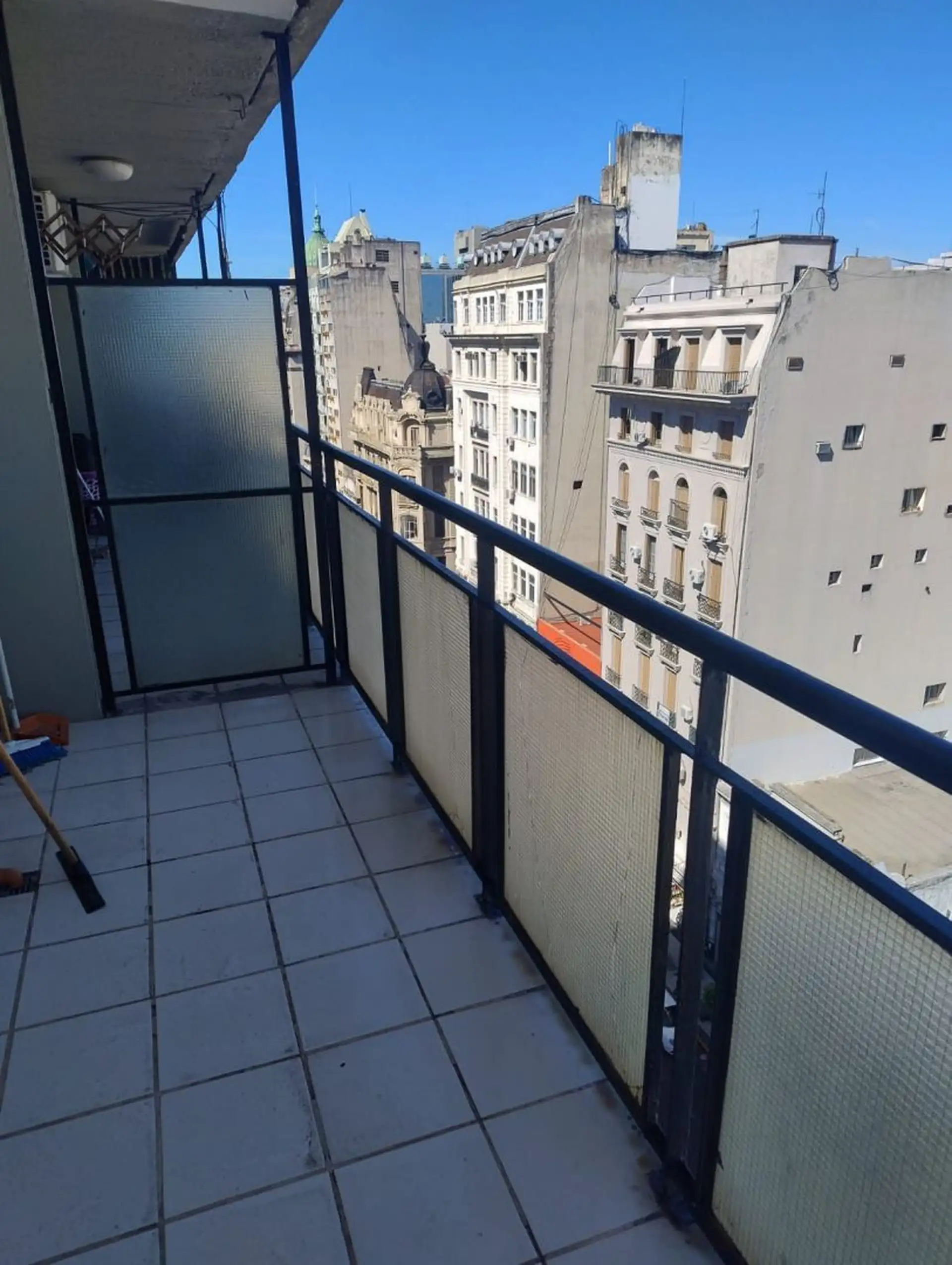 Studio apartment with a terrace-style balcony and panoramic views. Includes a full bathroom and a kitchenette with a fridge. Building has 24-hour security; suitable for professional use. Rental contract is for 12 months, with building fees included.