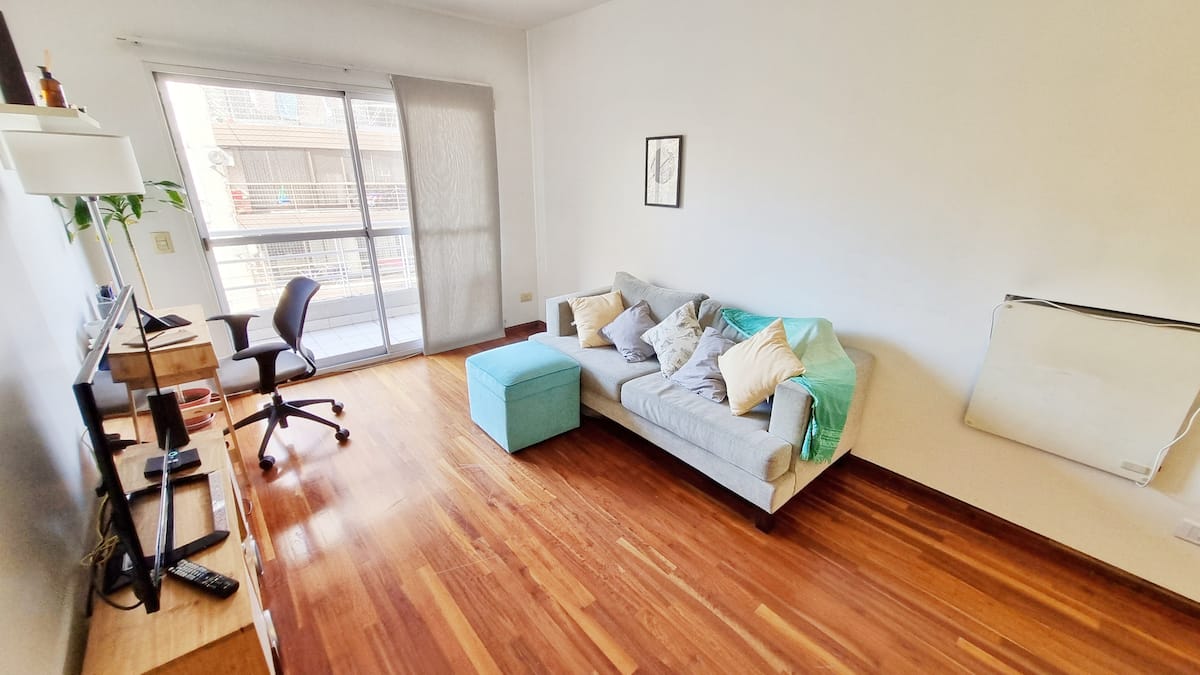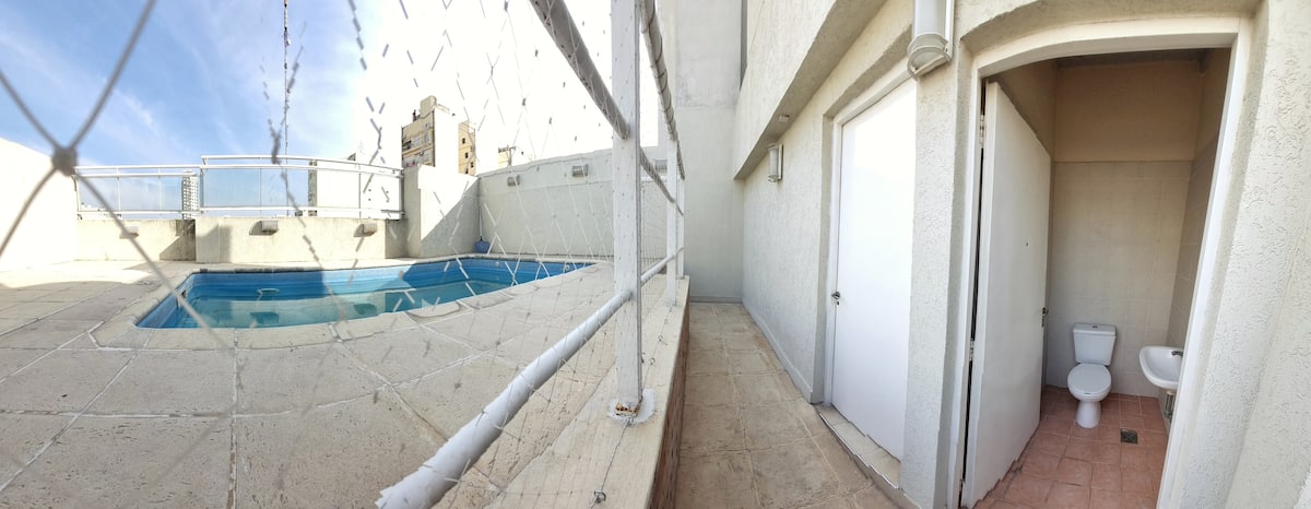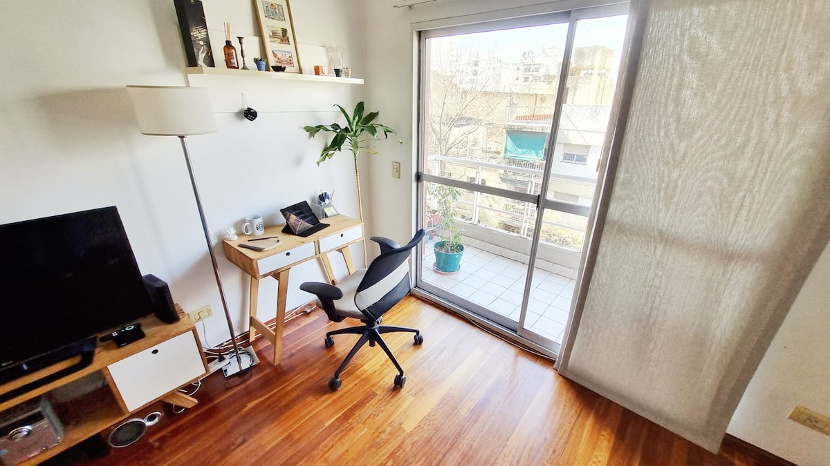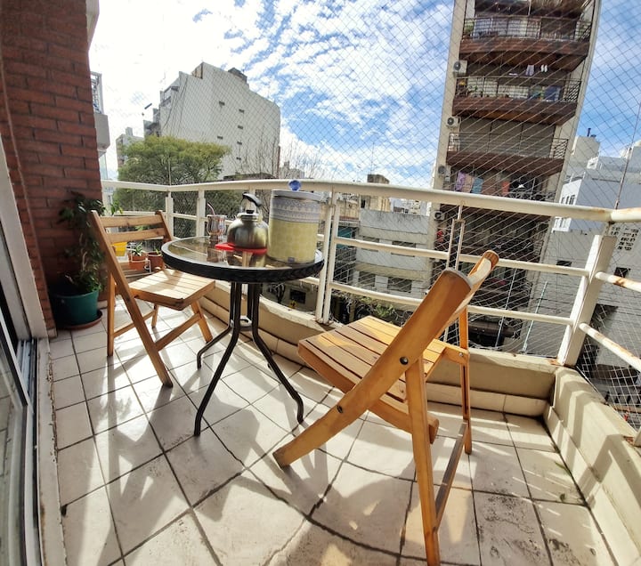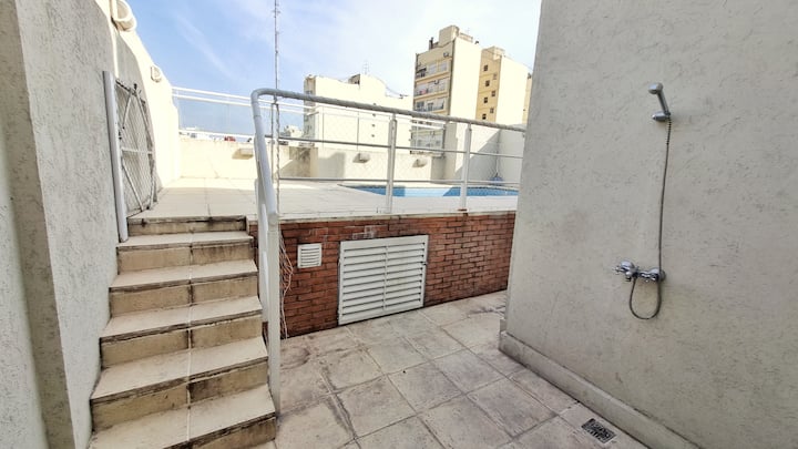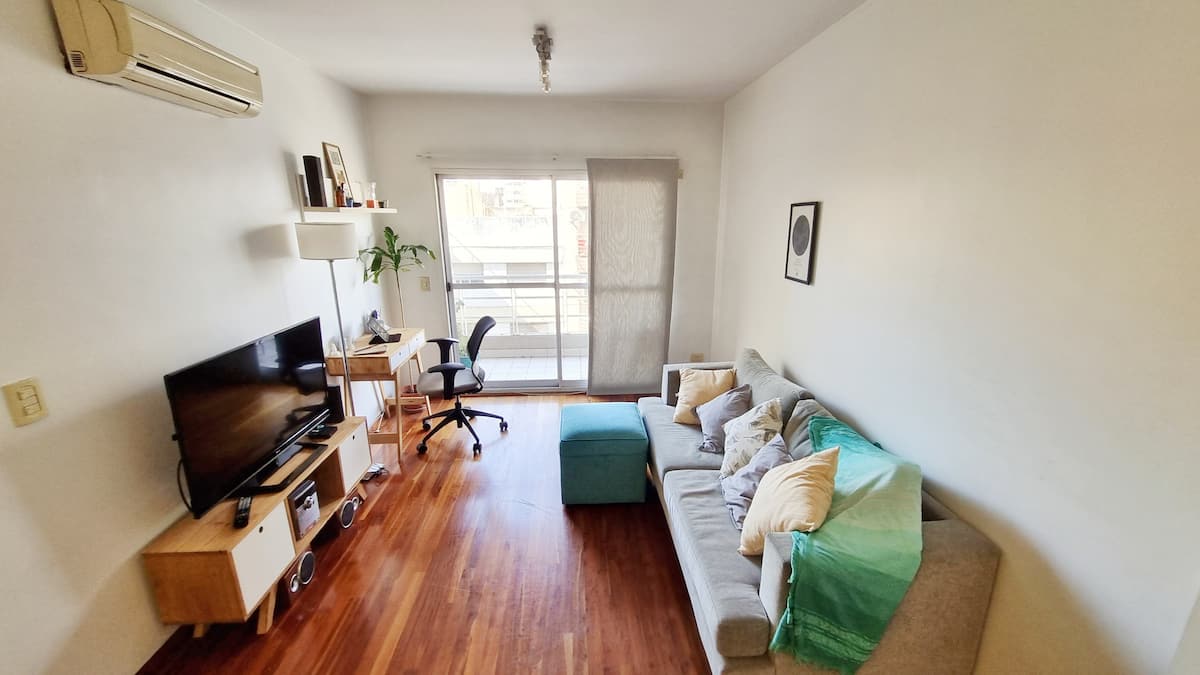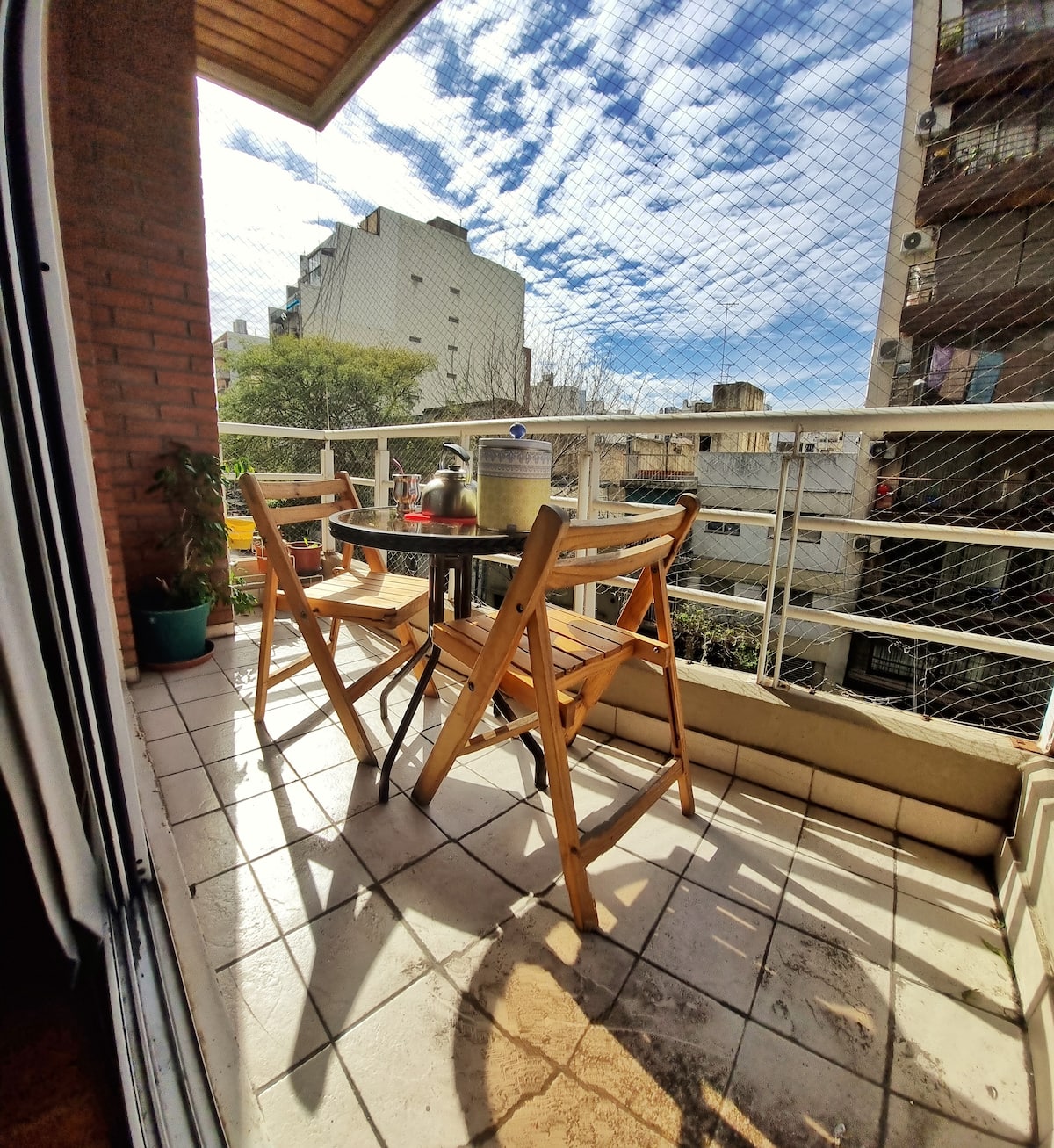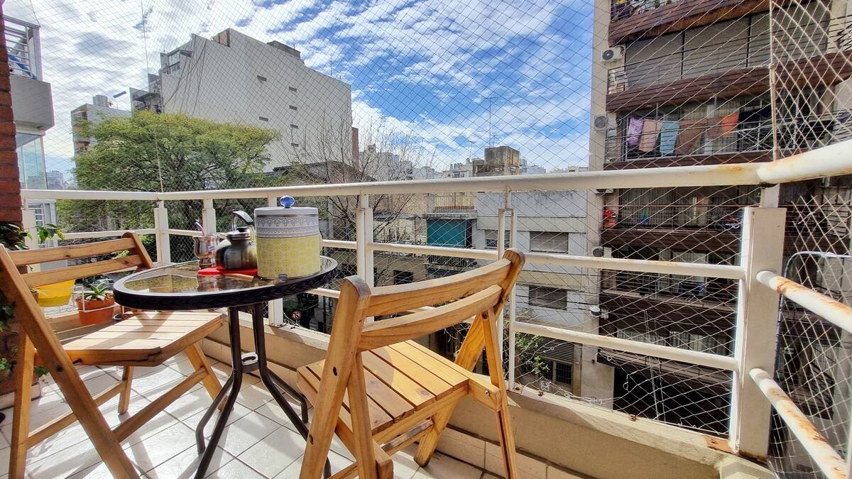 Two-bedroom apartment in Balvanera with a private balcony. The apartment includes a living room, dining room, work area, kitchen with daily dining area, a laundry room and 1 bathroom with a bathtub. It is fully furnished and equipped with air conditioning in both bedrooms and the living room; gas oven and microwave in the kitchen; smart TVs in the bedrooms and living room; and a dining table for 4 to 6. The building has a shared terrace with a pool, bathroom, outdoor shower, a multi-use room wit