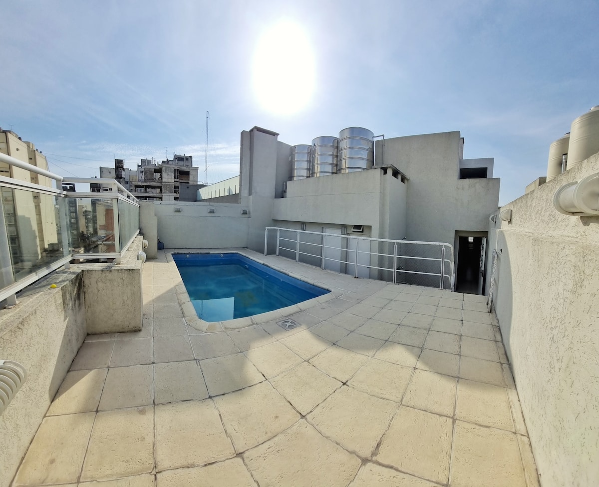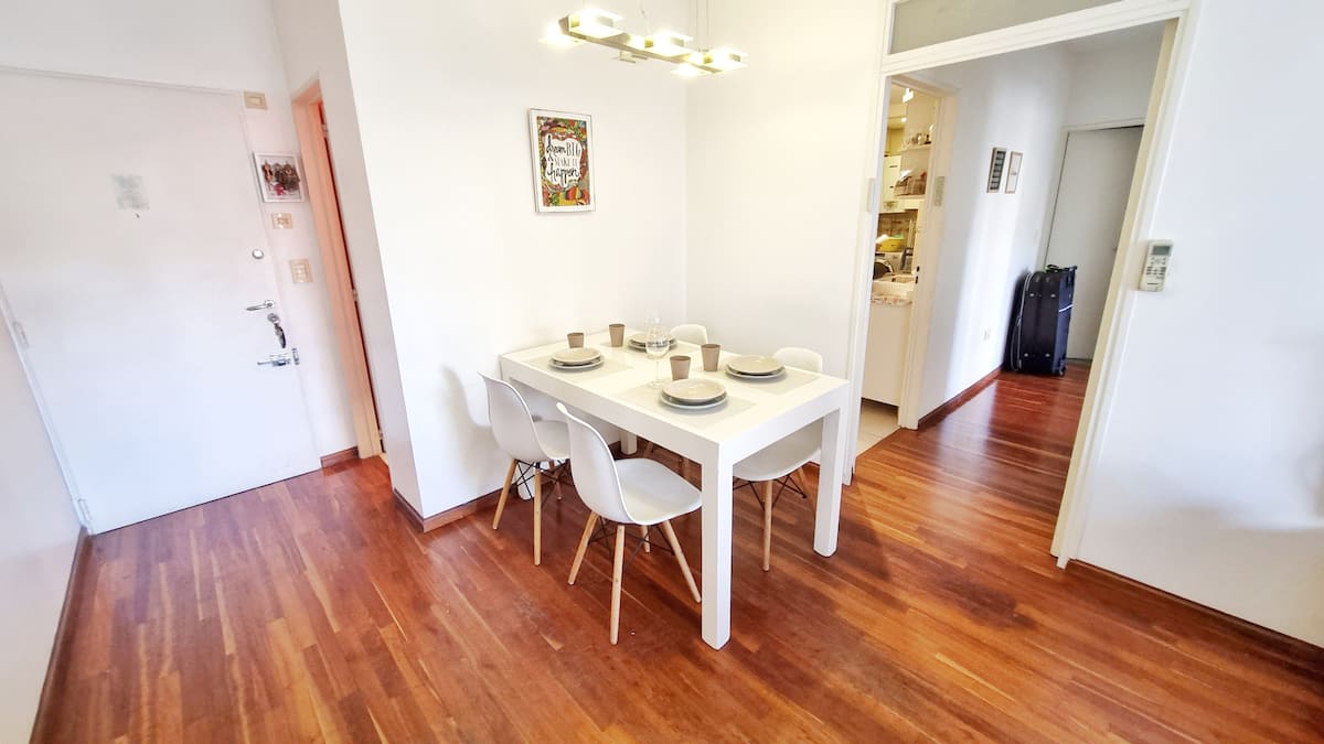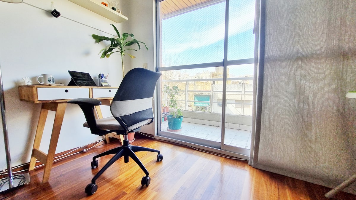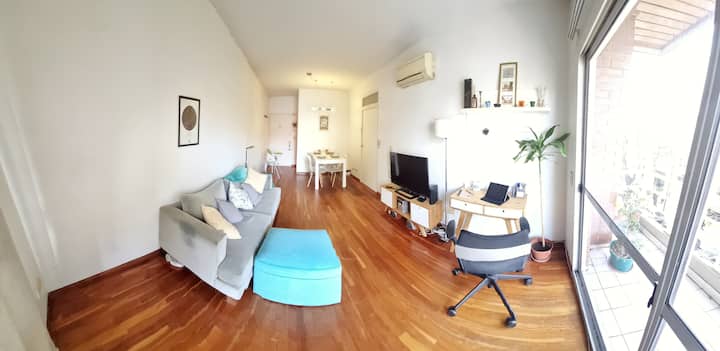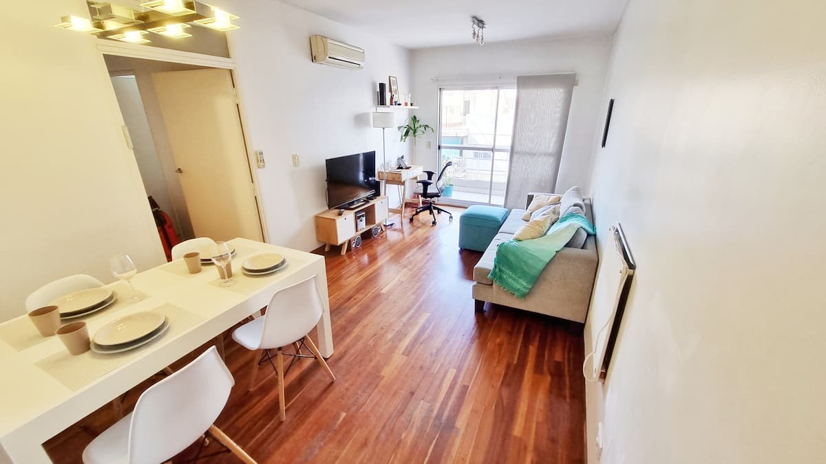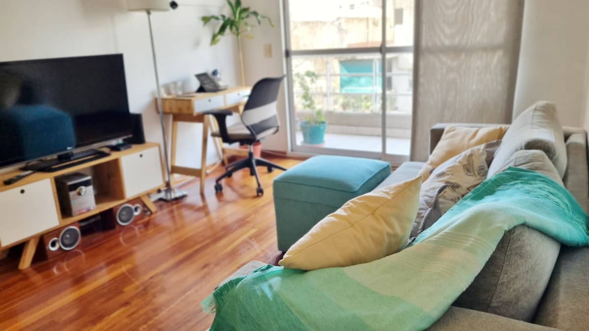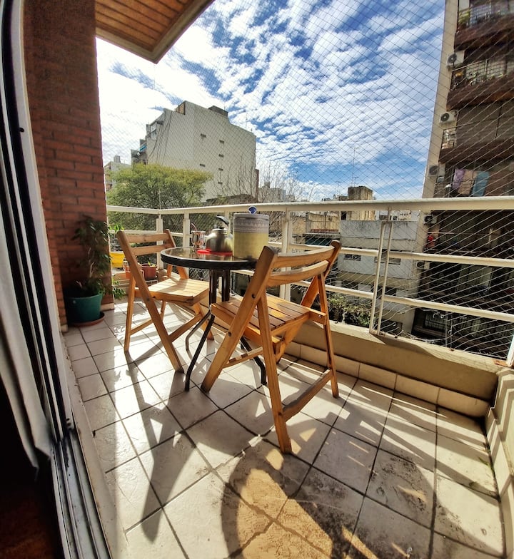 Two-bedroom apartment in Balvanera with a private balcony. The apartment includes a living room, dining room, work area, kitchen with daily dining area, a laundry room and 1 bathroom with a bathtub. It is fully furnished and equipped with air conditioning in both bedrooms and the living room; gas oven and microwave in the kitchen; smart TVs in the bedrooms and living room; and a dining table for 4 to 6. The building has a shared terrace with a pool, bathroom, outdoor shower, a multi-use room wit