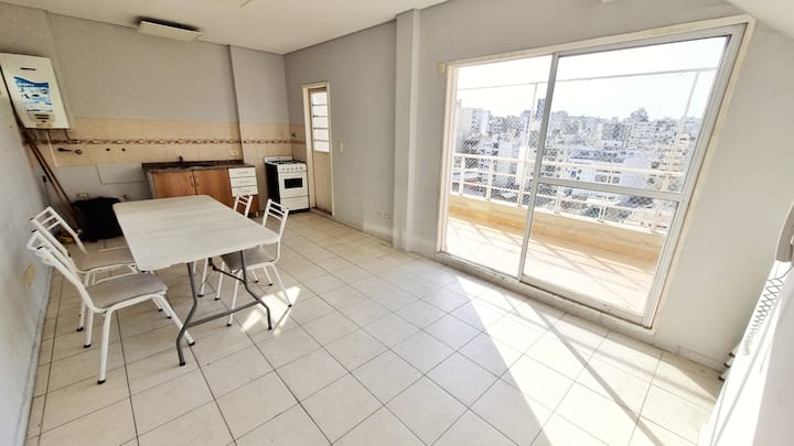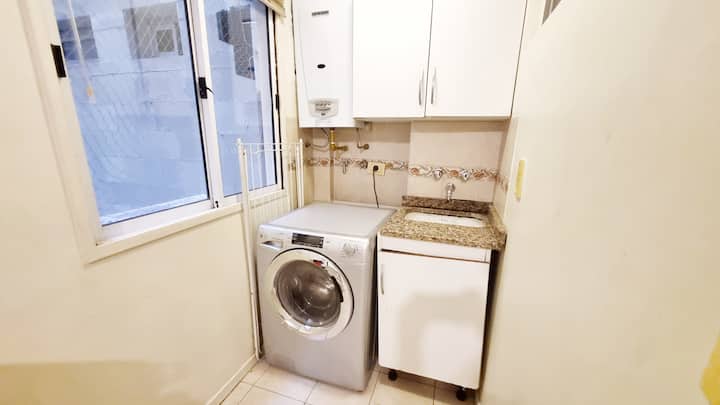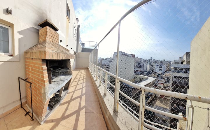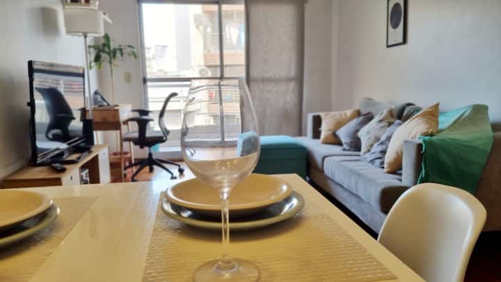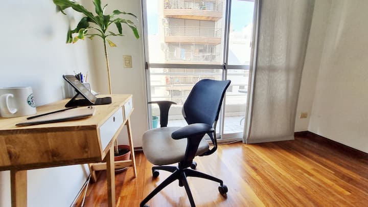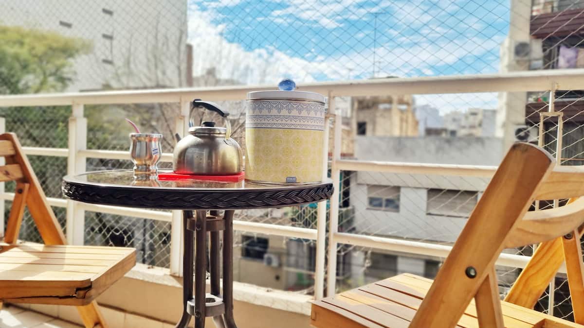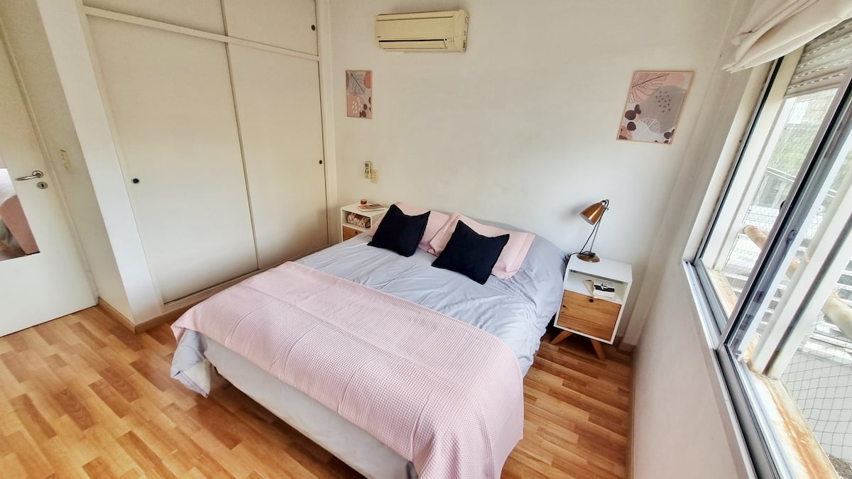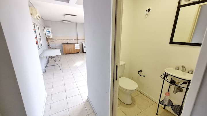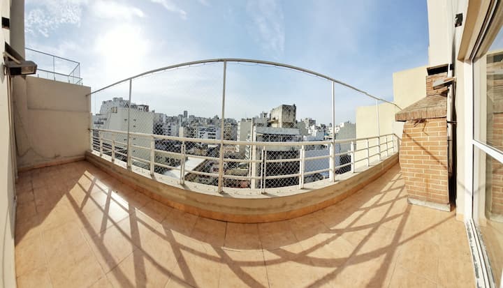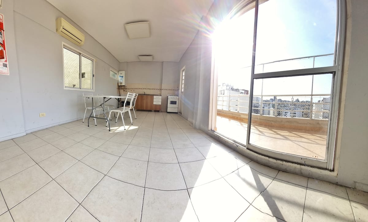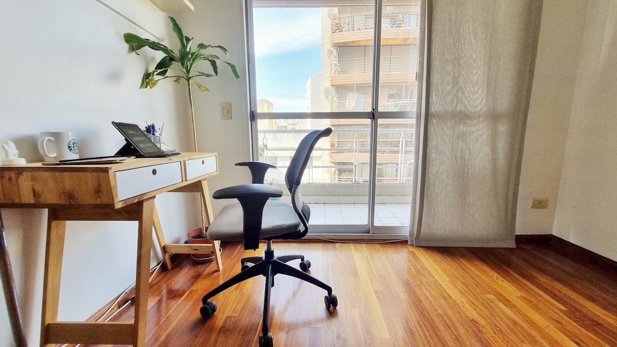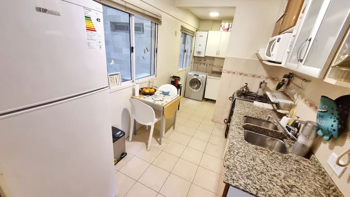 Two-bedroom apartment in Balvanera with a private balcony. The apartment includes a living room, dining room, work area, kitchen with daily dining area, a laundry room and 1 bathroom with a bathtub. It is fully furnished and equipped with air conditioning in both bedrooms and the living room; gas oven and microwave in the kitchen; smart TVs in the bedrooms and living room; and a dining table for 4 to 6. The building has a shared terrace with a pool, bathroom, outdoor shower, a multi-use room wit