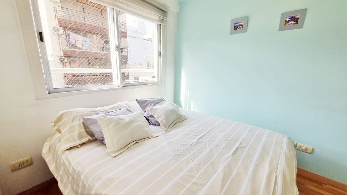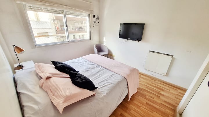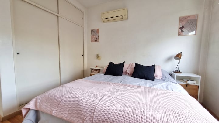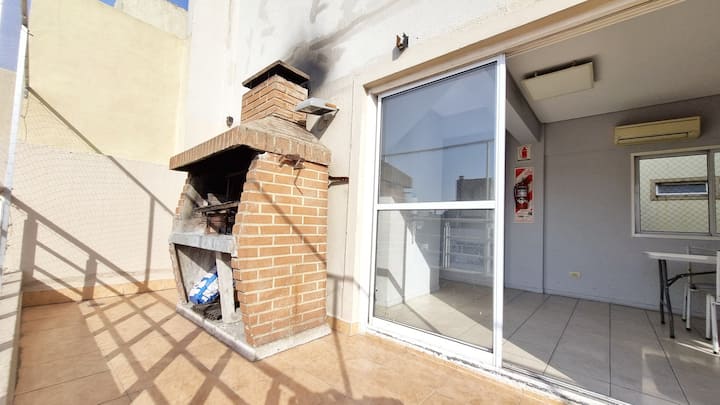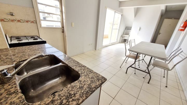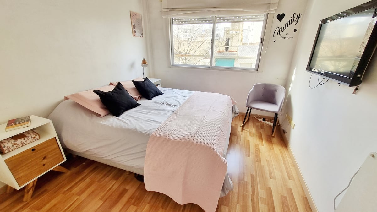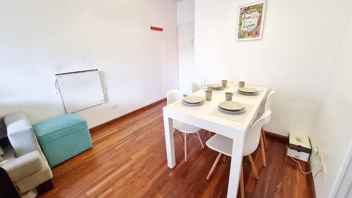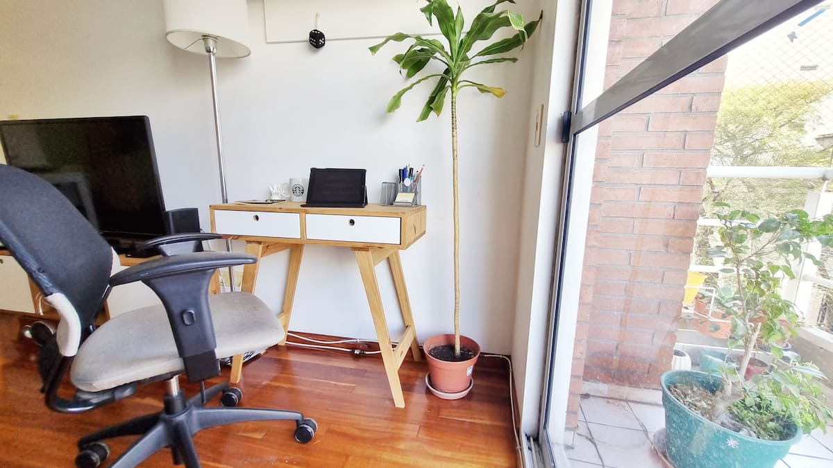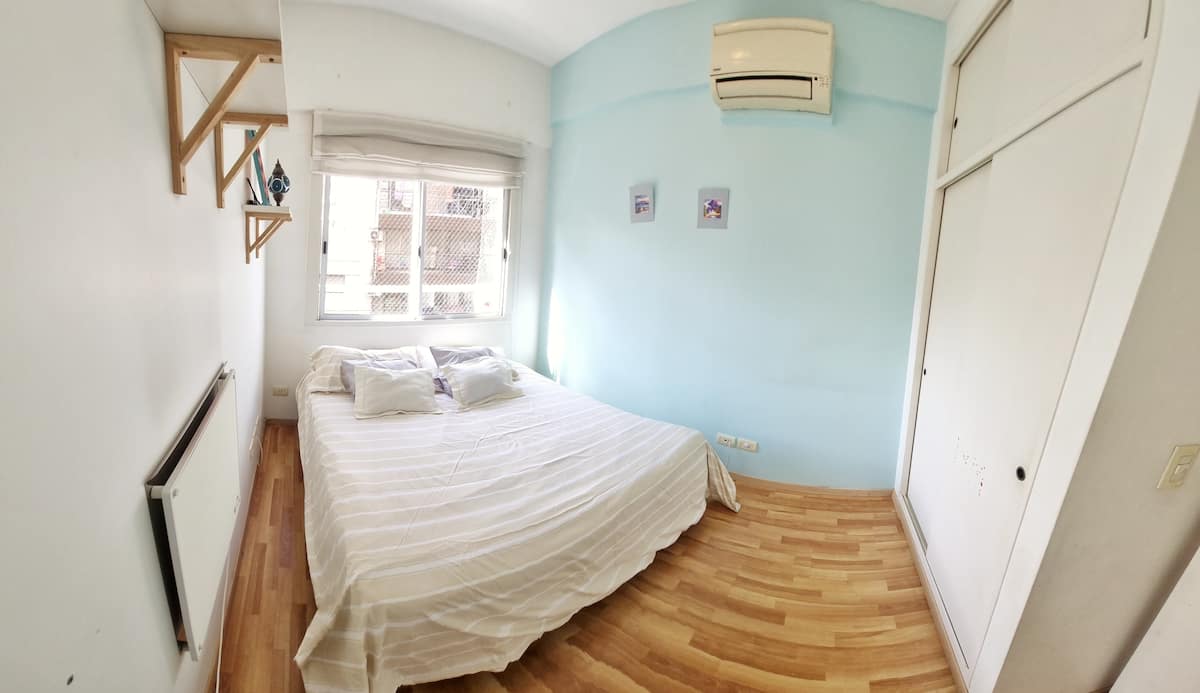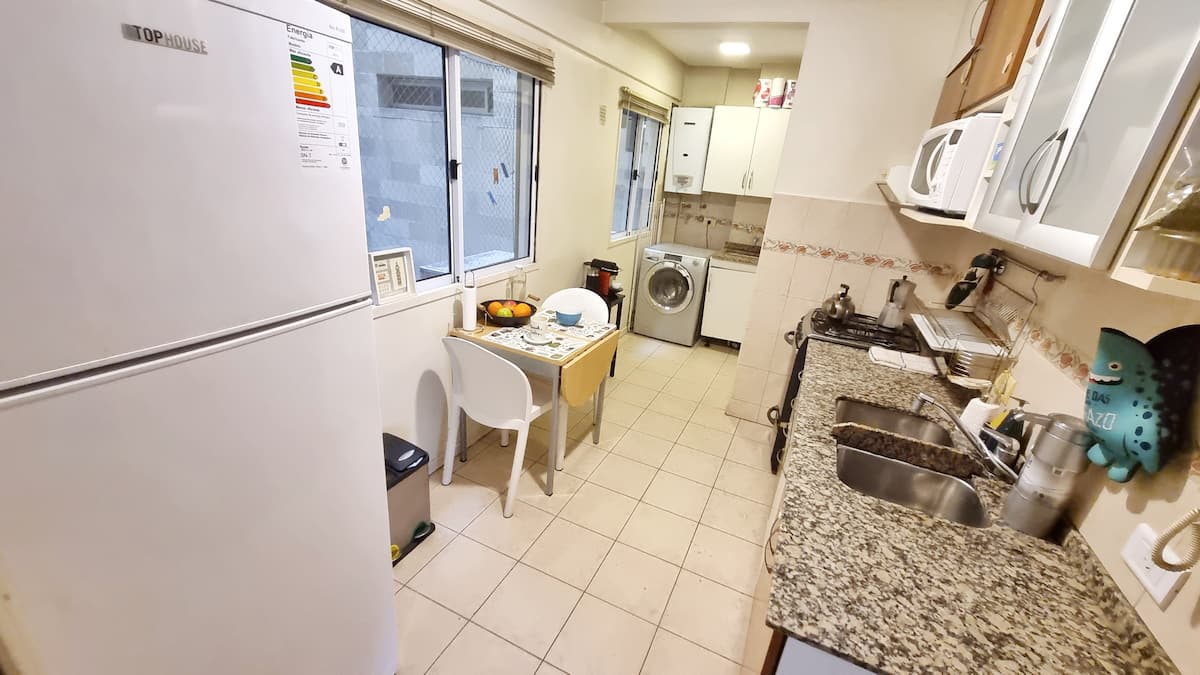 Two-bedroom apartment in Balvanera with a private balcony. The apartment includes a living room, dining room, work area, kitchen with daily dining area, a laundry room and 1 bathroom with a bathtub. It is fully furnished and equipped with air conditioning in both bedrooms and the living room; gas oven and microwave in the kitchen; smart TVs in the bedrooms and living room; and a dining table for 4 to 6. The building has a shared terrace with a pool, bathroom, outdoor shower, a multi-use room wit