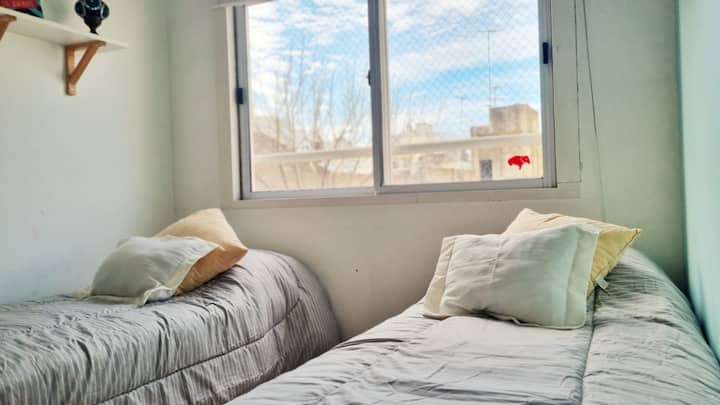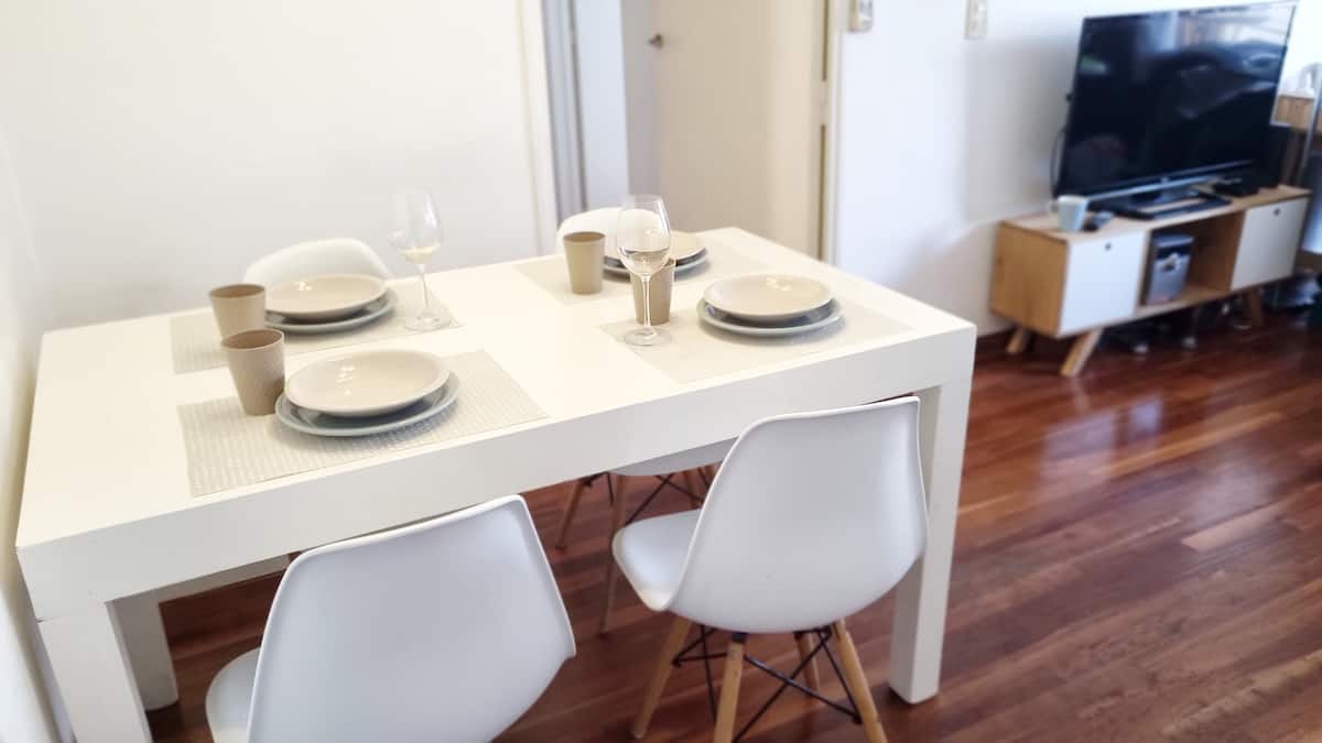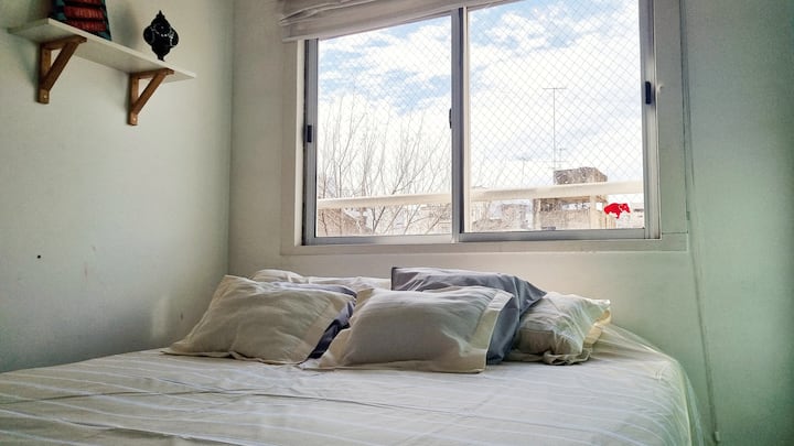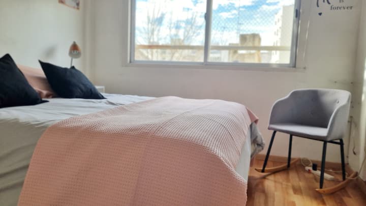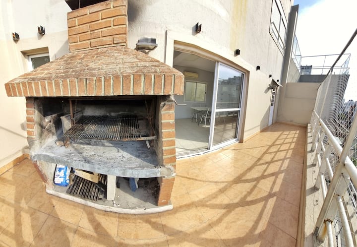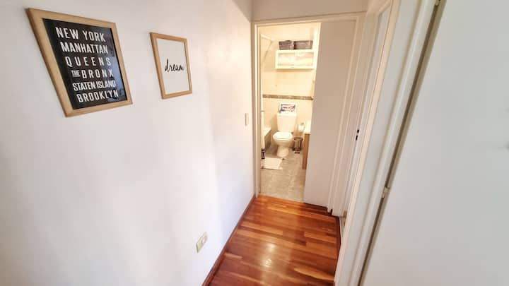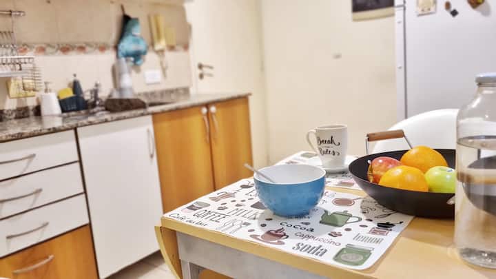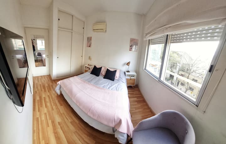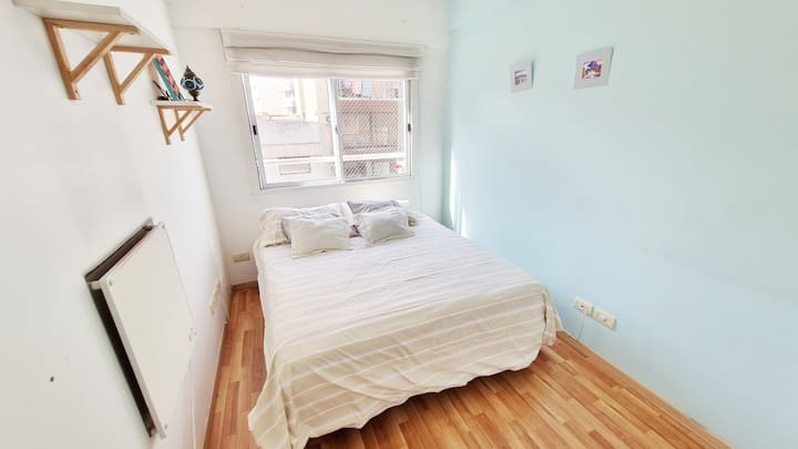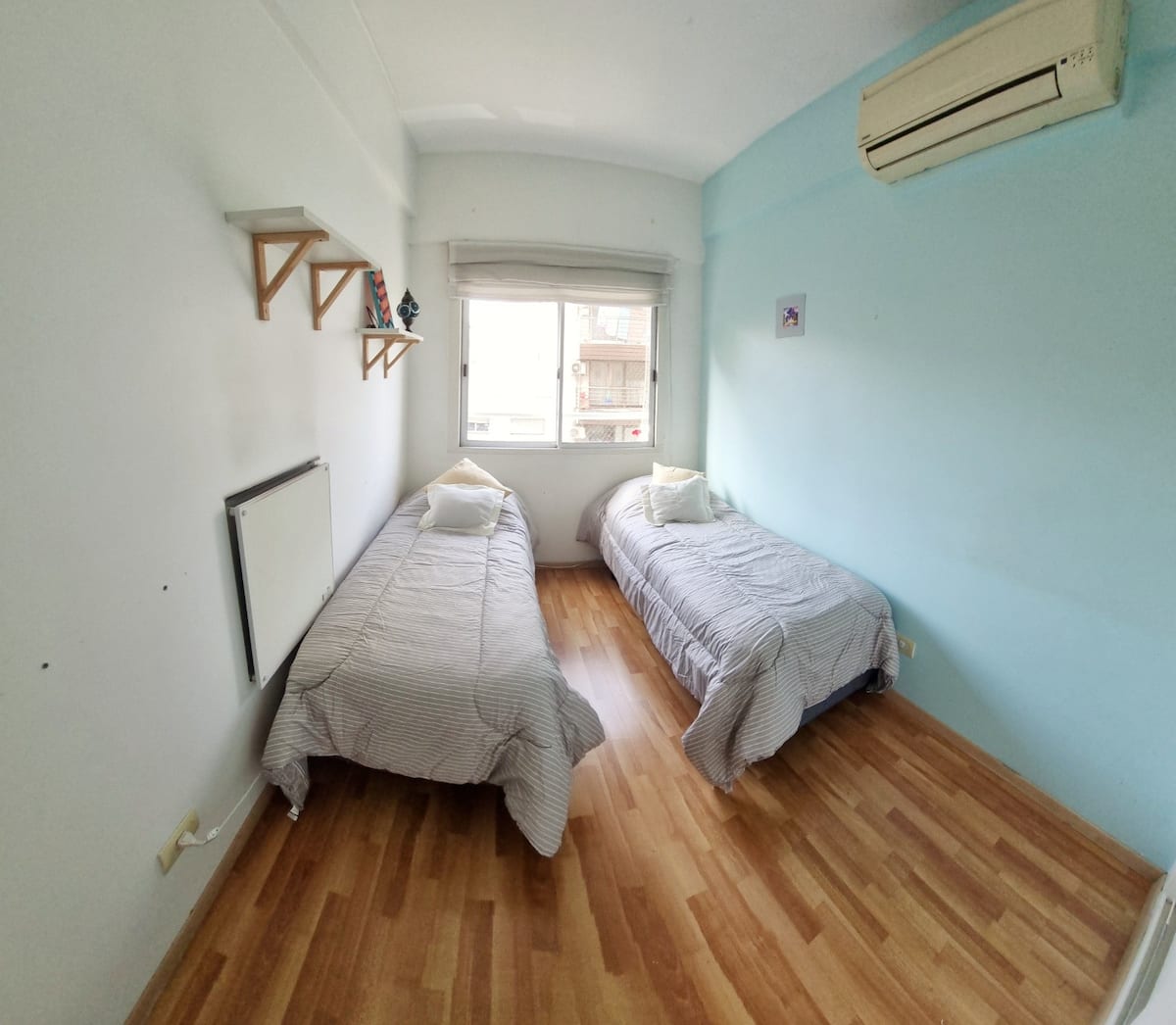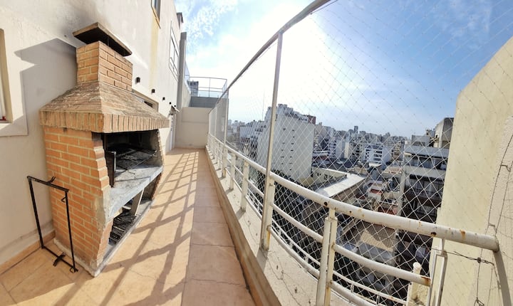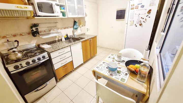 Two-bedroom apartment in Balvanera with a private balcony. The apartment includes a living room, dining room, work area, kitchen with daily dining area, a laundry room and 1 bathroom with a bathtub. It is fully furnished and equipped with air conditioning in both bedrooms and the living room; gas oven and microwave in the kitchen; smart TVs in the bedrooms and living room; and a dining table for 4 to 6. The building has a shared terrace with a pool, bathroom, outdoor shower, a multi-use room wit