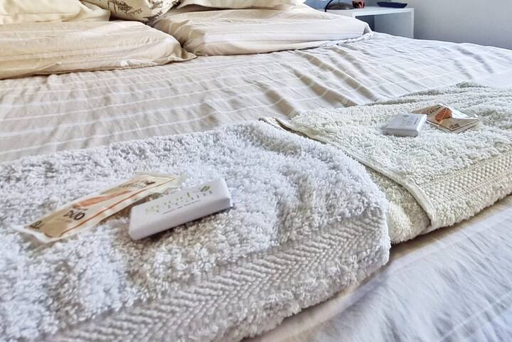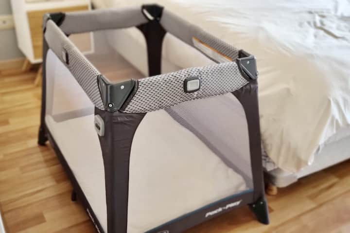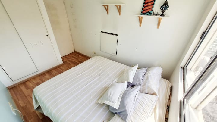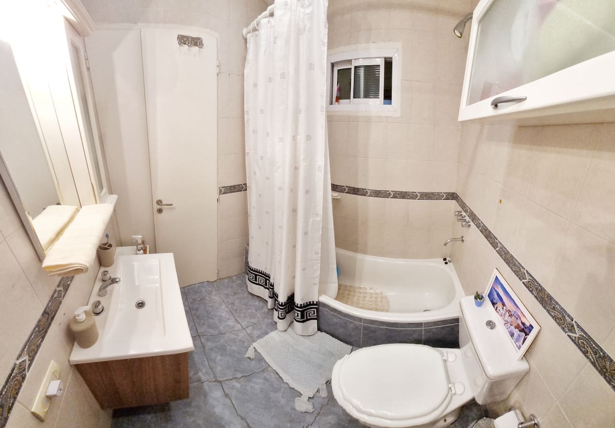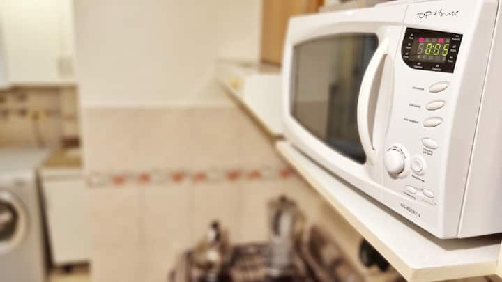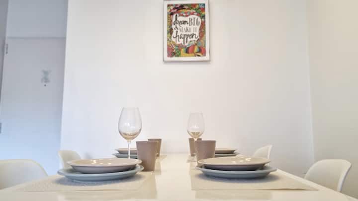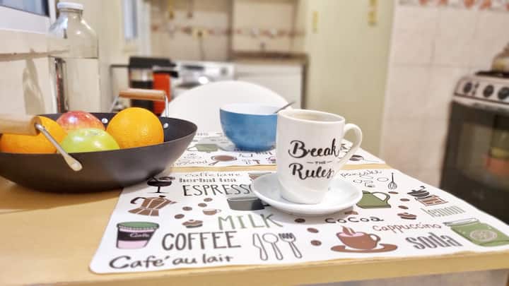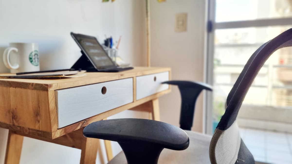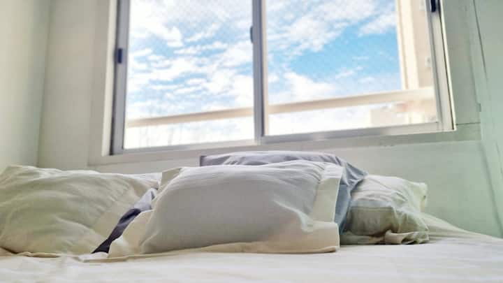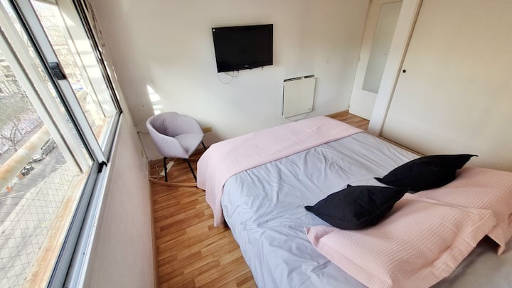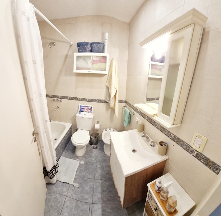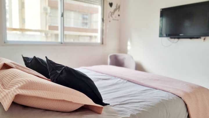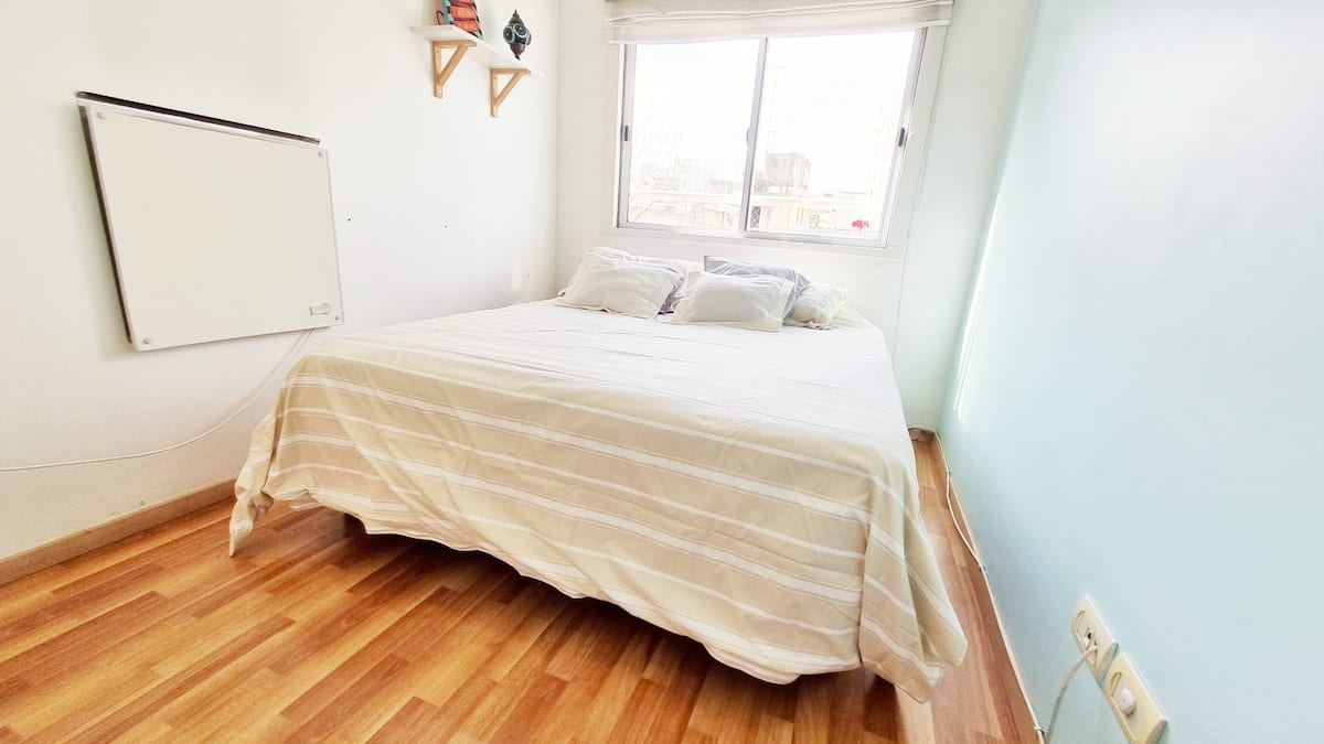 Two-bedroom apartment in Balvanera with a private balcony. The apartment includes a living room, dining room, work area, kitchen with daily dining area, a laundry room and 1 bathroom with a bathtub. It is fully furnished and equipped with air conditioning in both bedrooms and the living room; gas oven and microwave in the kitchen; smart TVs in the bedrooms and living room; and a dining table for 4 to 6. The building has a shared terrace with a pool, bathroom, outdoor shower, a multi-use room wit