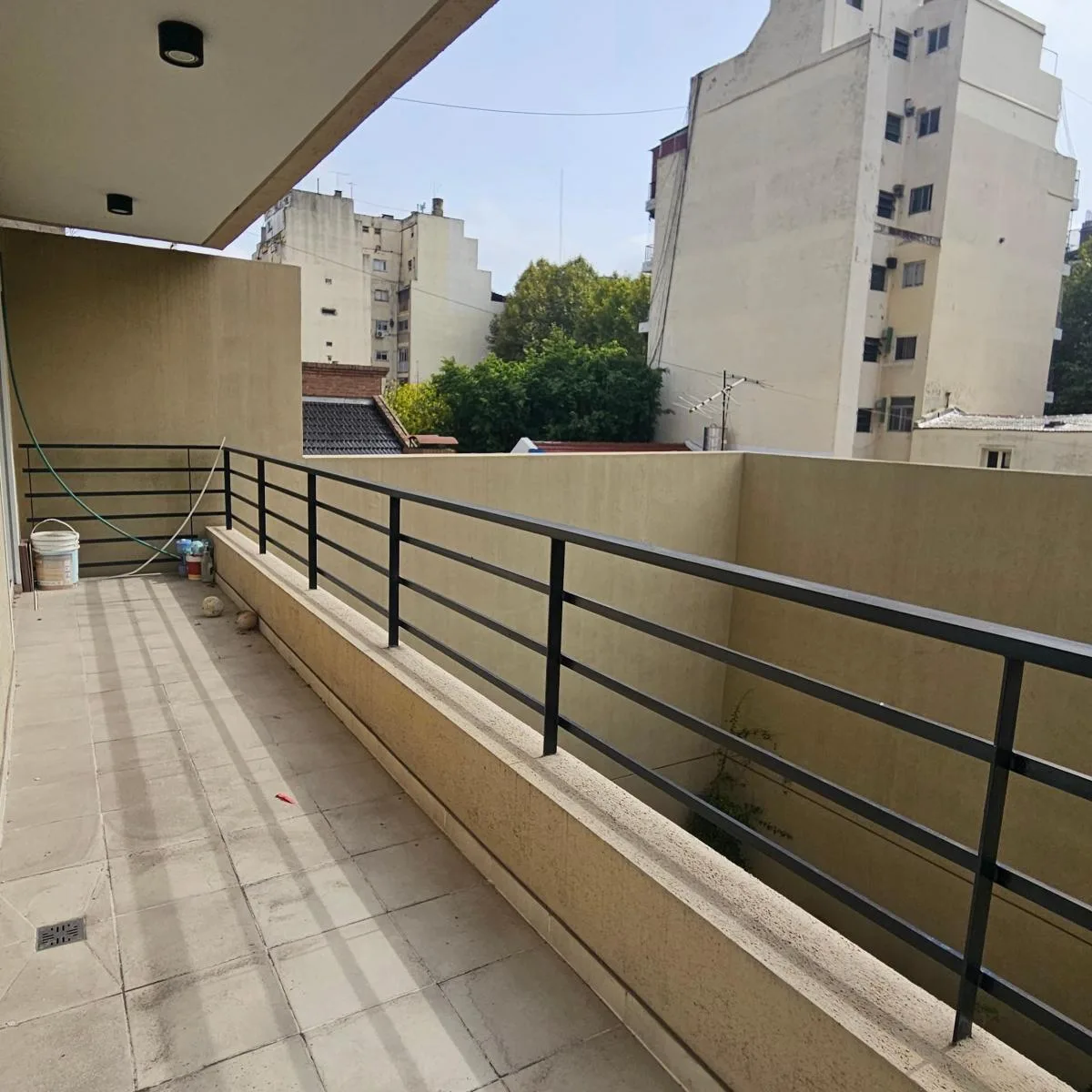 Three-room apartment in Barracas with 2 bedrooms and 2 full bathrooms. The unit is 3 years old, with porcelain tile floors and a gas stove and cooking. There is a long balcony at the rear and a courtyard-facing (contrafrente) layout.