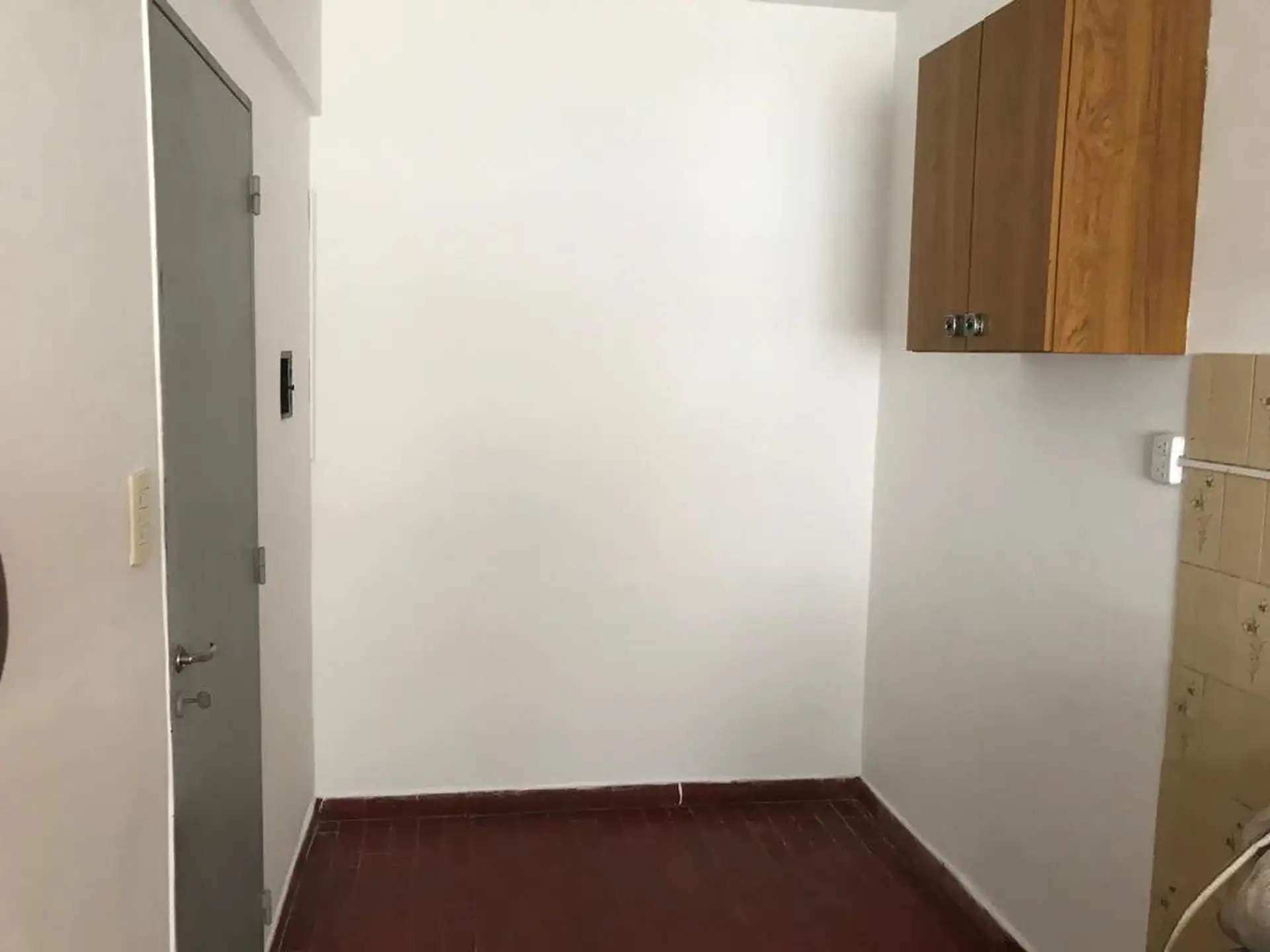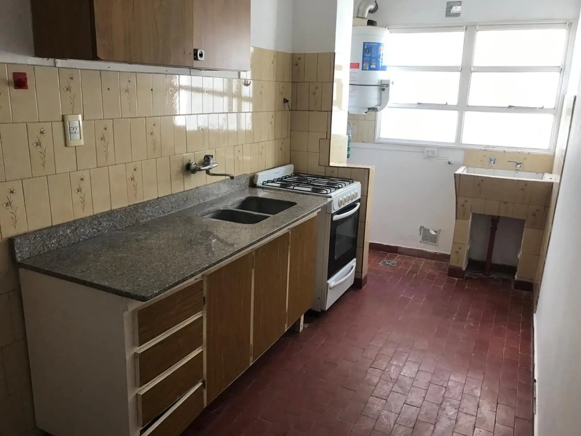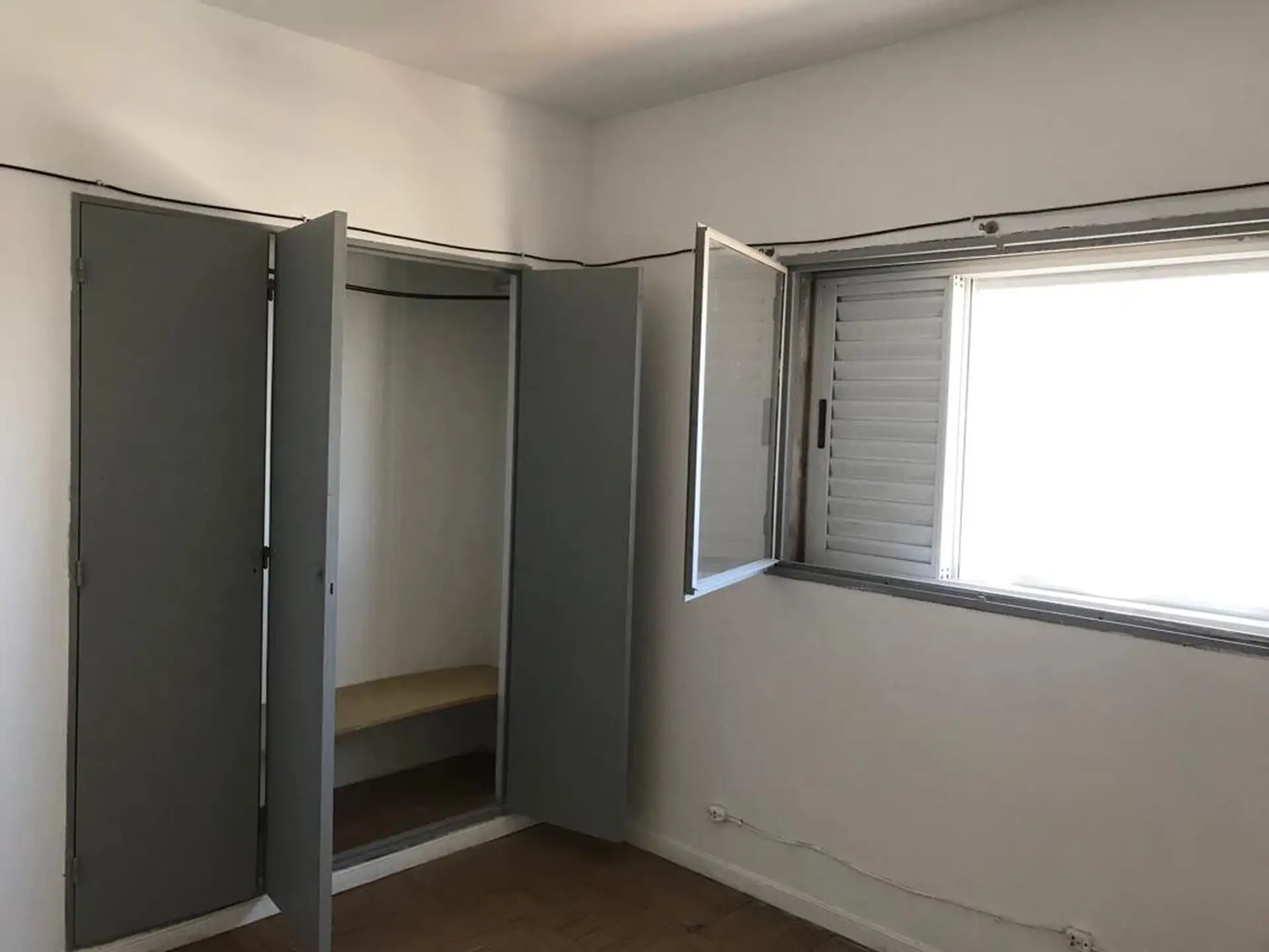 Centrally located two-bedroom apartment for rent from May. It includes a living-dining room with TB space heater, a kitchen with laundry area, a hot water tank (termotanque), two bedrooms with built-in wardrobes, and a full bathroom with shower. It has screens and blinds. Rental price is $700,000, with estimated building fees (expensas) of $79,000 plus ABSA, municipal taxes and utilities; pets are not accepted.