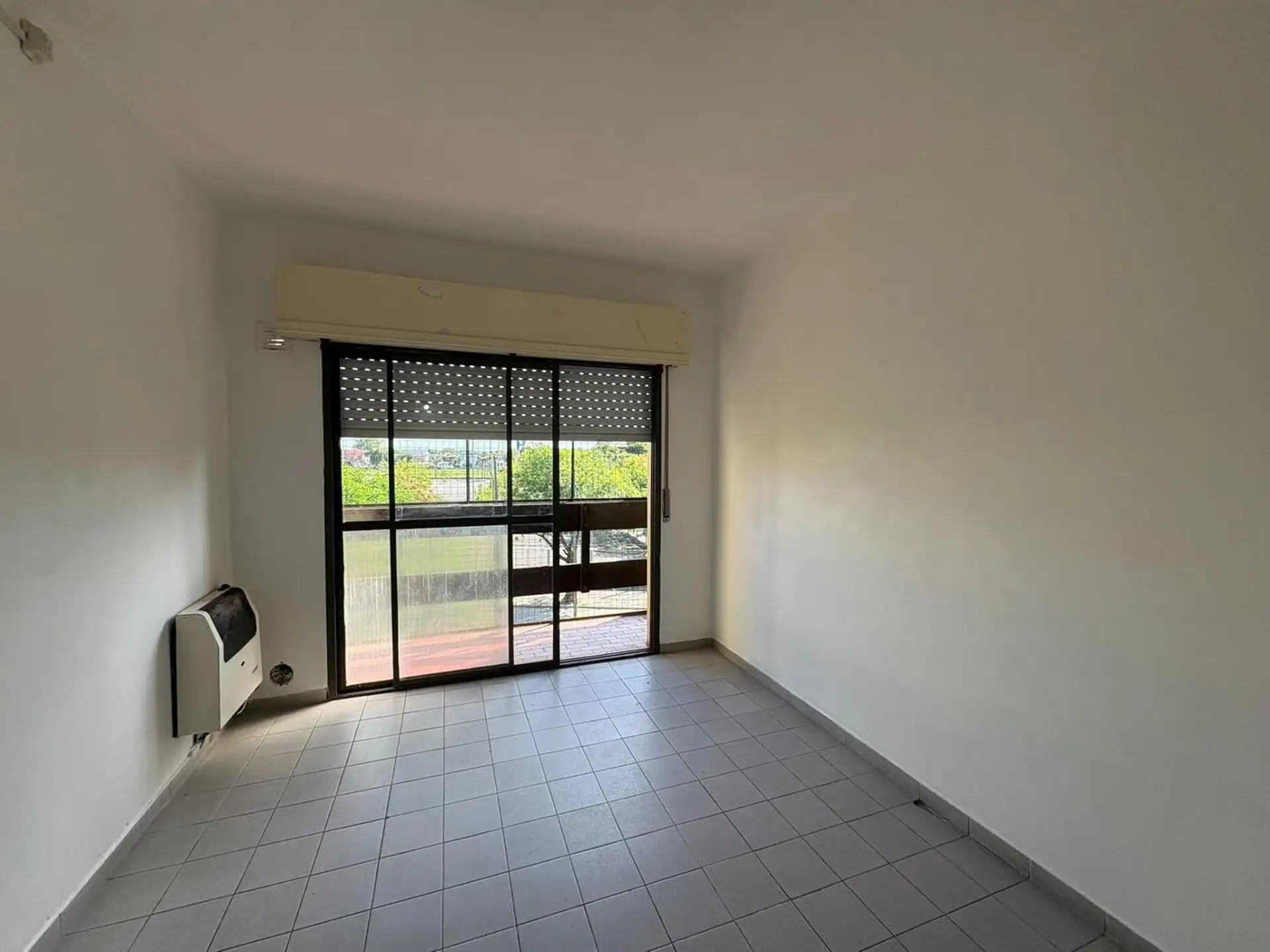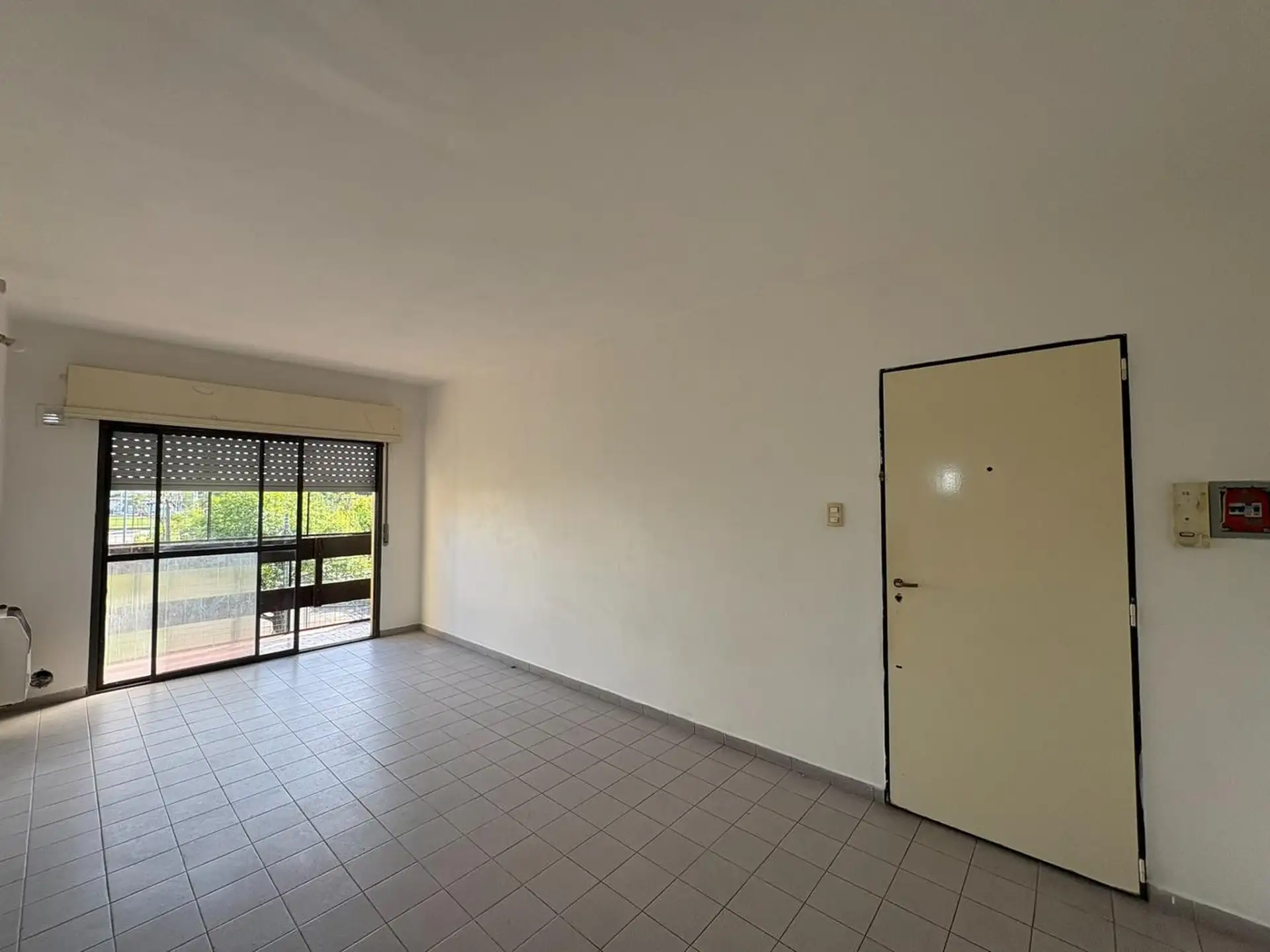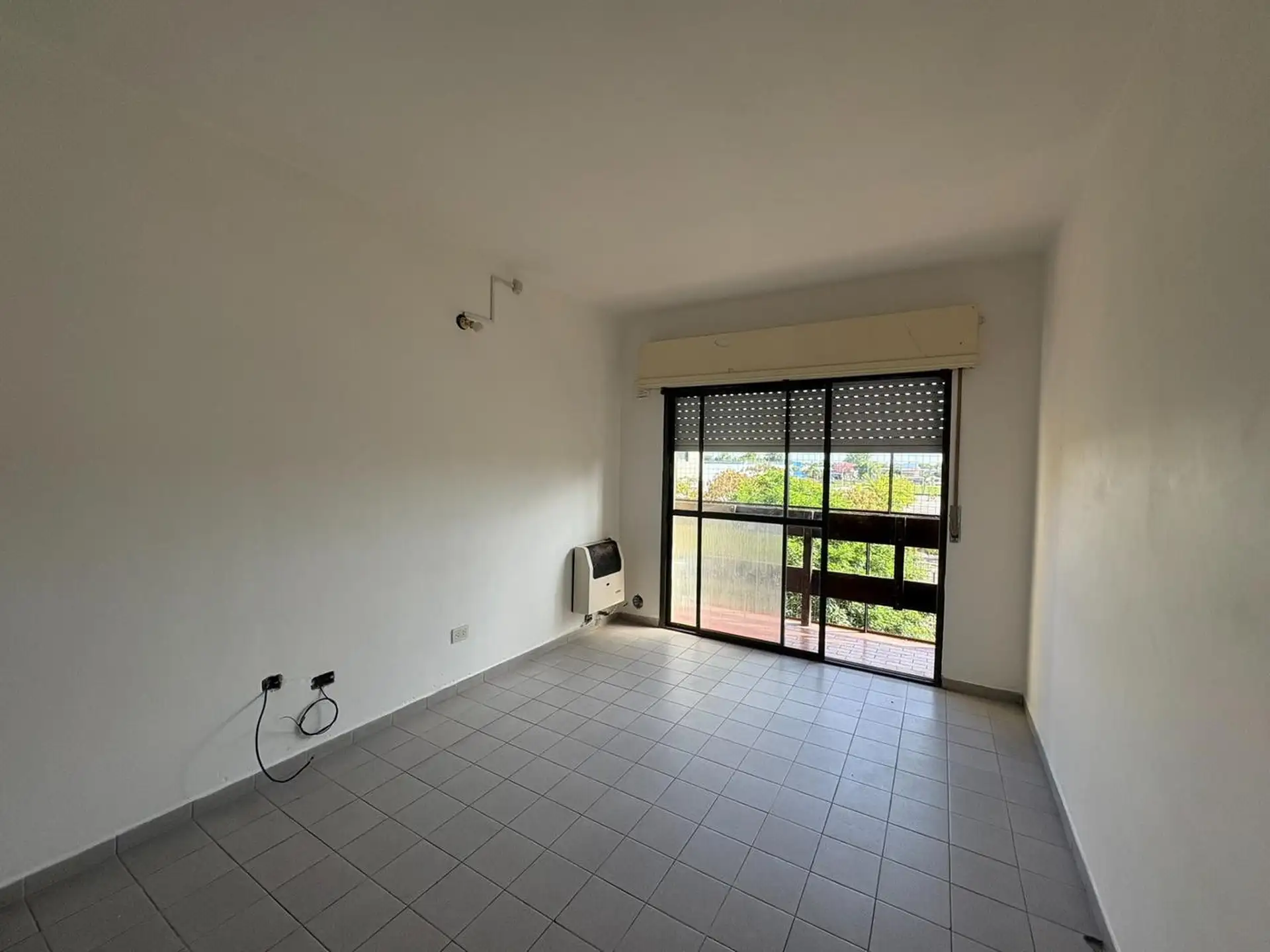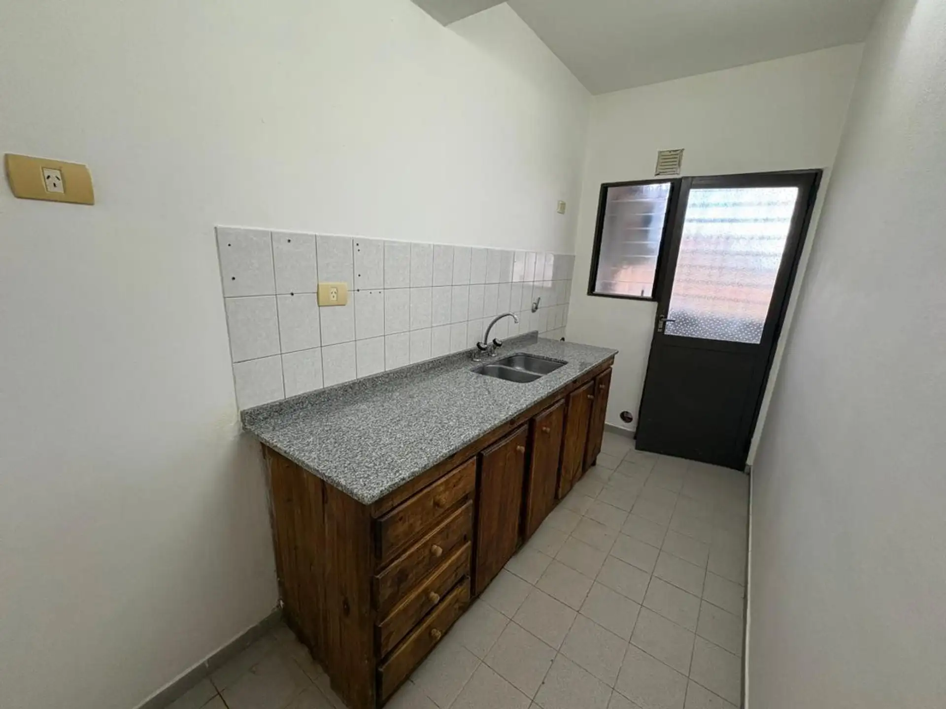 Two-bedroom apartment in the Complejo Petroleros on Calle Salk, 3rd floor by stair access. It has a living-dining room with a balcony, a separate kitchen with lower cabinets (bajomesada), and a full bathroom. The complex includes storage for 1 vehicle.