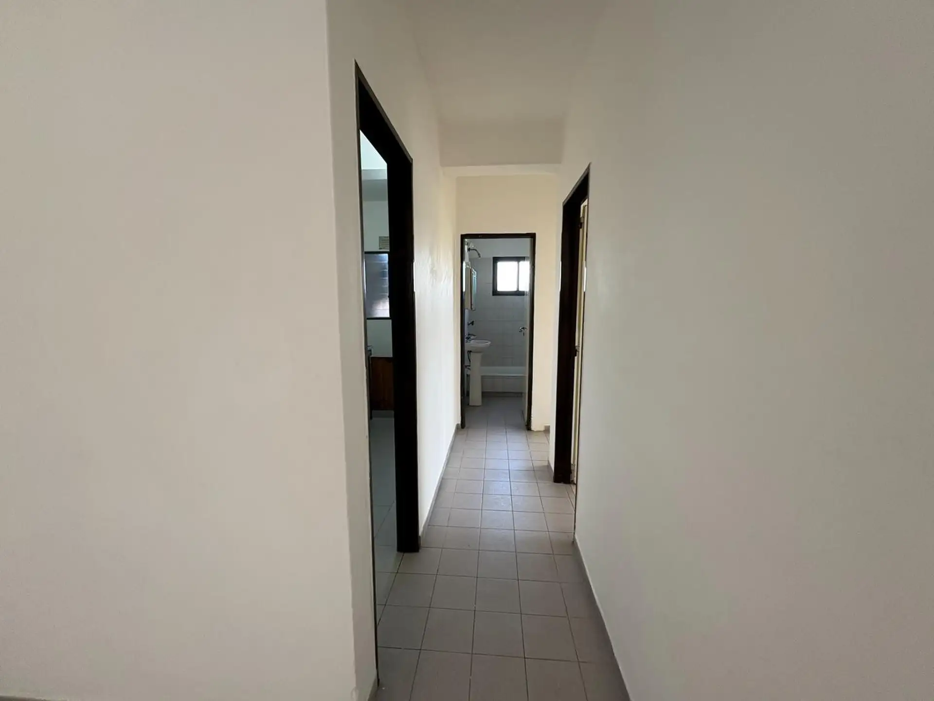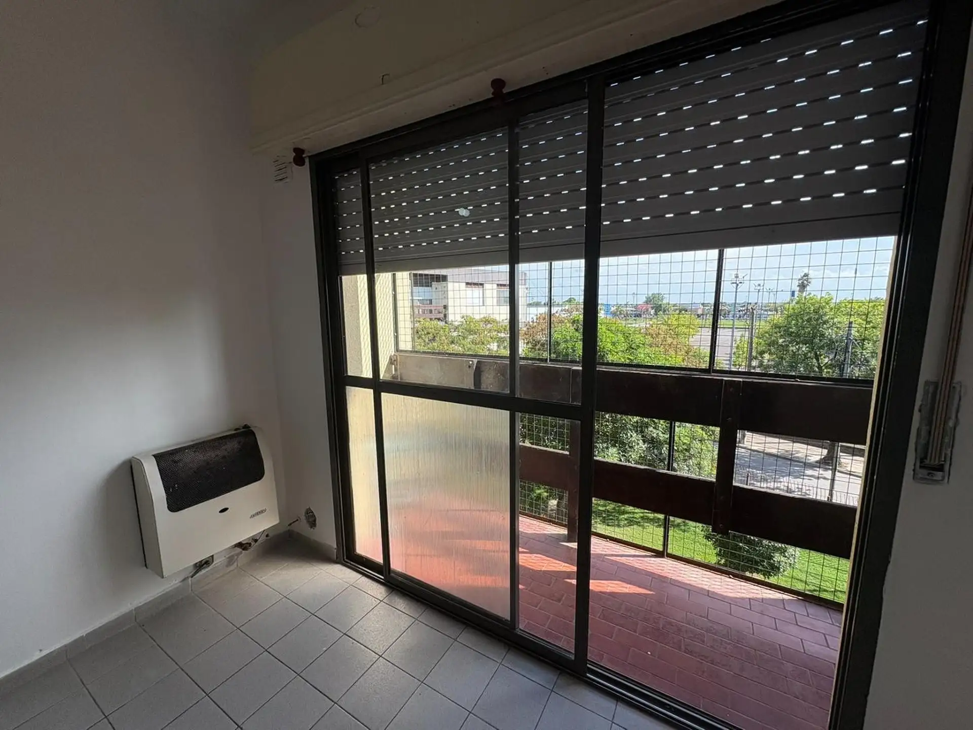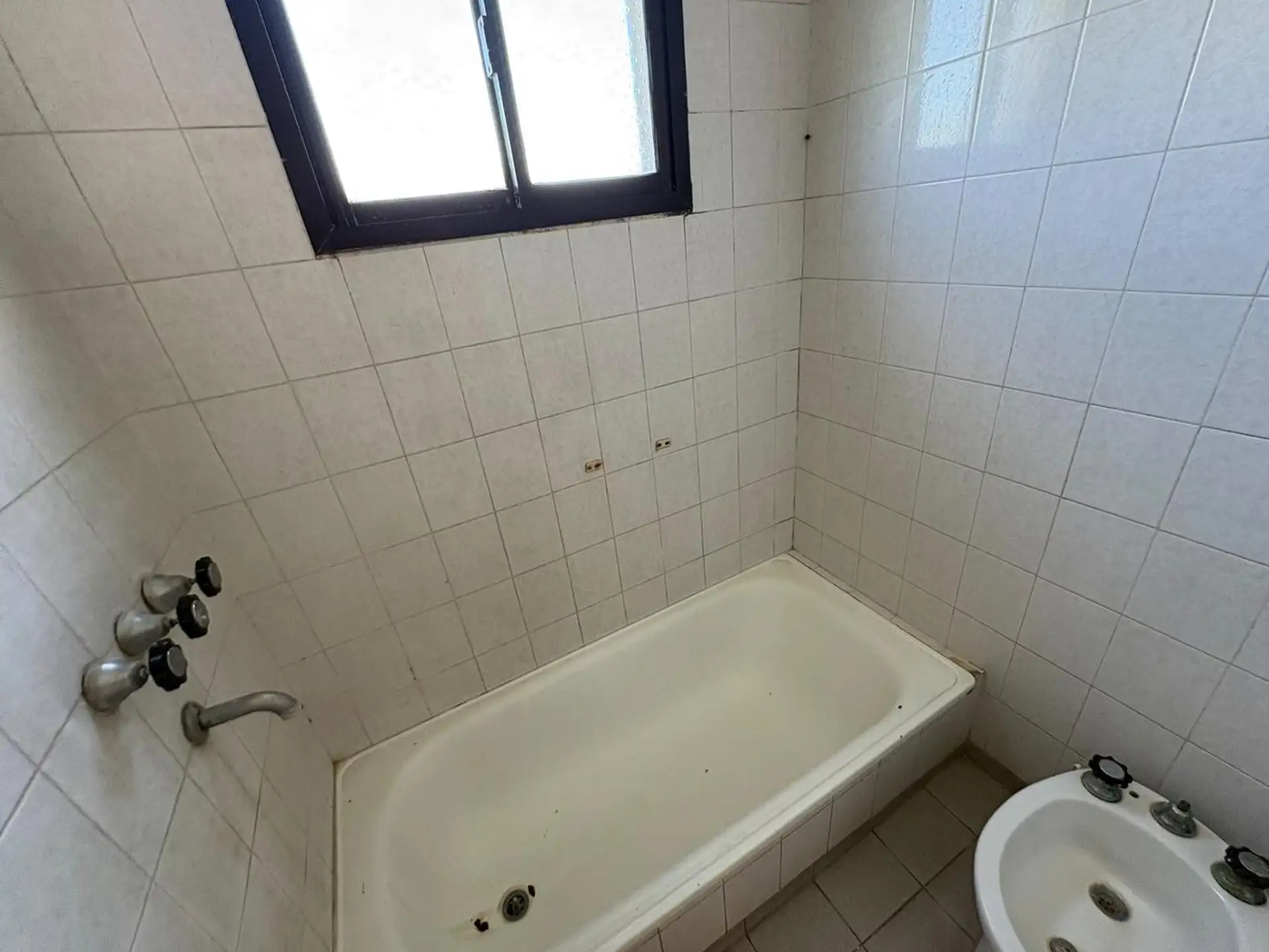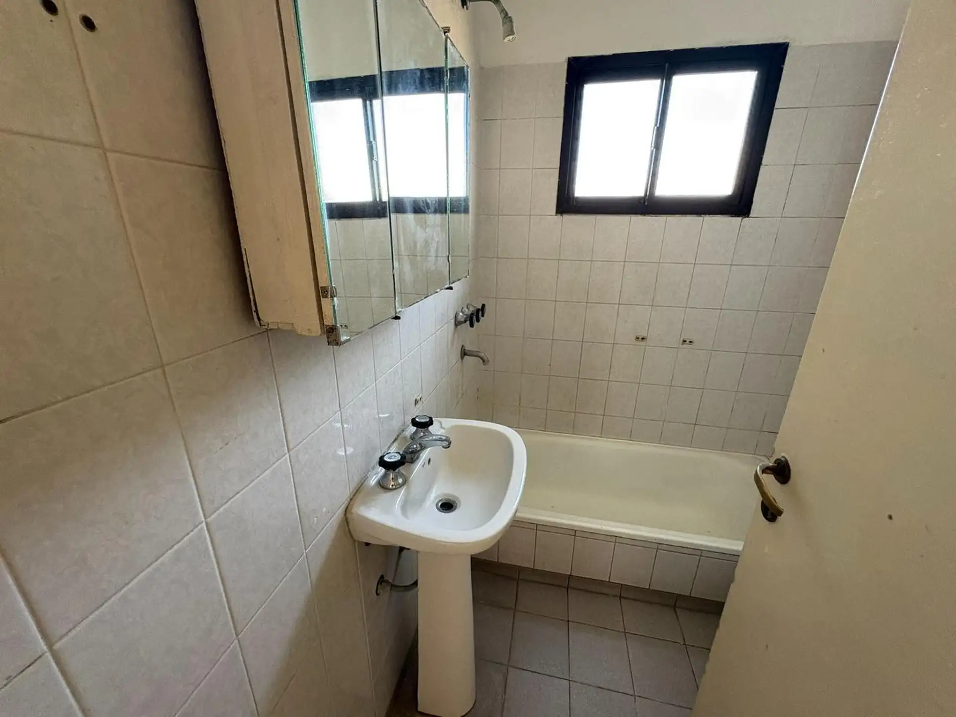 Two-bedroom apartment in the Complejo Petroleros on Calle Salk, 3rd floor by stair access. It has a living-dining room with a balcony, a separate kitchen with lower cabinets (bajomesada), and a full bathroom. The complex includes storage for 1 vehicle.