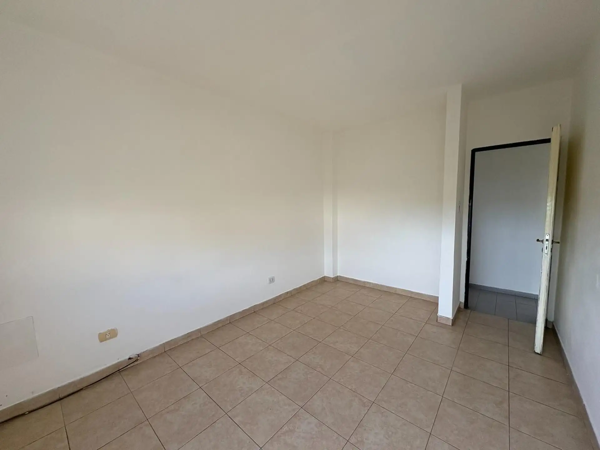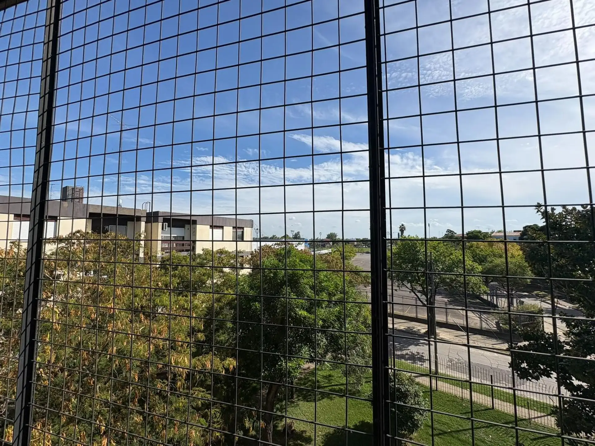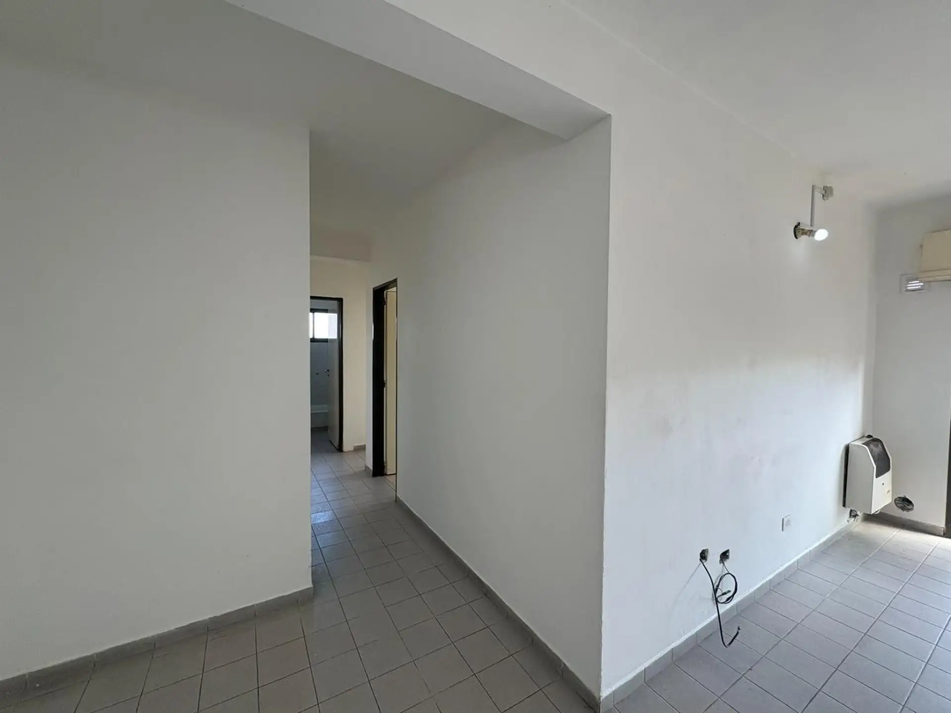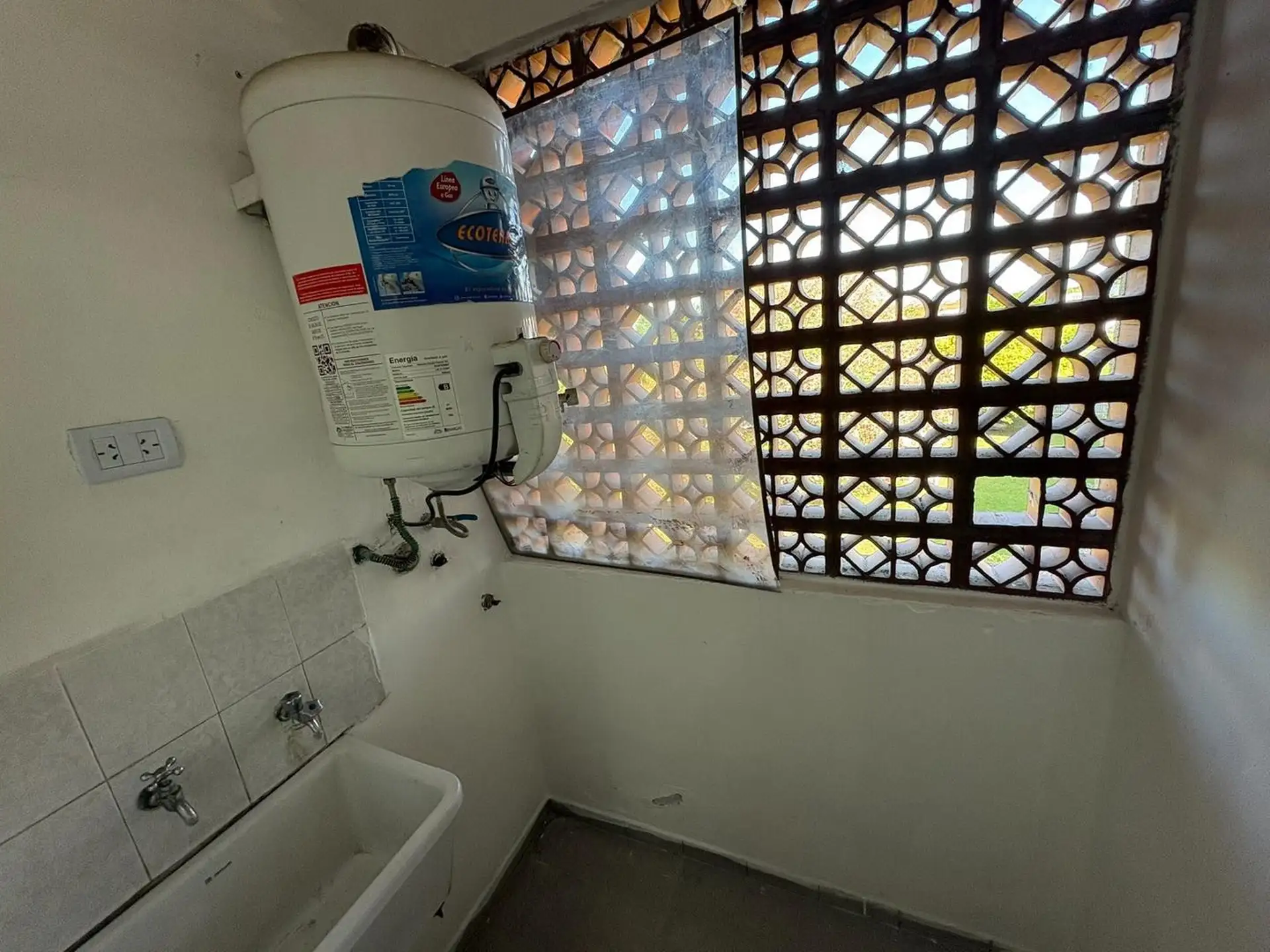 Two-bedroom apartment in the Complejo Petroleros on Calle Salk, 3rd floor by stair access. It has a living-dining room with a balcony, a separate kitchen with lower cabinets (bajomesada), and a full bathroom. The complex includes storage for 1 vehicle.