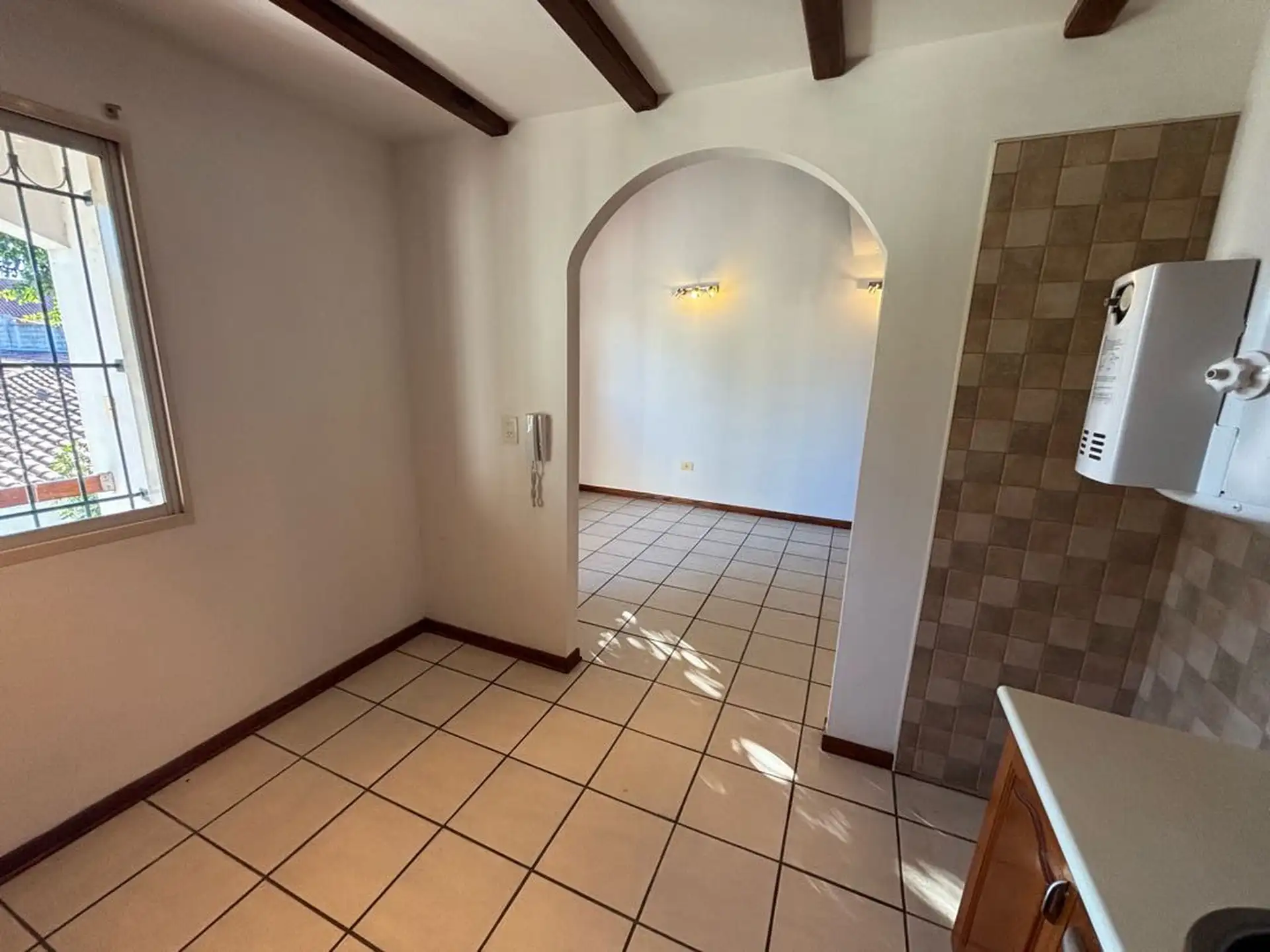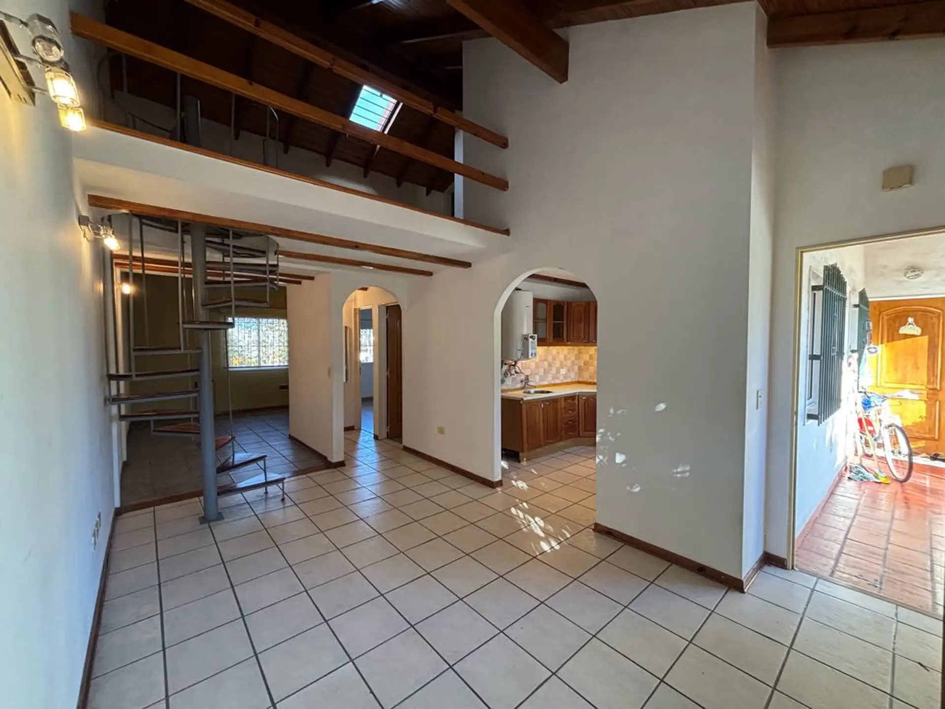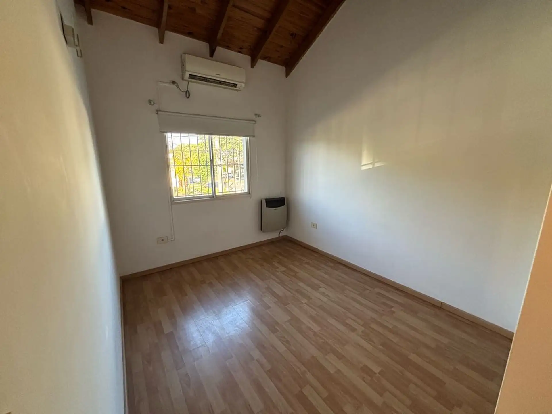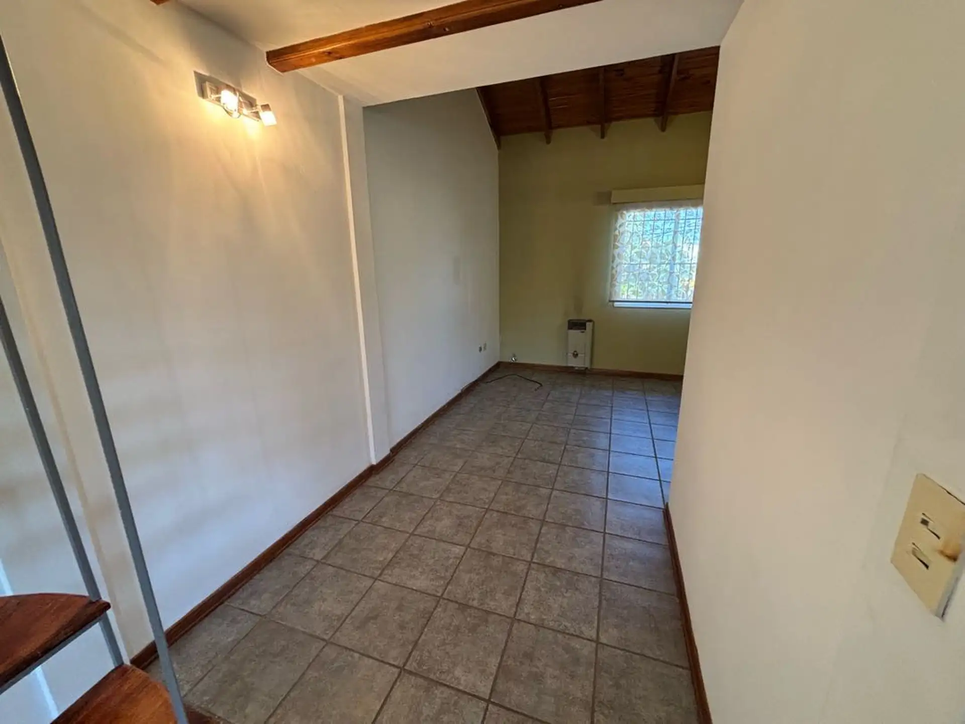 Three-room house-style apartment in the Las Casas Blancas Mediterráneas complex, Perón 635, with pool and amenities. Single-storey layout with a loft level: living-dining room, separate kitchen, a full bathroom and a bedroom with built-in wardrobe on the main floor; the second bedroom is on the upper loft with an en-suite bathroom. The complex has assigned parking, a laundry area, a covered gallery with a grill, a pool and a children’s play area.