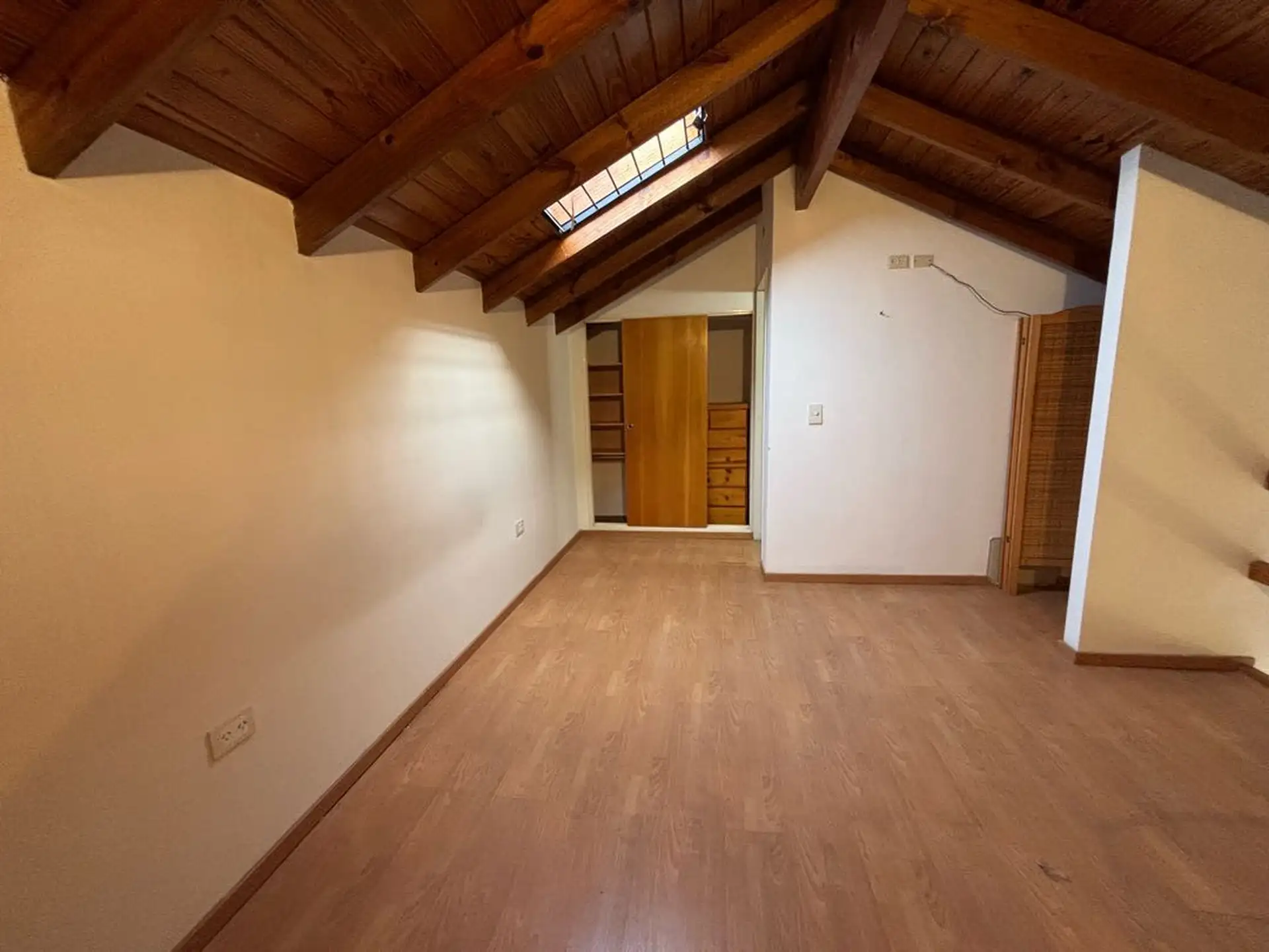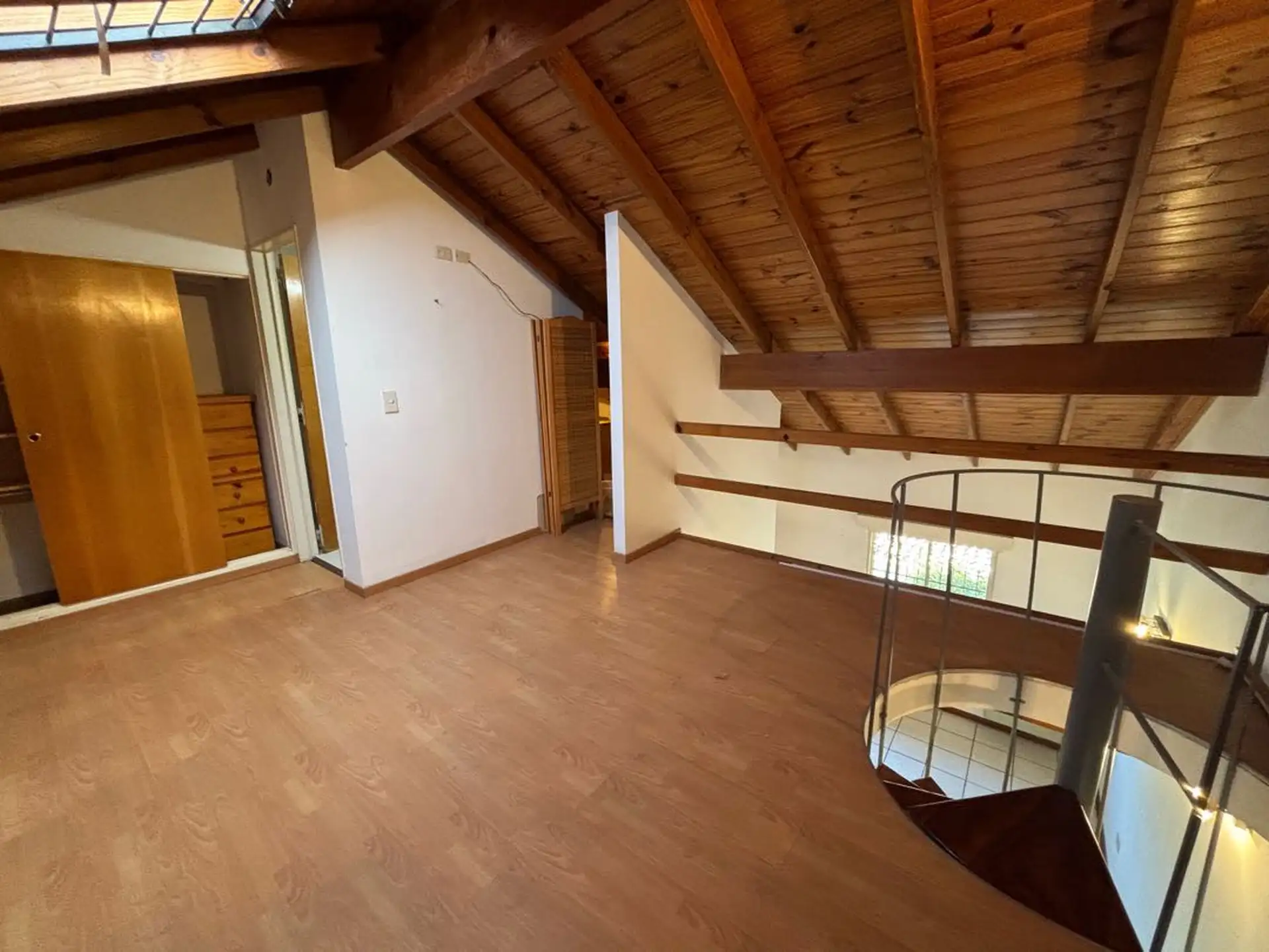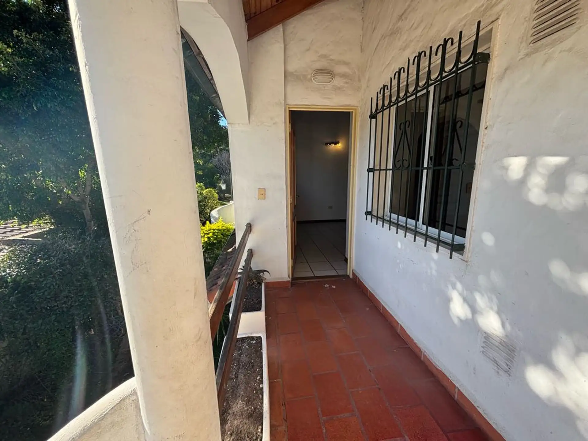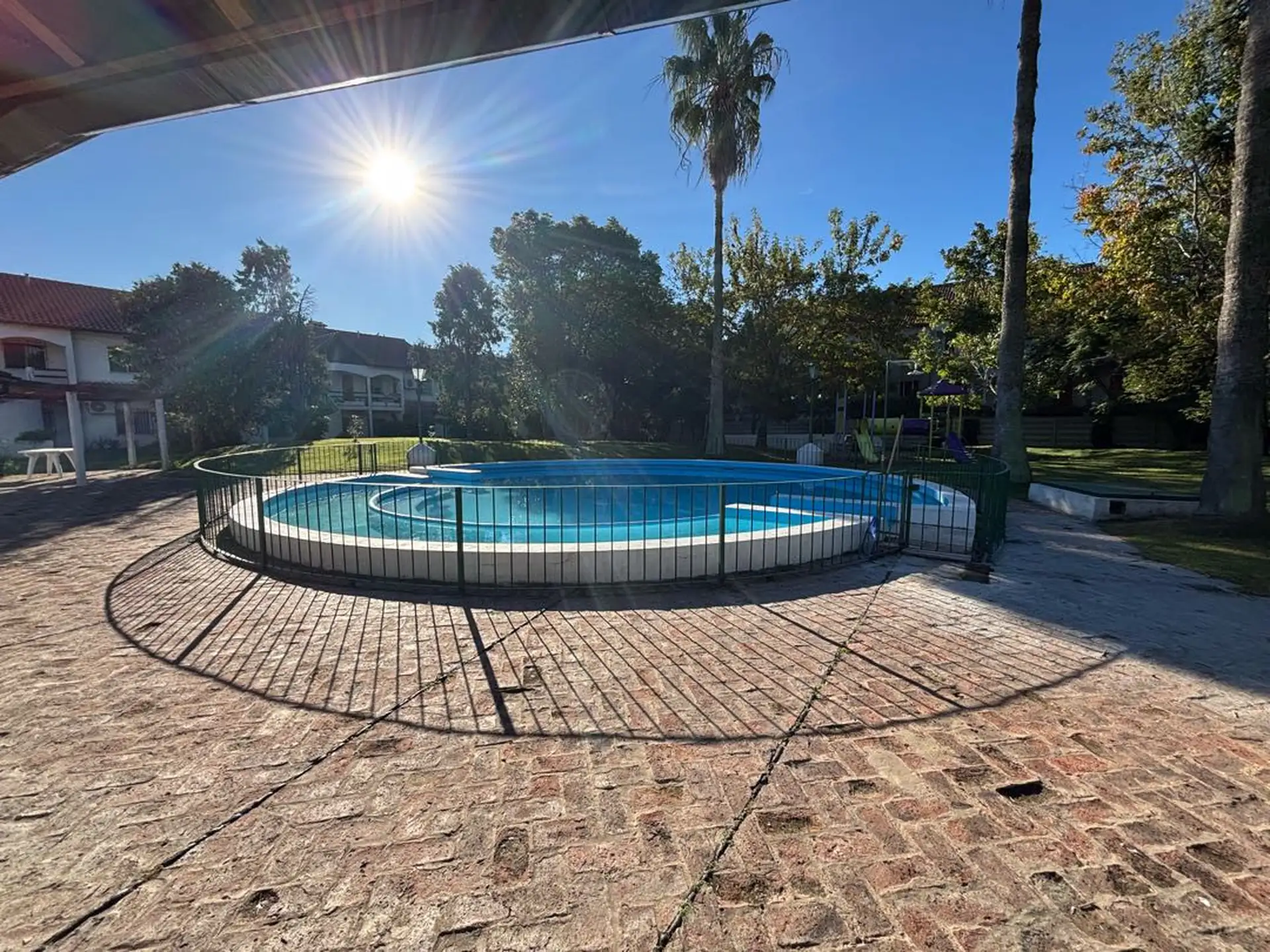 Three-room house-style apartment in the Las Casas Blancas Mediterráneas complex, Perón 635, with pool and amenities. Single-storey layout with a loft level: living-dining room, separate kitchen, a full bathroom and a bedroom with built-in wardrobe on the main floor; the second bedroom is on the upper loft with an en-suite bathroom. The complex has assigned parking, a laundry area, a covered gallery with a grill, a pool and a children’s play area.