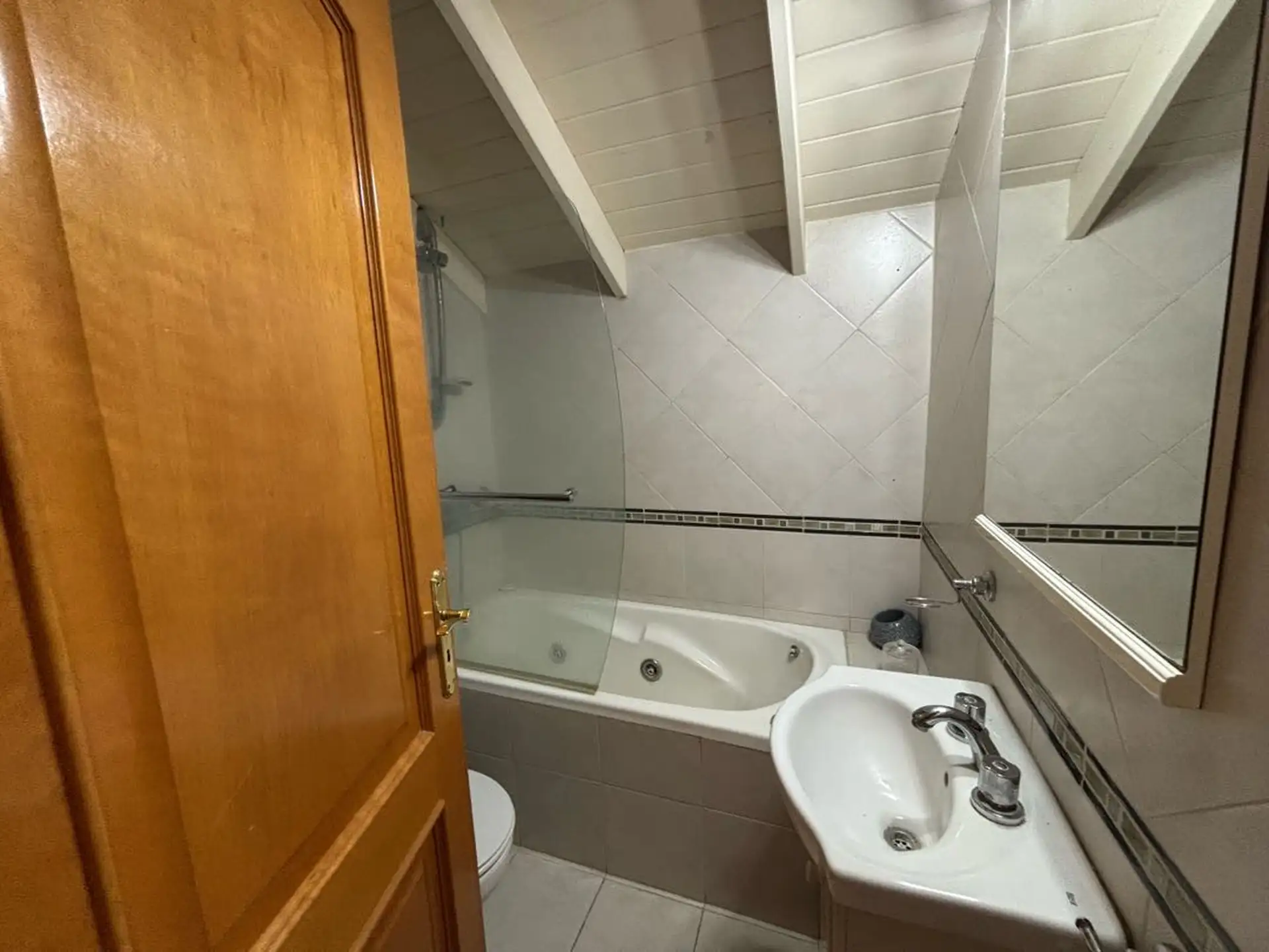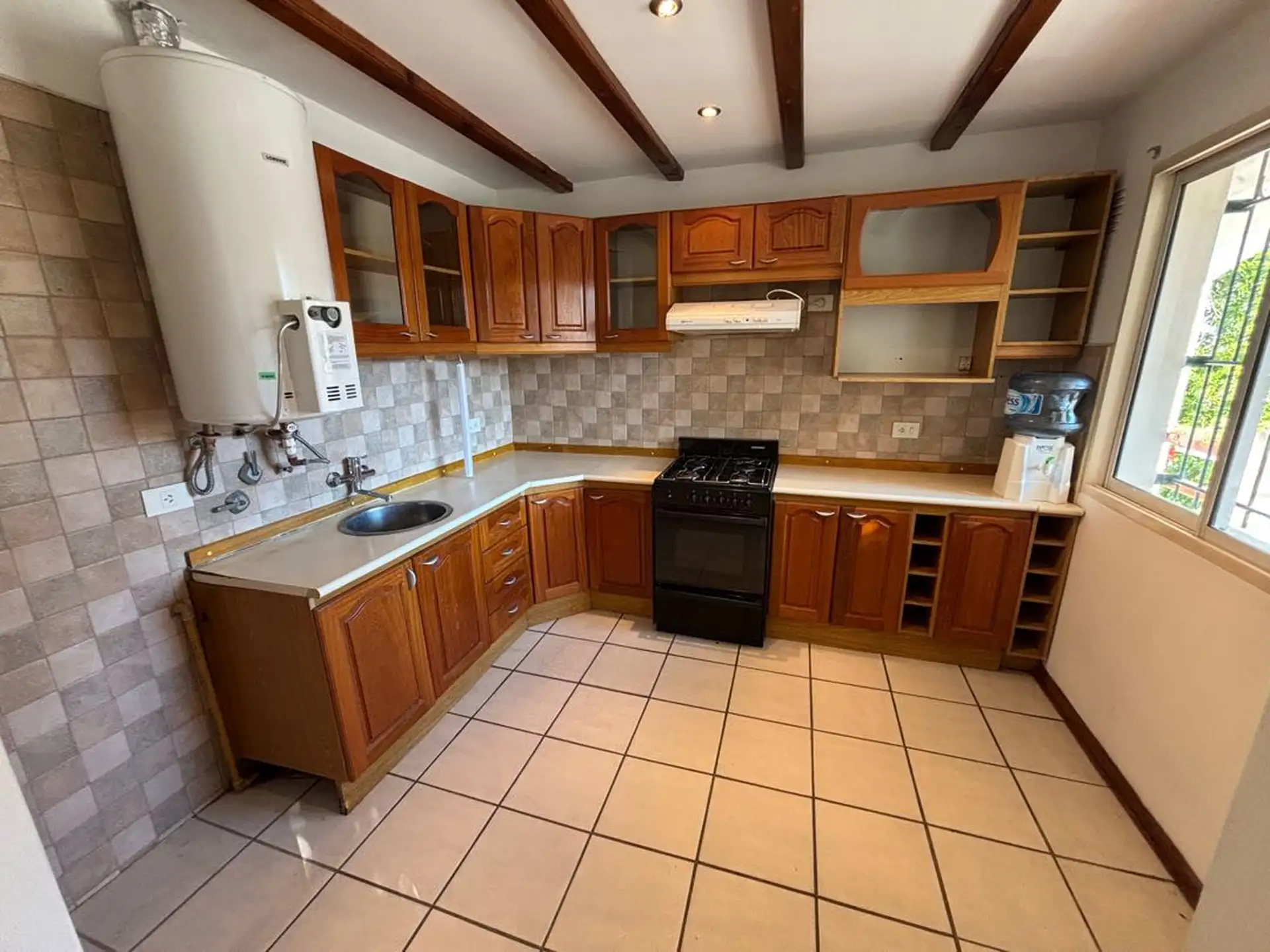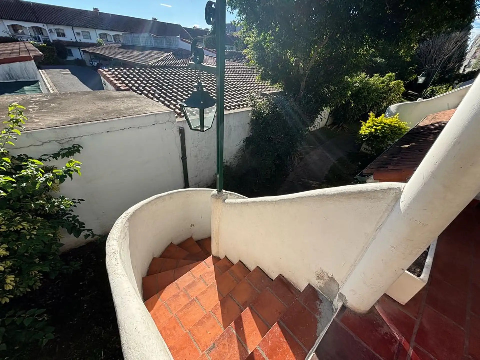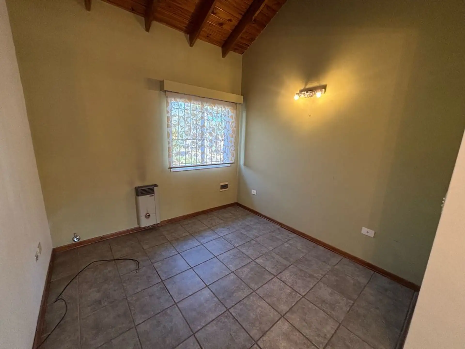Three-room house-style apartment in the Las Casas Blancas Mediterráneas complex, Perón 635, with pool and amenities. Single-storey layout with a loft level: living-dining room, separate kitchen, a full bathroom and a bedroom with built-in wardrobe on the main floor; the second bedroom is on the upper loft with an en-suite bathroom. The complex has assigned parking, a laundry area, a covered gallery with a grill, a pool and a children’s play area.