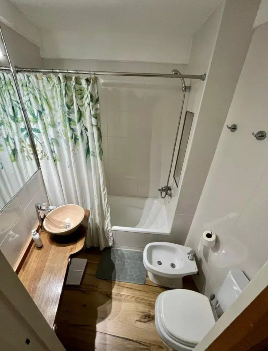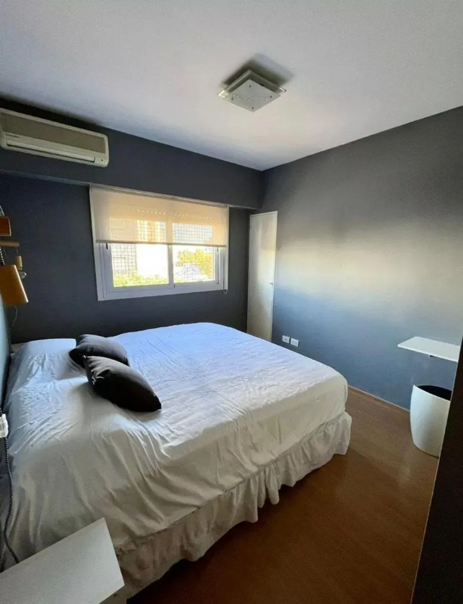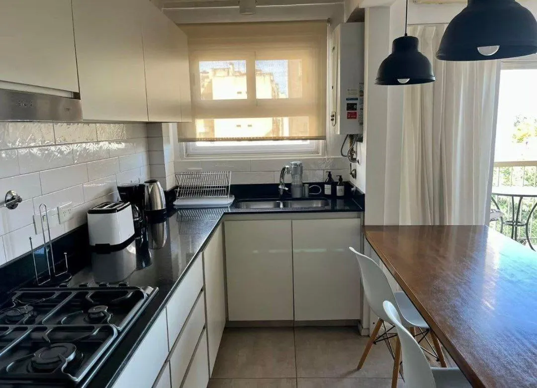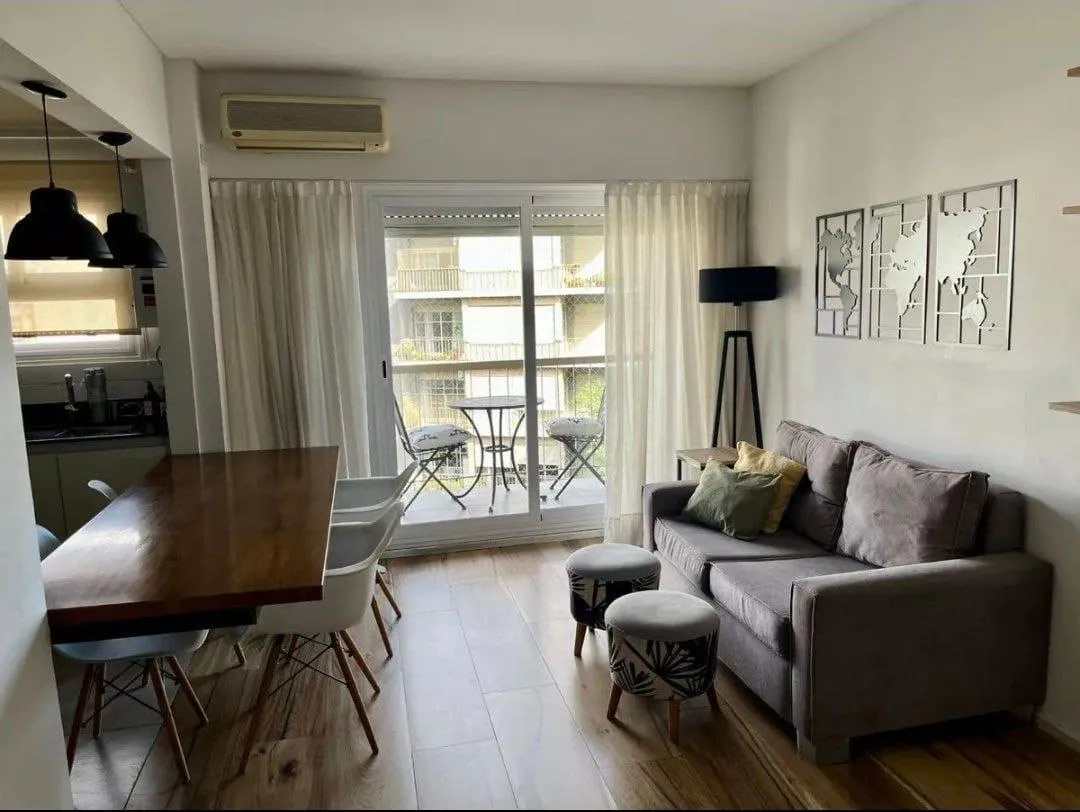 Furnished three-room apartment of 60 m² in Chacarita with a balcony. The unit has air conditioning (hot/cold) in the living room and the main bedroom, a kitchen with a 4-burner stove, and appliances including a fridge and microwave, plus an electric kettle, coffee maker and toaster. It includes a dining table for 4, a double bed with a fitted wardrobe, a full bathroom with a bathtub, and is available from 25 March. Building fees are included in the monthly price; the listing specifies a light-us