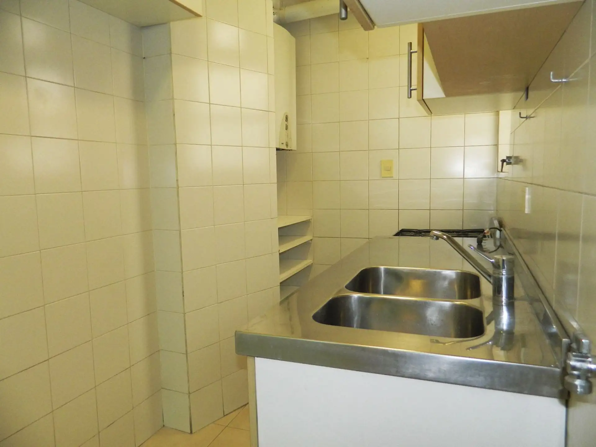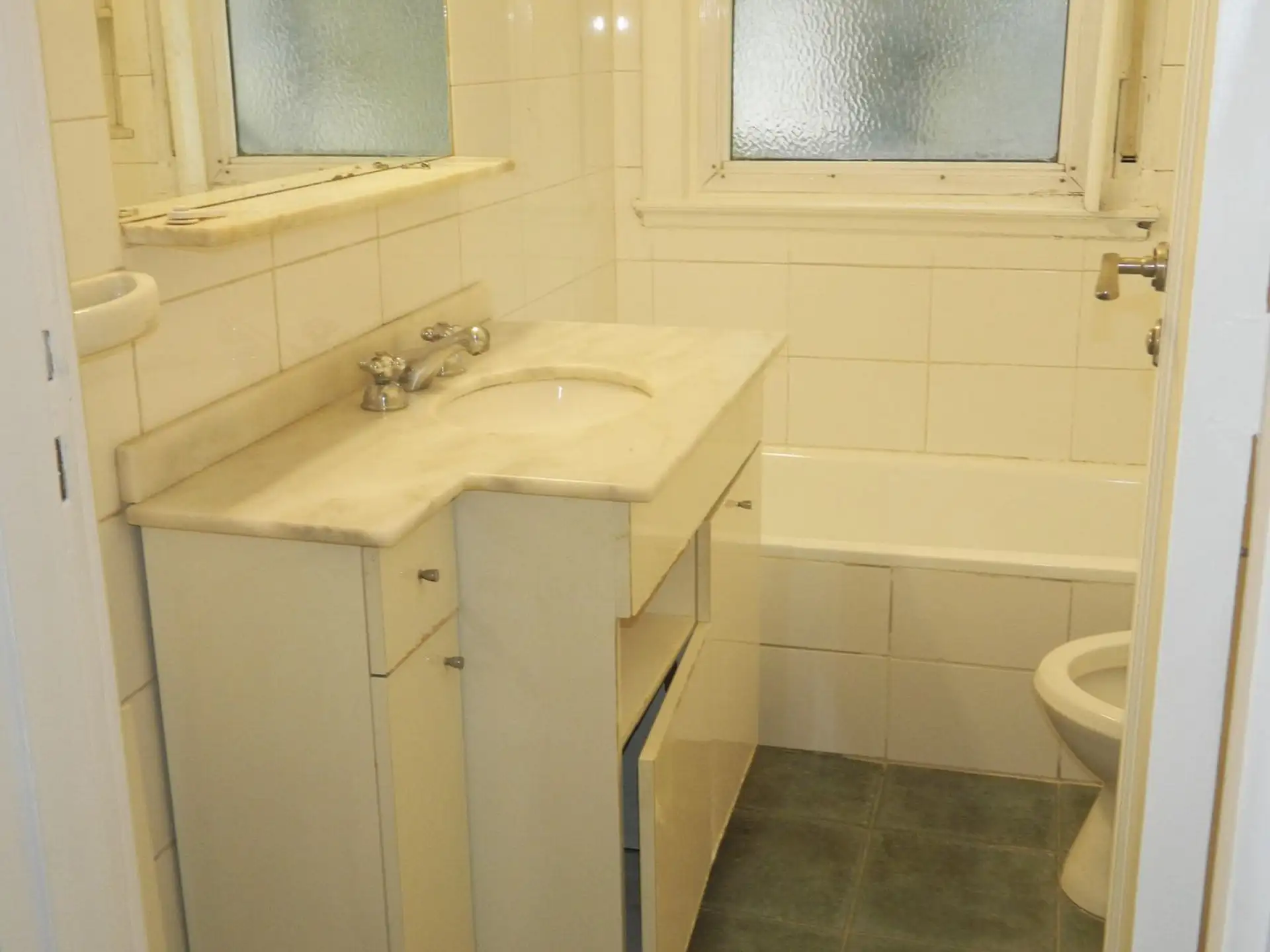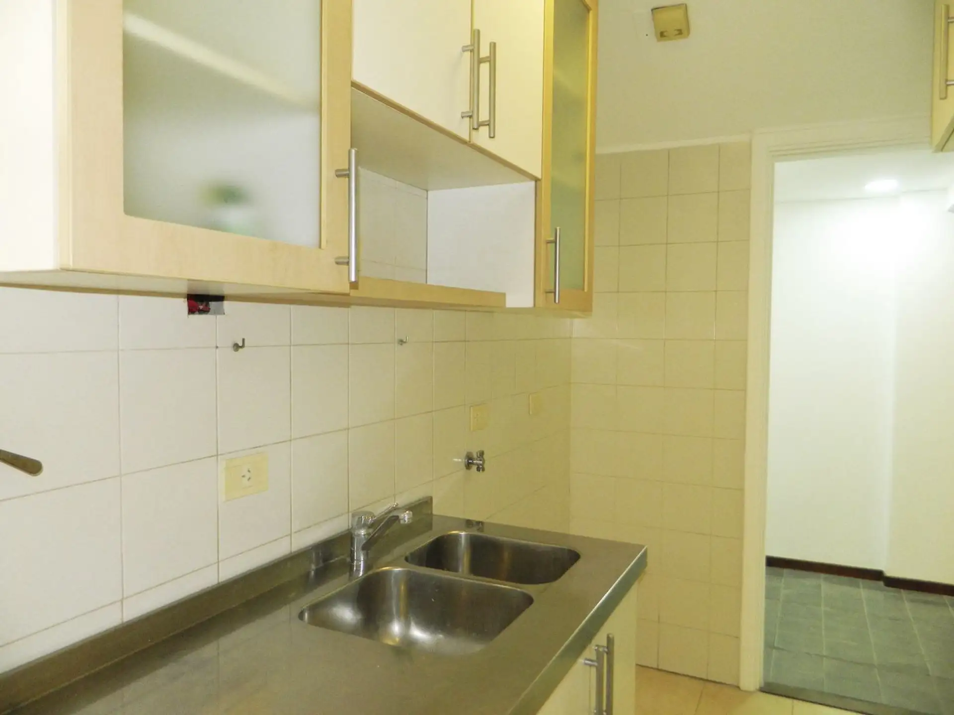 Three-room apartment with 2 bedrooms in Colegiales, reached by stairs. Living-dining room and a renovated kitchen with an integrated laundry area. Each bedroom has a built-in wardrobe, plus a full bathroom with vanity.