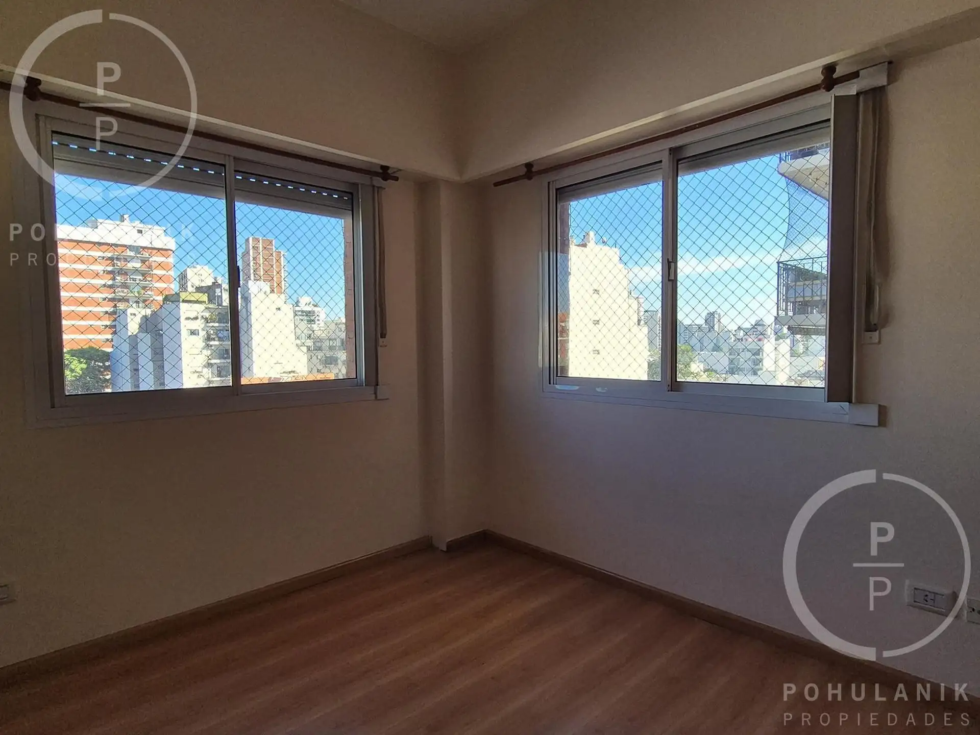 Three-room apartment for rent in Colegiales. The unit includes a reception hall with closet, living-dining room, separate kitchen with connection for a washer-dryer, two bedrooms with built-in wardrobes (one opens to a balcony), and a full-width balcony overlooking the street. Gas cooking, hot-water heater (calefón), balanced-draft stoves for heating in all rooms, and air conditioning in the living-dining room. The building offers a patio, laundry (laundry room), communal SUM, and night security