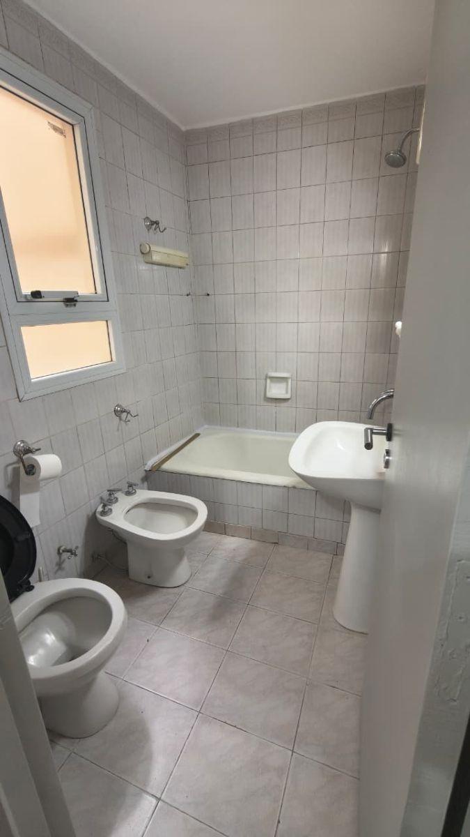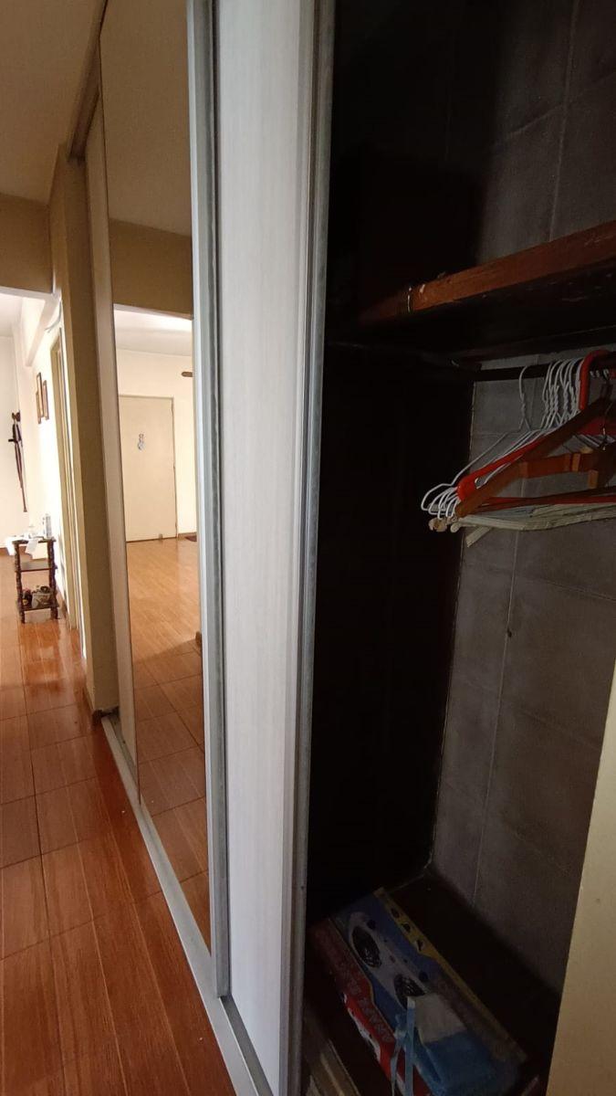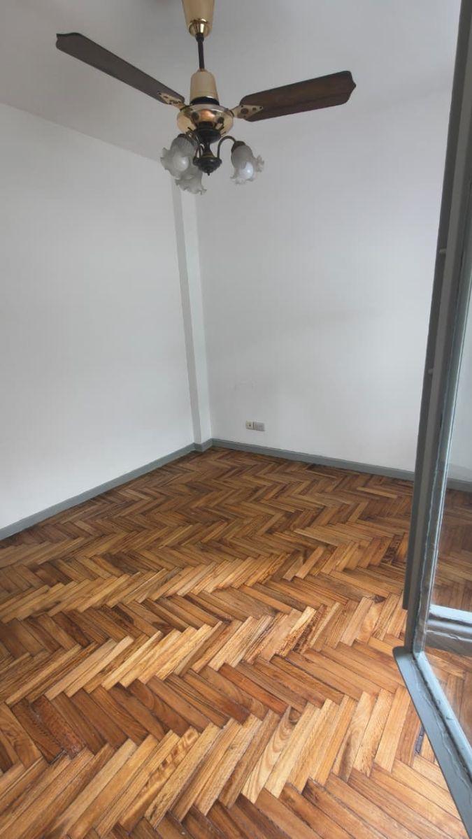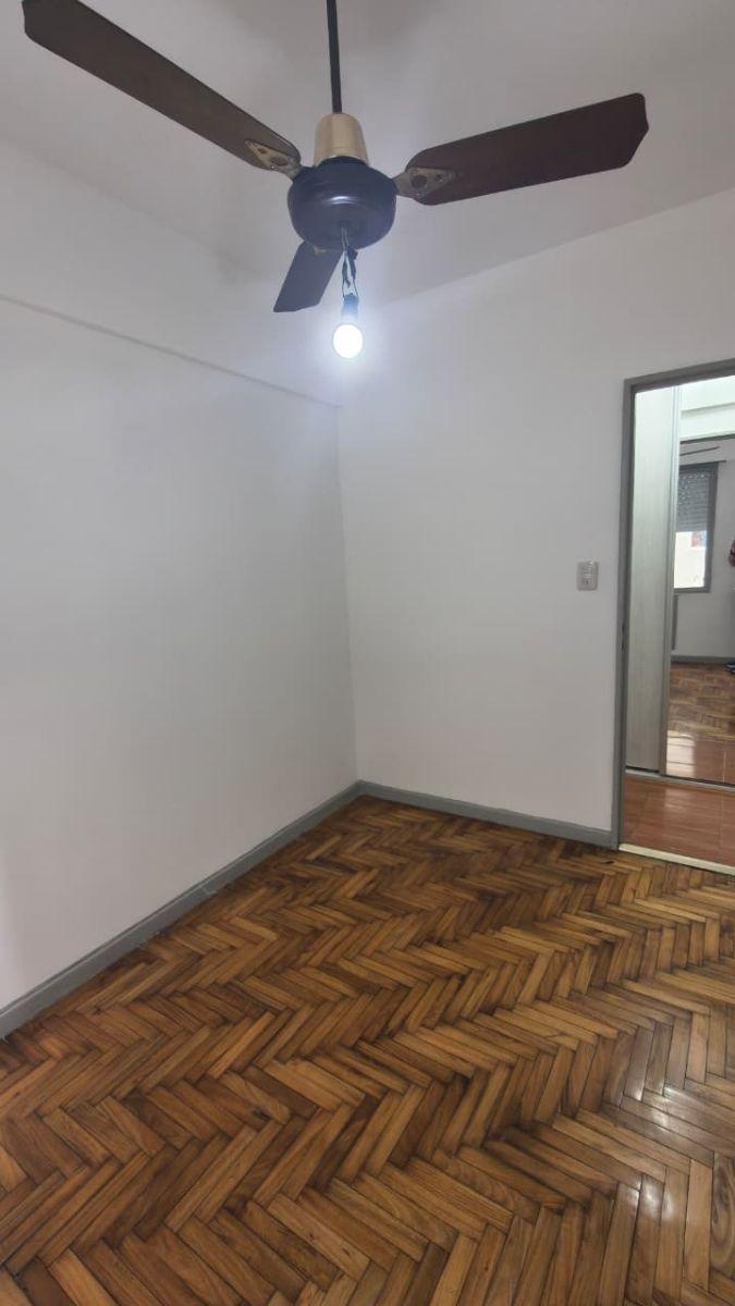 Three-room apartment with a living-dining room measuring 4.00 x 3.00 and ceramic floors. Separate kitchen with full cabinetry, space for a washing machine and a sink, plus a laundry area with a small pool, and two bedrooms measuring 3.30 x 2.90 and 2.90 x 2.25. Distribution hall with a large closet, a full bathroom, and a communal park at the rear (contrafrente).