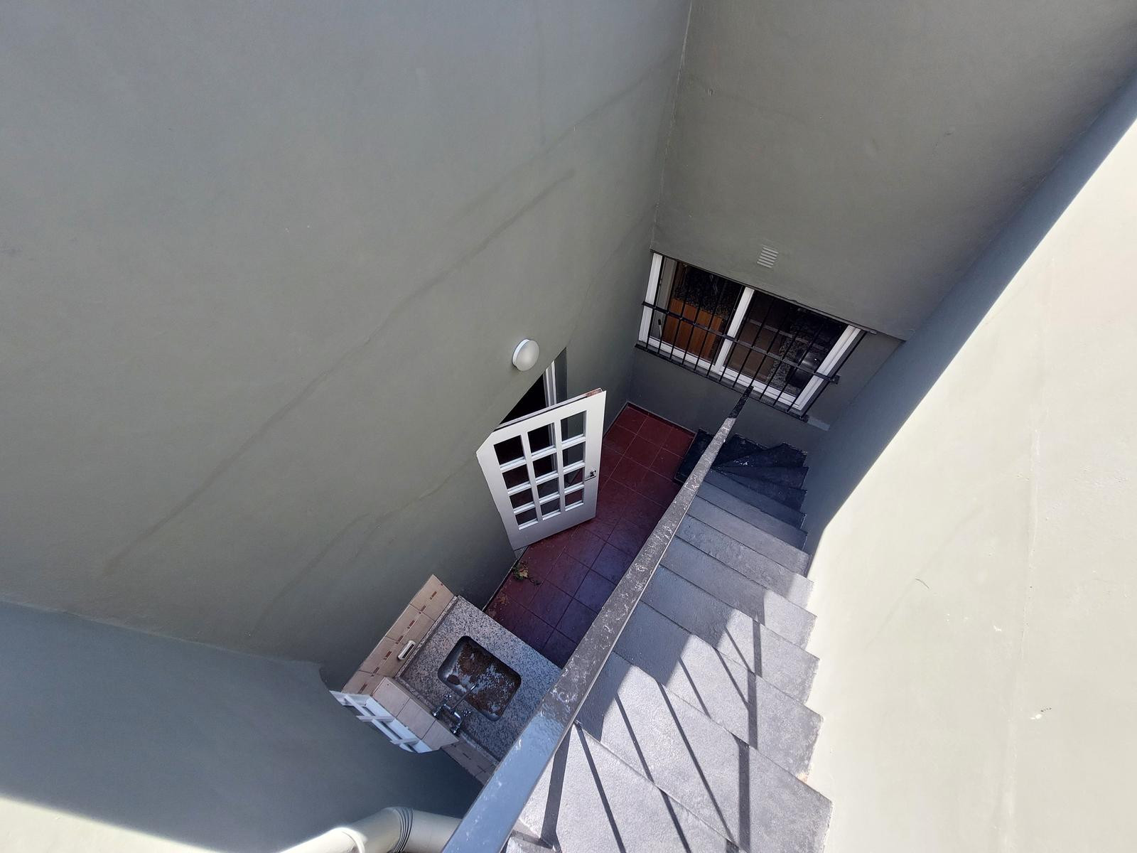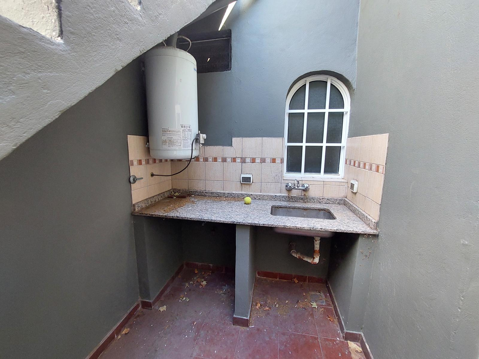 Three-room apartment in the commercial centre of Villa Ballester, on the first floor accessible by stairs. Street-facing unit with a balcony and lighting throughout. It has two bedrooms with built-in wardrobes, a full bathroom, a separate small but well-equipped kitchen, and a living-dining room. There is an in-unit patio with a laundry area and a private terrace. Building fees are described as low (bajas expensas). No pets allowed. The contract duration is 24 months, with increases every 3 mont